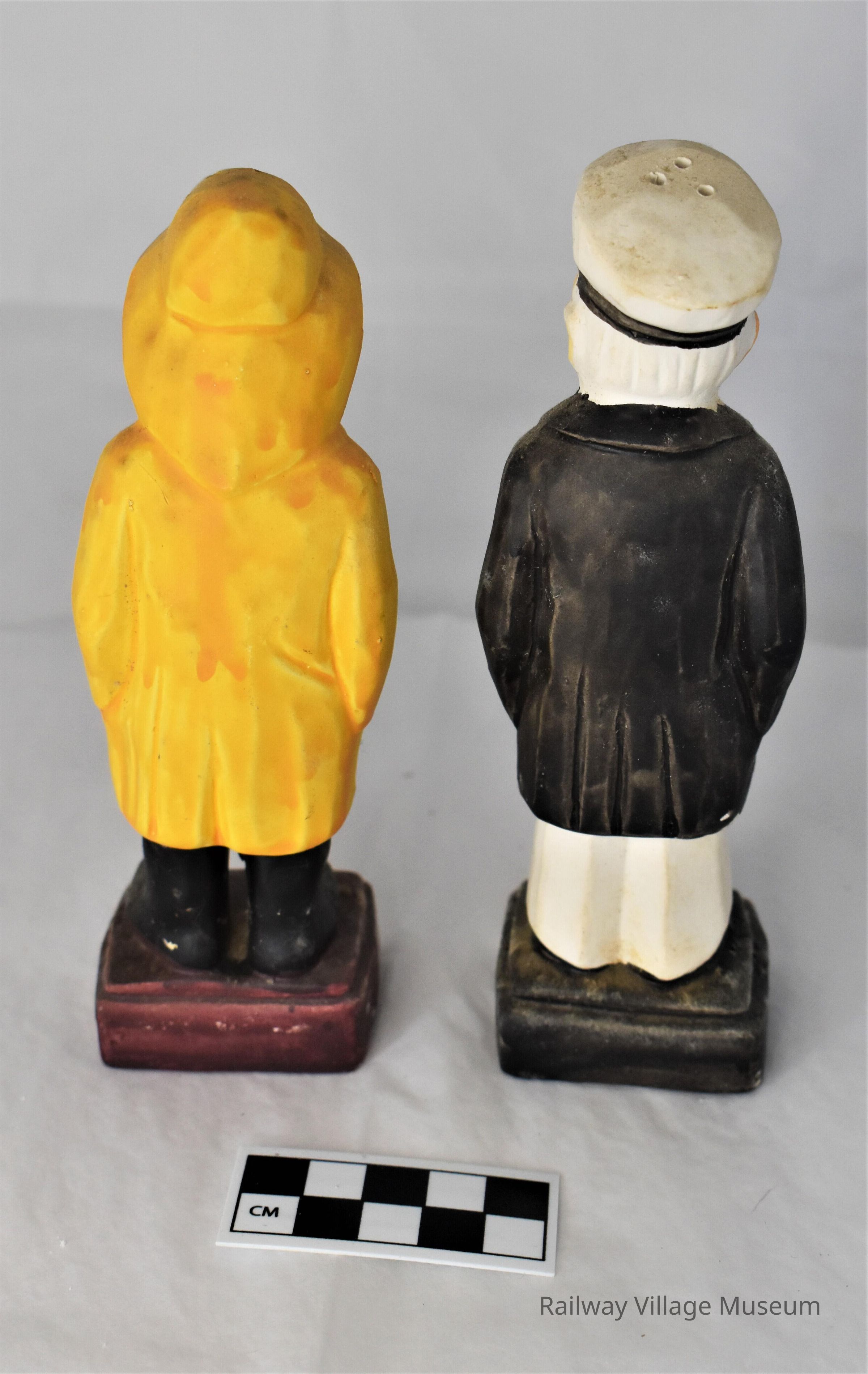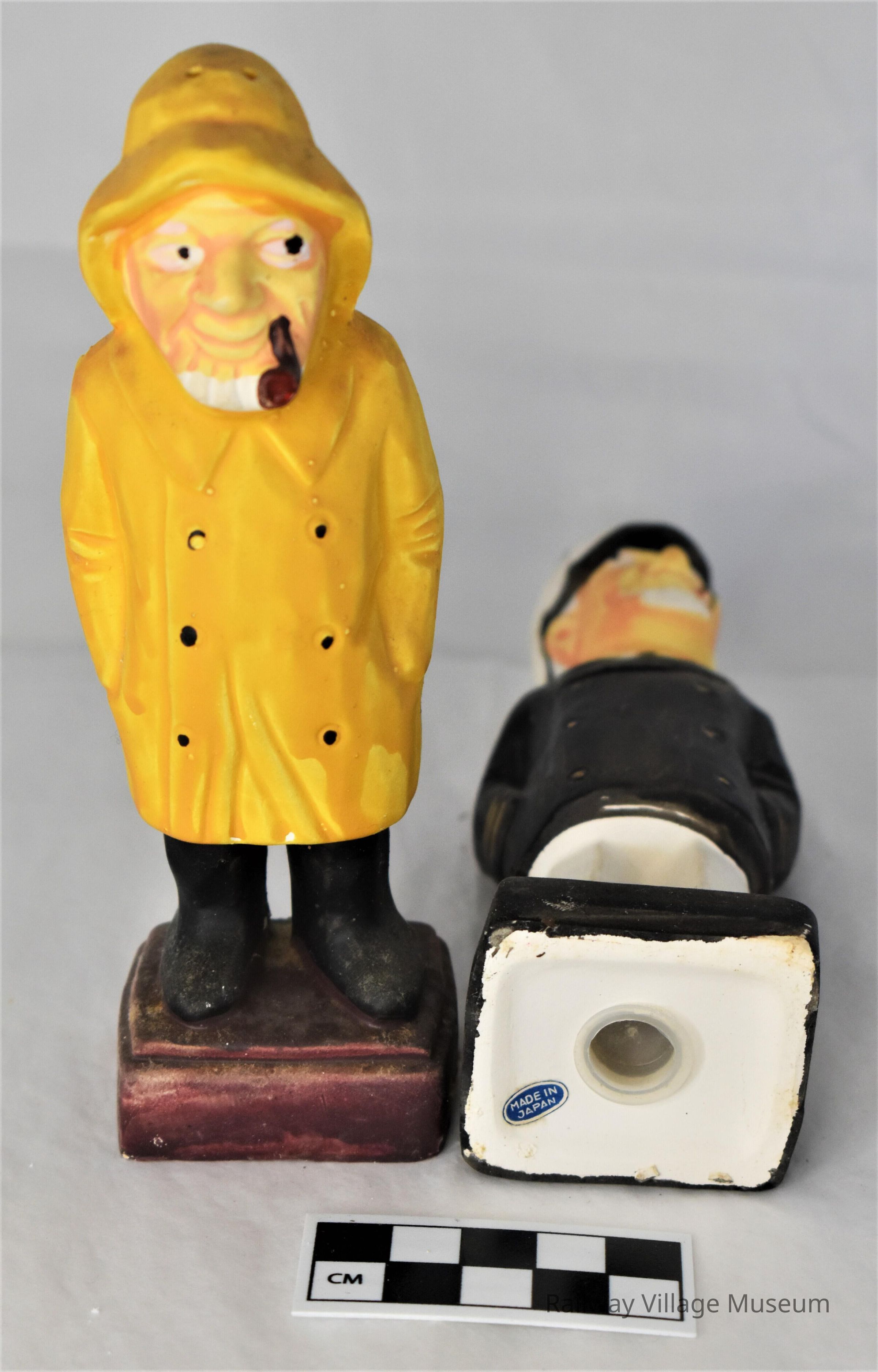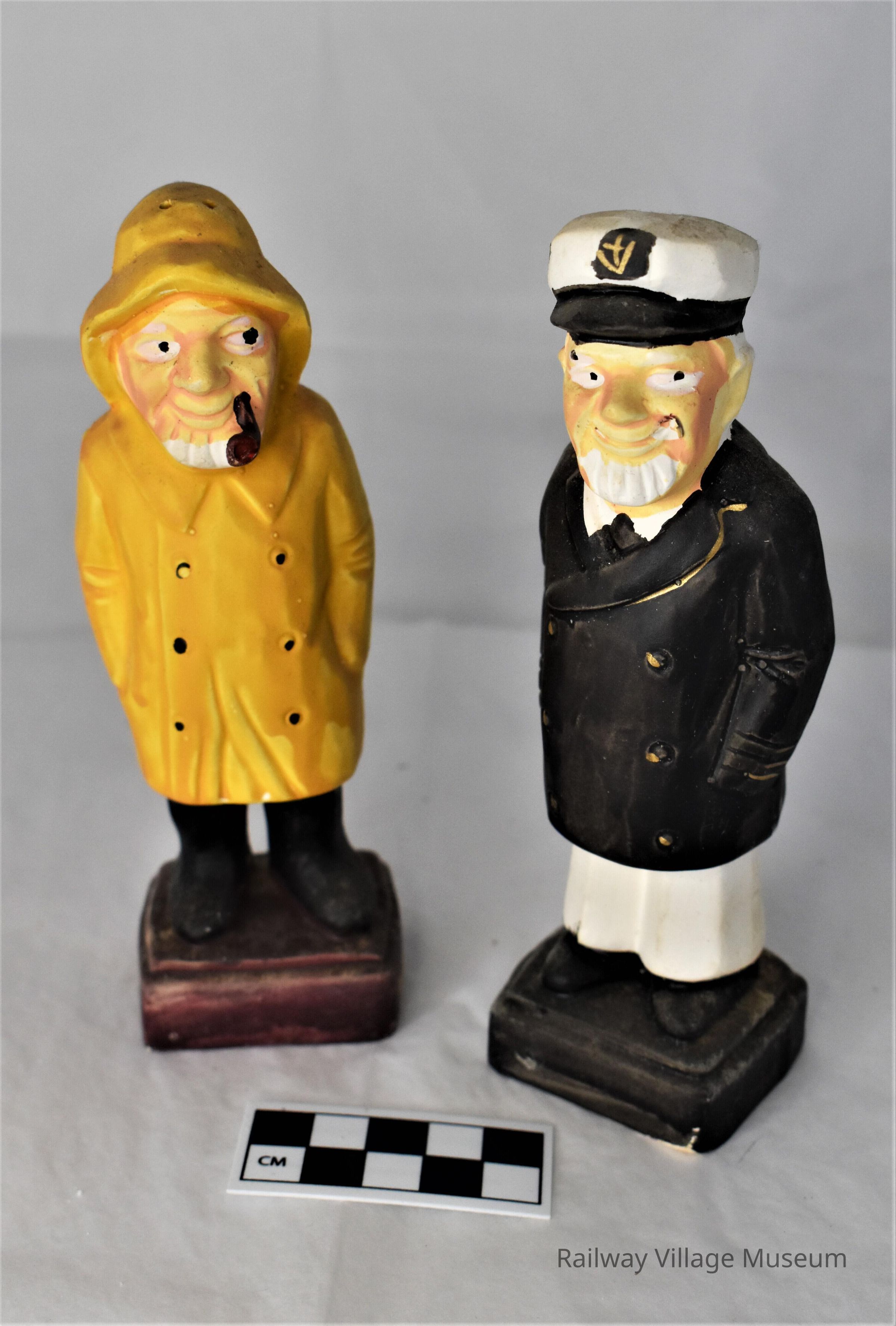 These ceramic figural salt and pepper shakers are often found labeled as "Old Salty" (dressed in yellow fisherman attire) and "Cap'n Pepper" (dressed in ship captain uniform). They are unmarked other than a sticker stating "Japan". The Captain's cigar has broken off.
