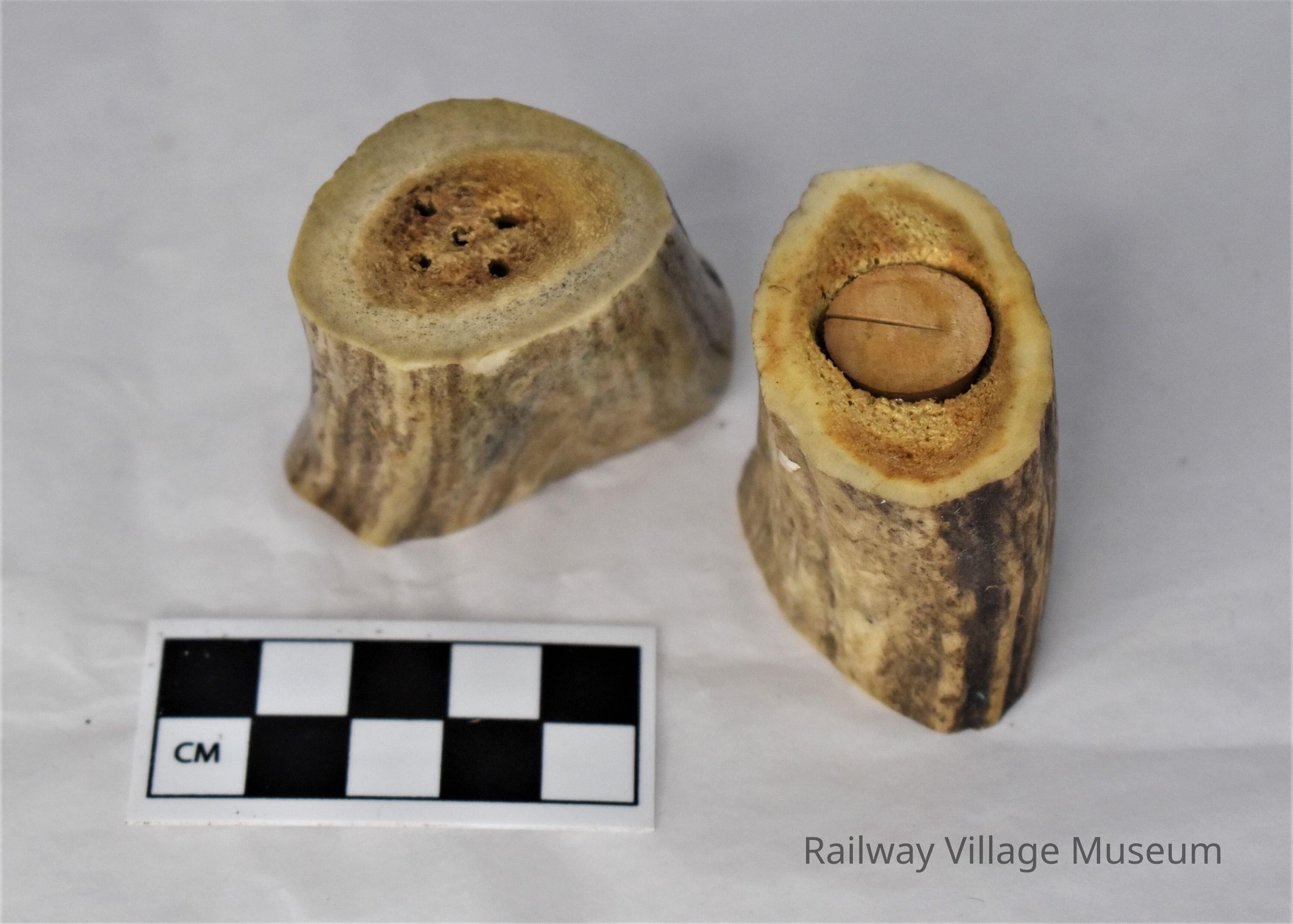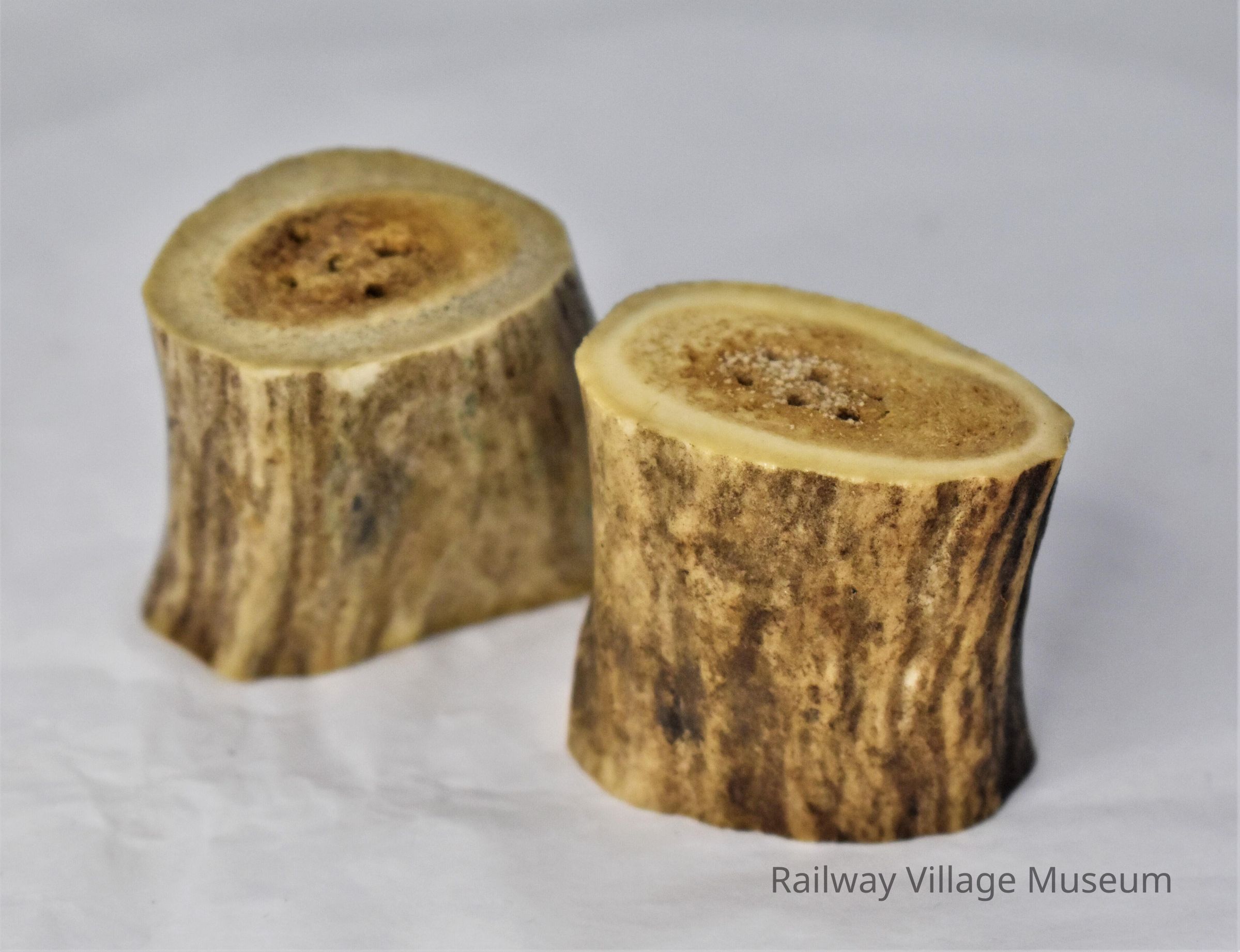 These shakers are hand made from sections of deer antler (likely white-tailed deer). They are unmarked but both have cork stoppers intact.