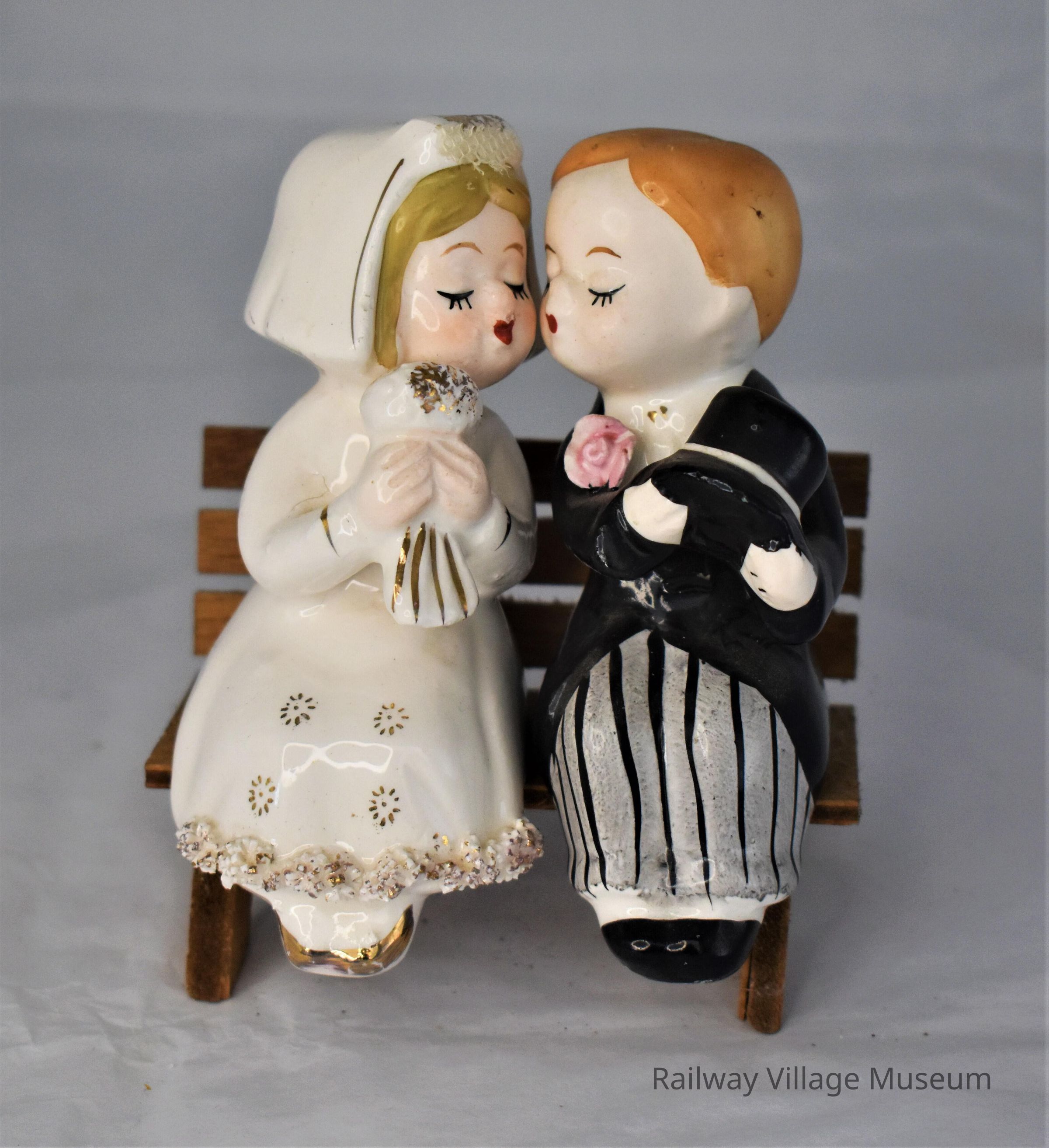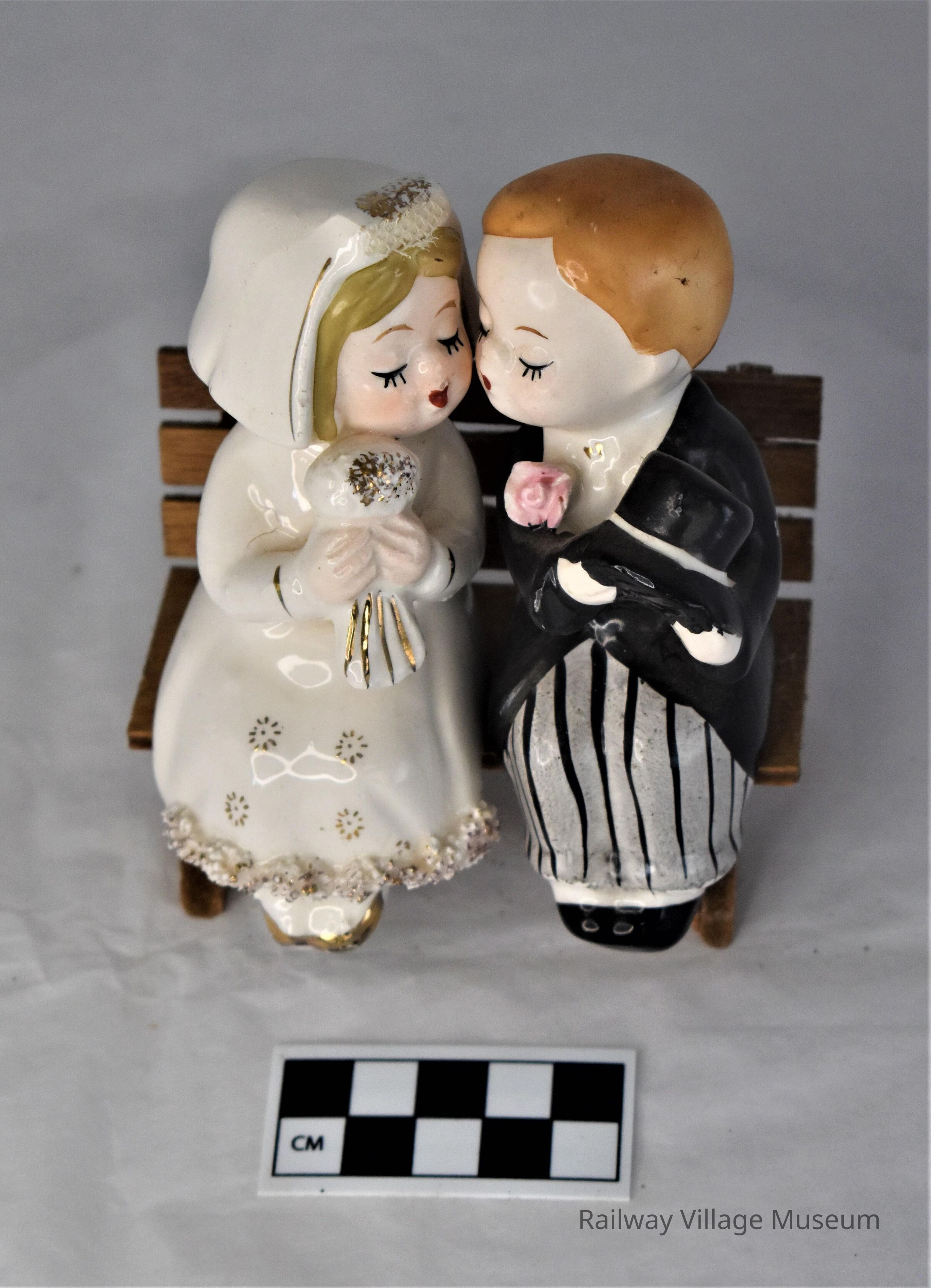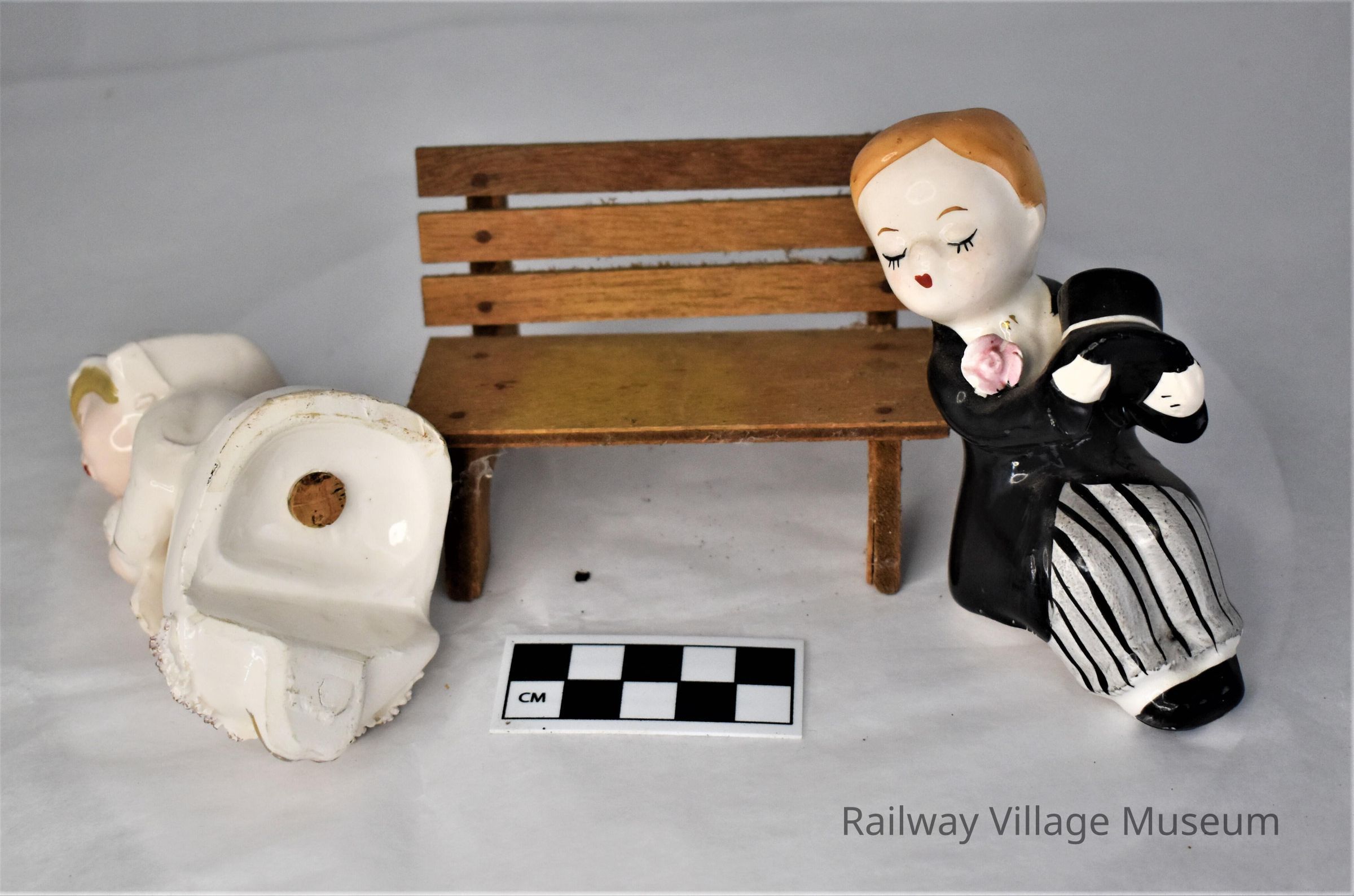 These ceramic bride and groom salt and pepper shakers are sitting upon a small wooden bench in a kissing pose. They are unmarked but likely made in Japan based on research of similar shaker sets. Both shakers have the cork stopper intact.