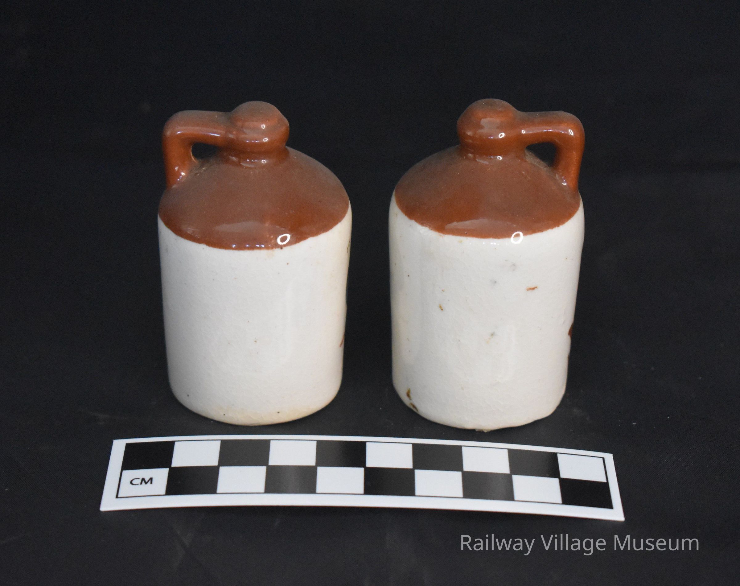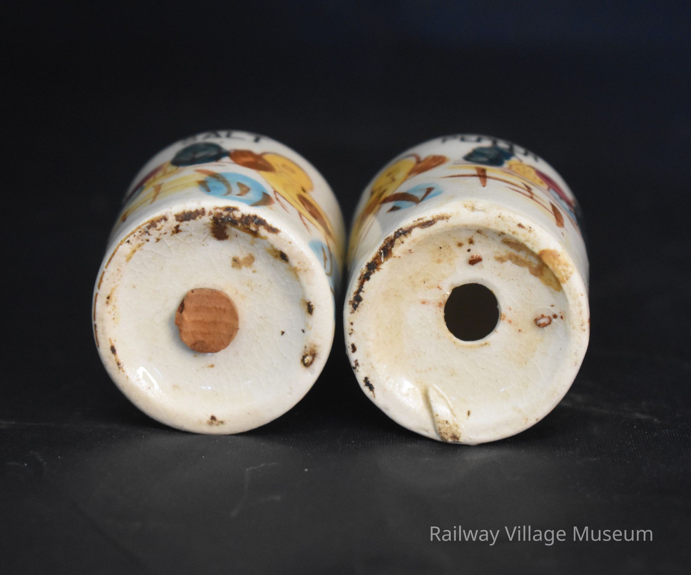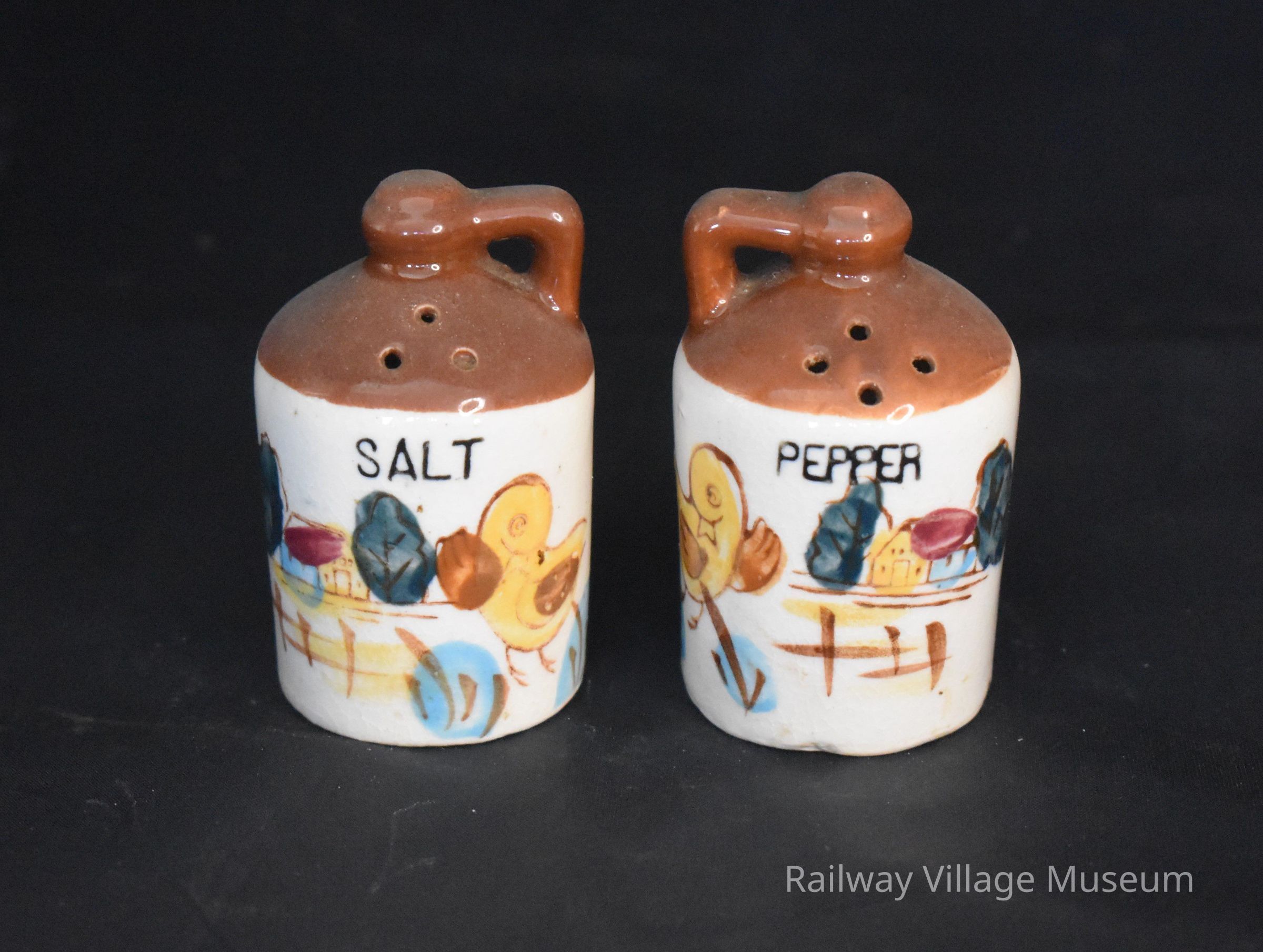 Salt and pepper shakers with a yellow bird and barn design: salt - 2023.1.223a, and pepper - 2023.1.223b.