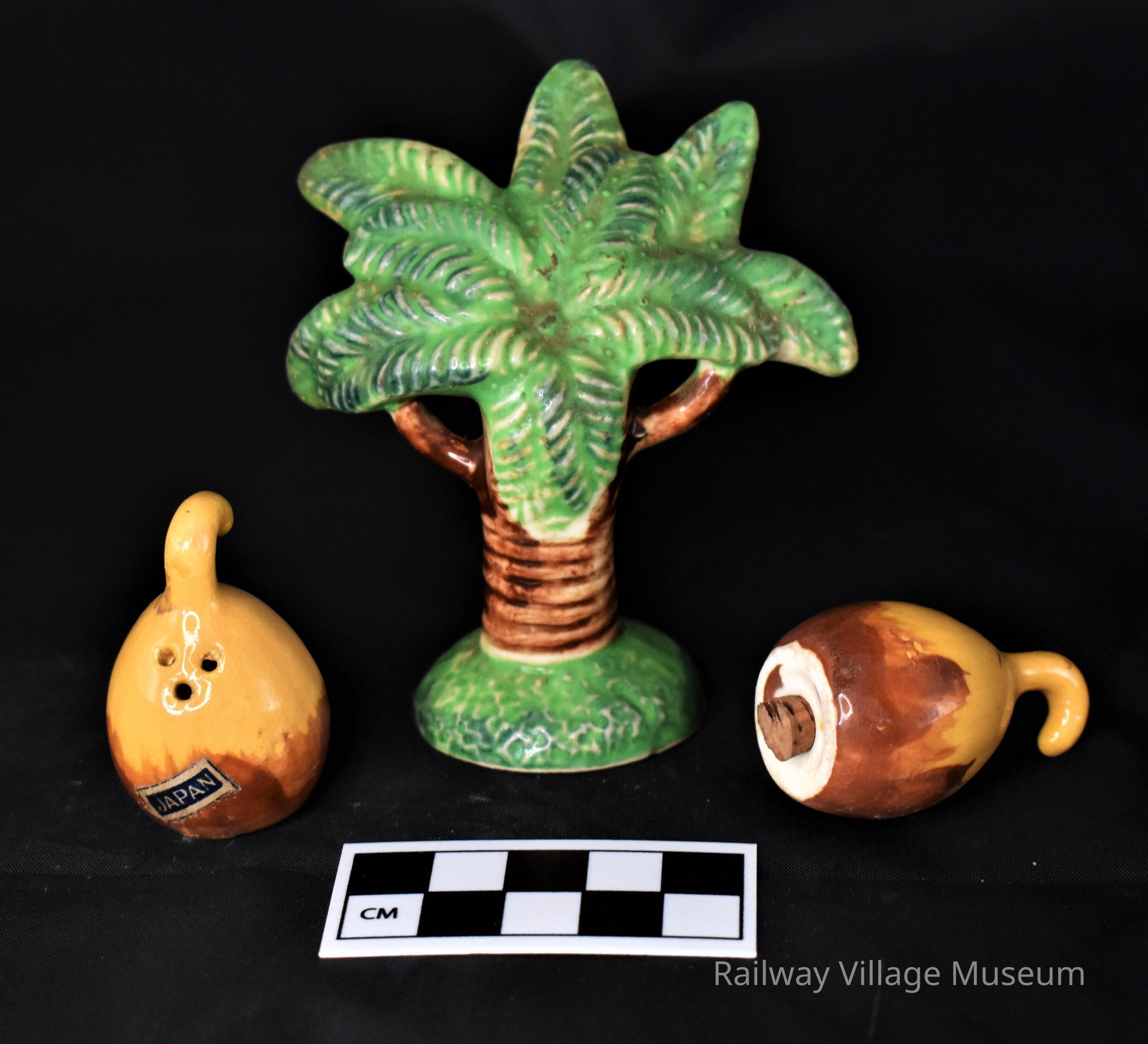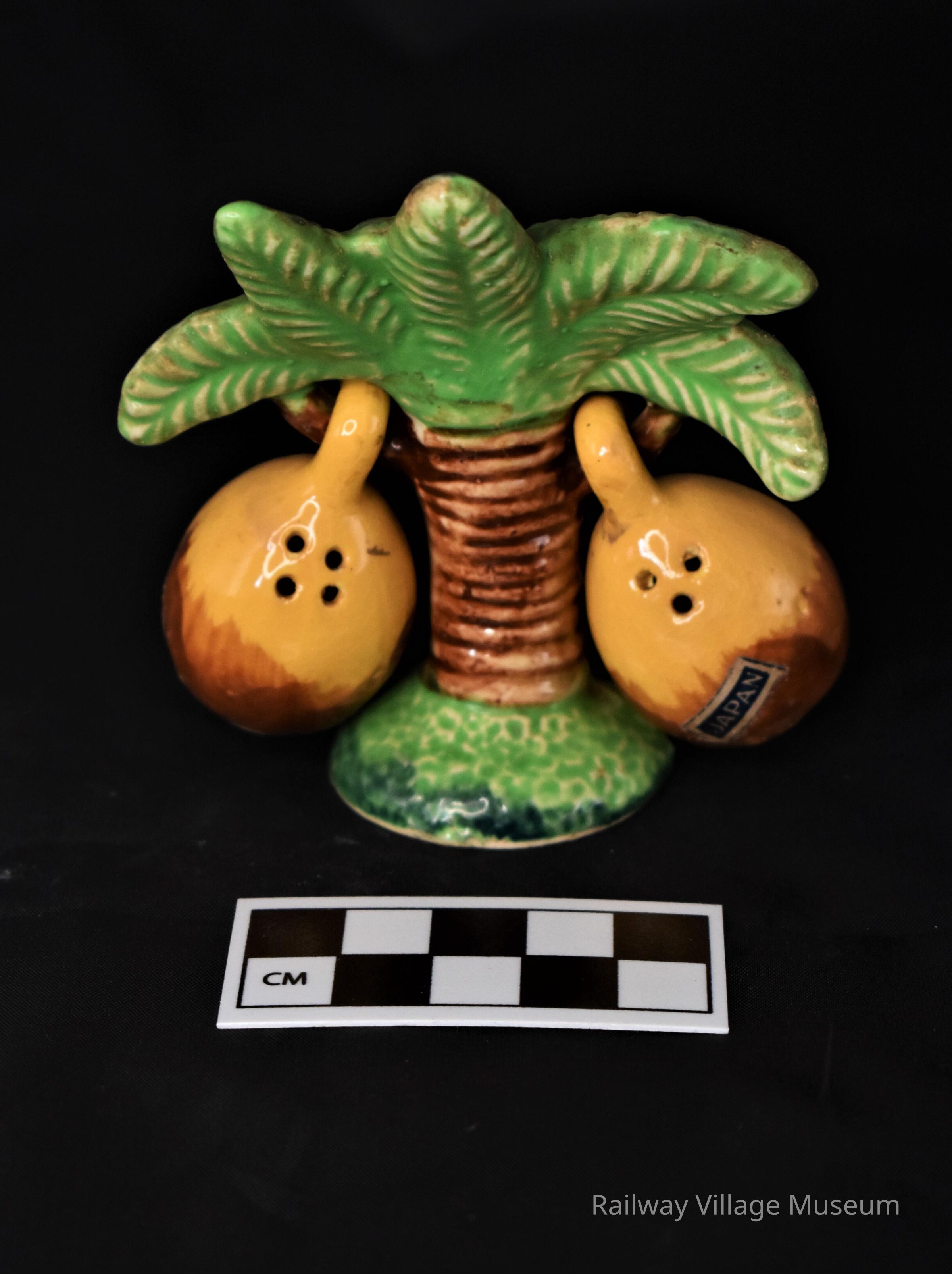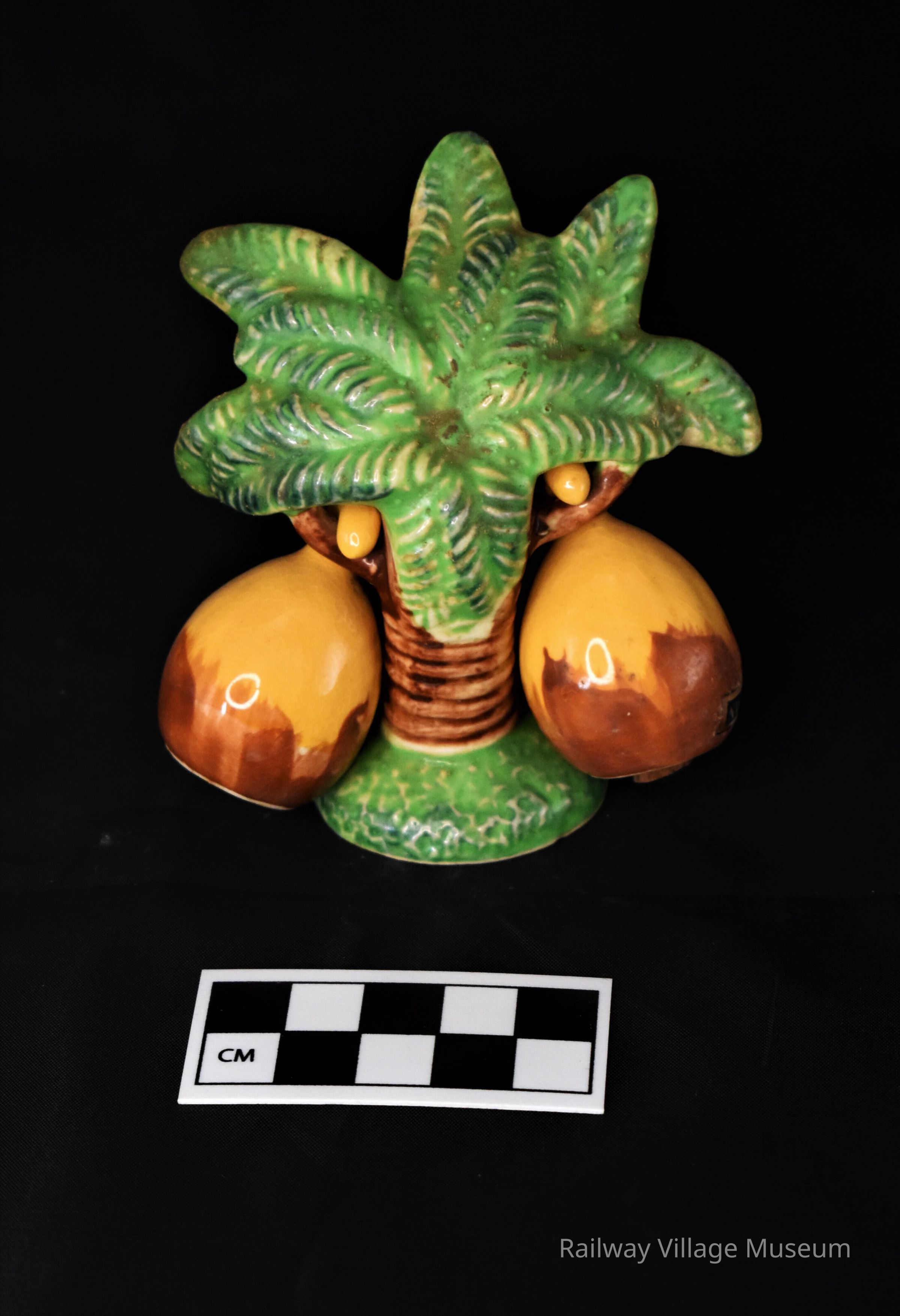 This salt and pepper set consists of ceramic palm tree with two coconut-shaped shakers which hang from the tree's branches. The two small shakers both have their cork stoppers intact. The set is unmarked for a manufacturer but both coconuts have a "Japan" sticker.