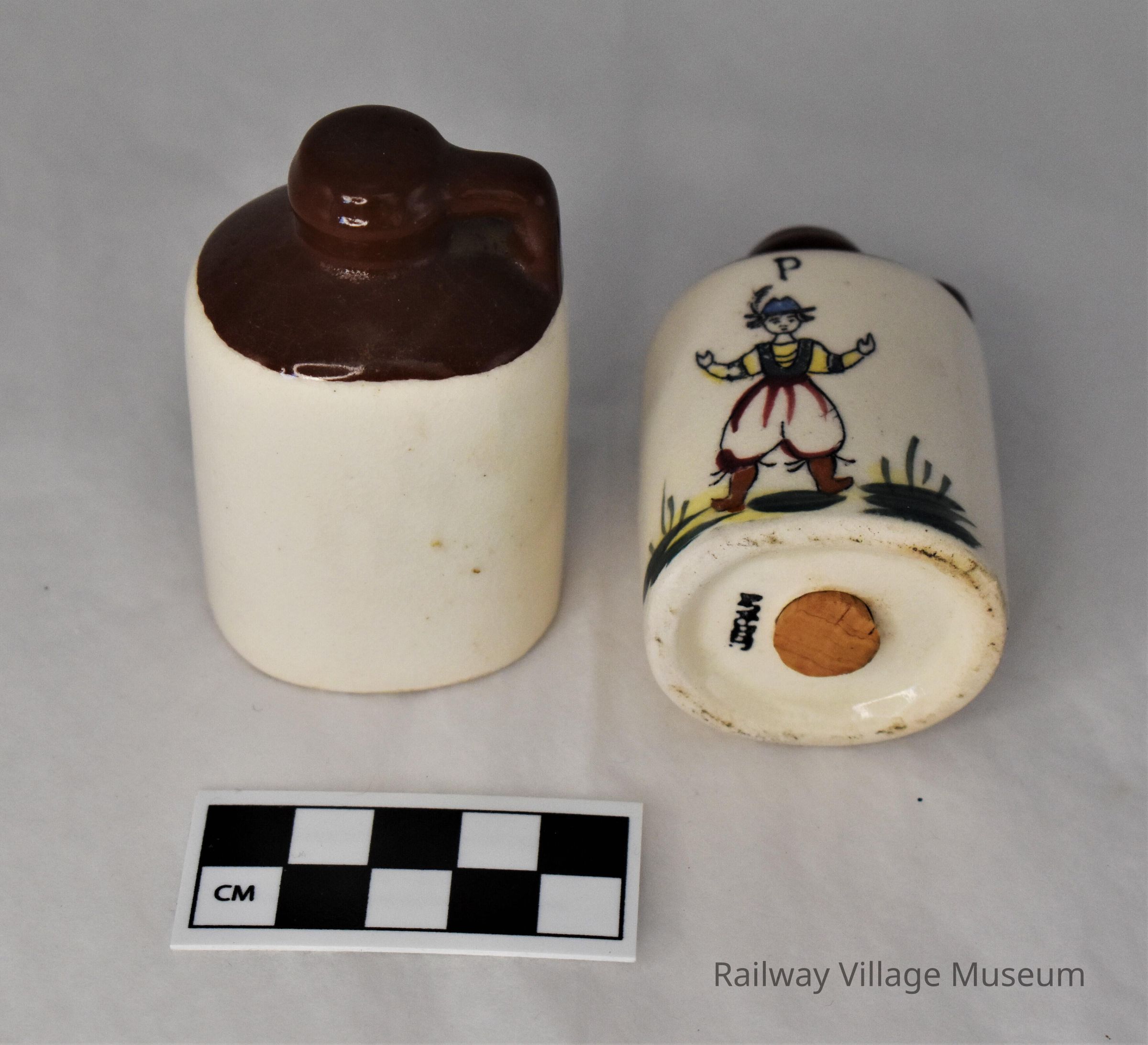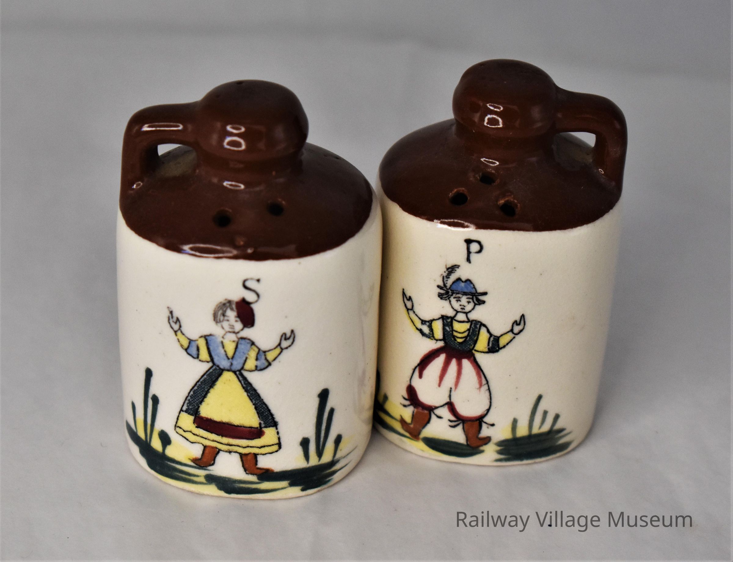 These ceramic jog-shaped salt and pepper shakers are decorated with illustrations called "Edelweiss People". Salt has a female and pepper a male in traditional German attire. Both have cork stoppers intact. Made in Japan.
