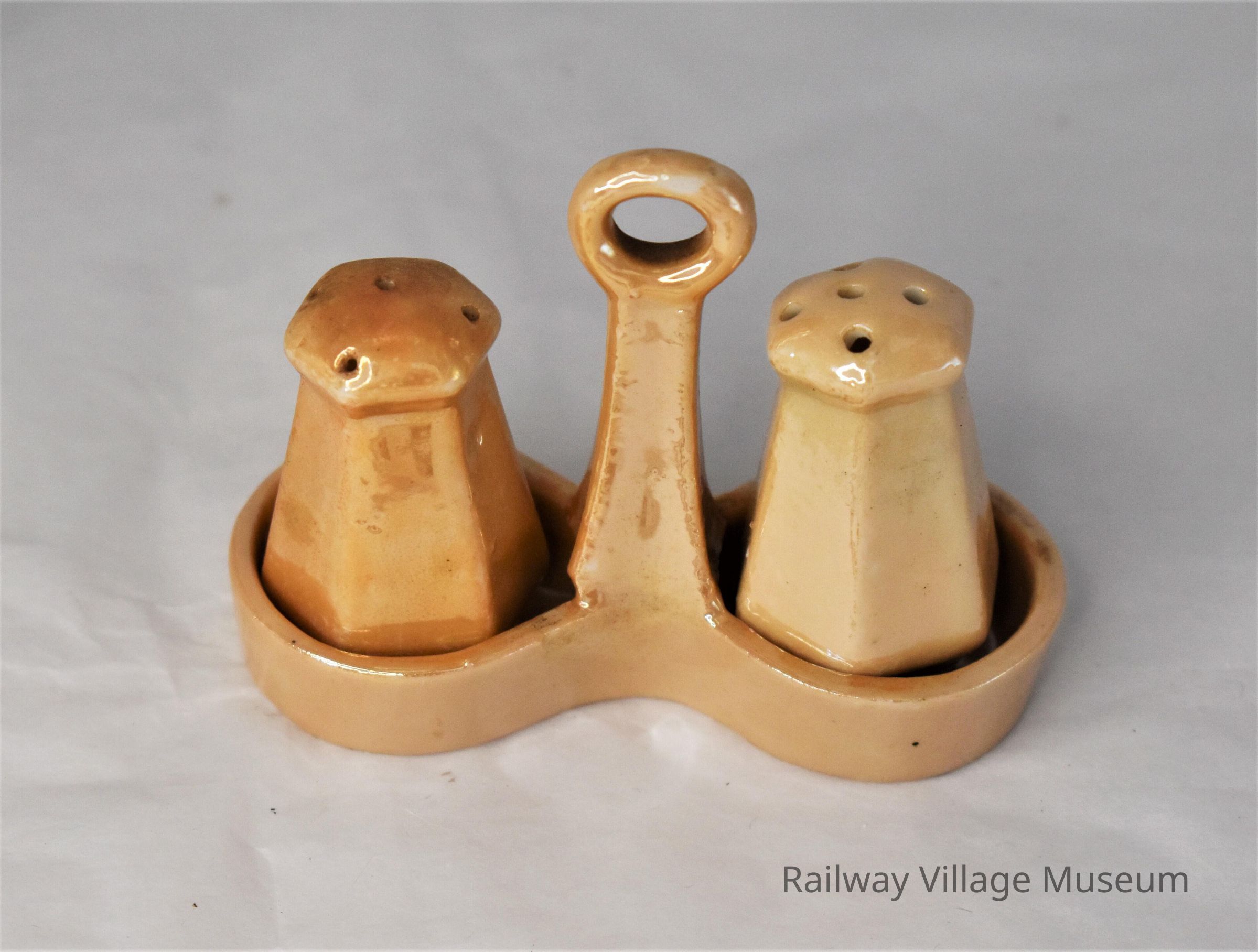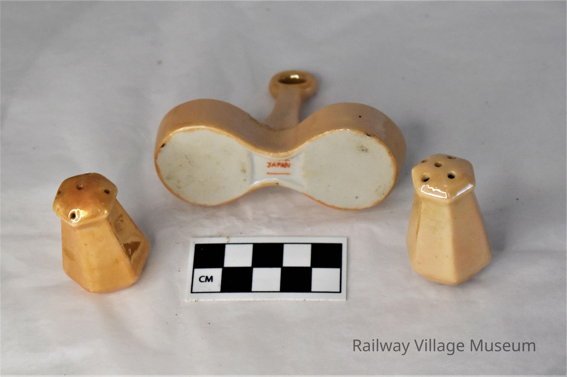 This set consists of ceramic salt and pepper shakers and a small stand in which the shakers nest. The iridescent tan color is a glazing style called "luster". Made in Japan. One shaker has the cork stopper in place and the other has been pushed inside.