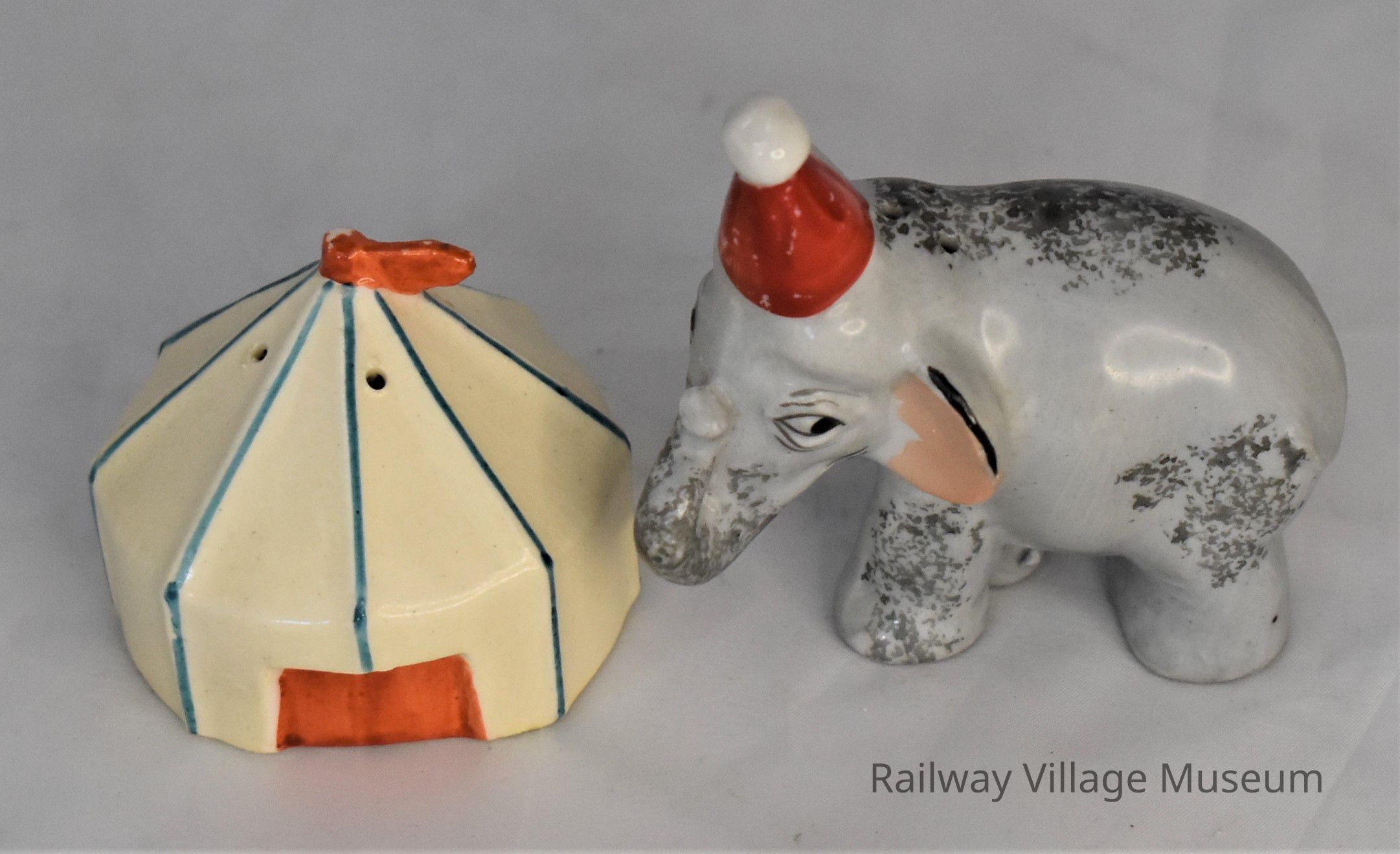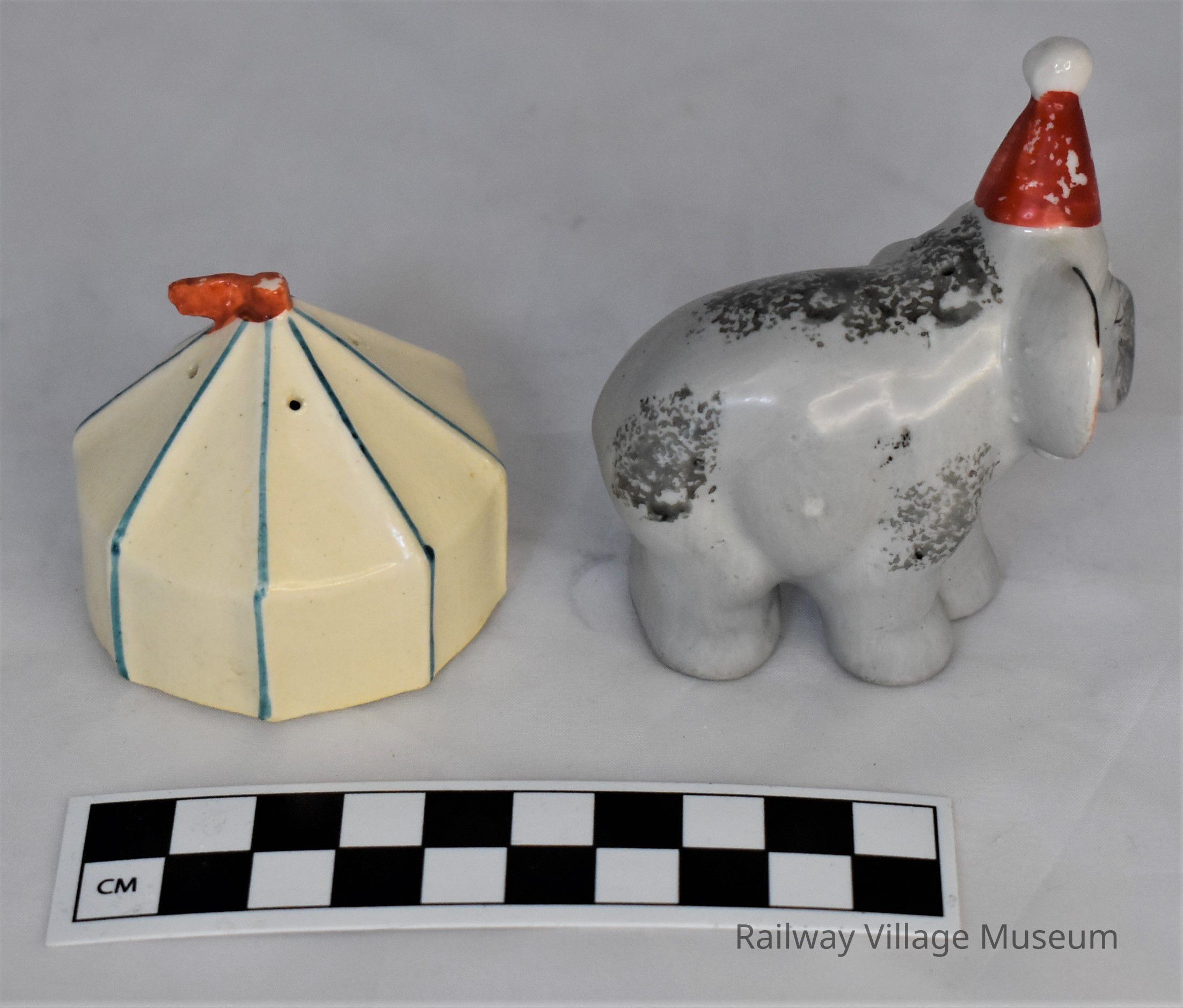 Circus tent and elephant salt & pepper shakers: 2023.1.21a, and 2023.1.21b