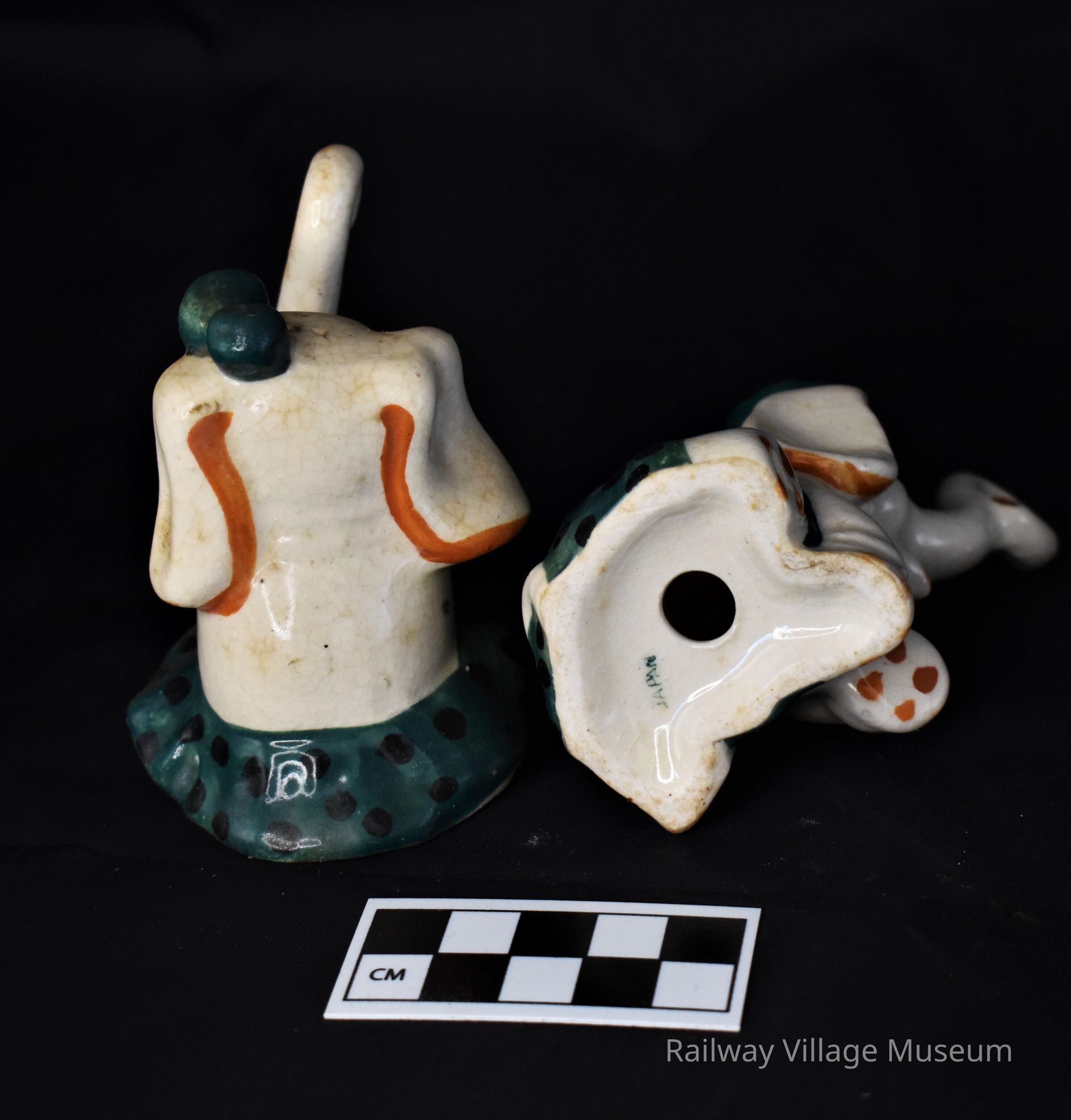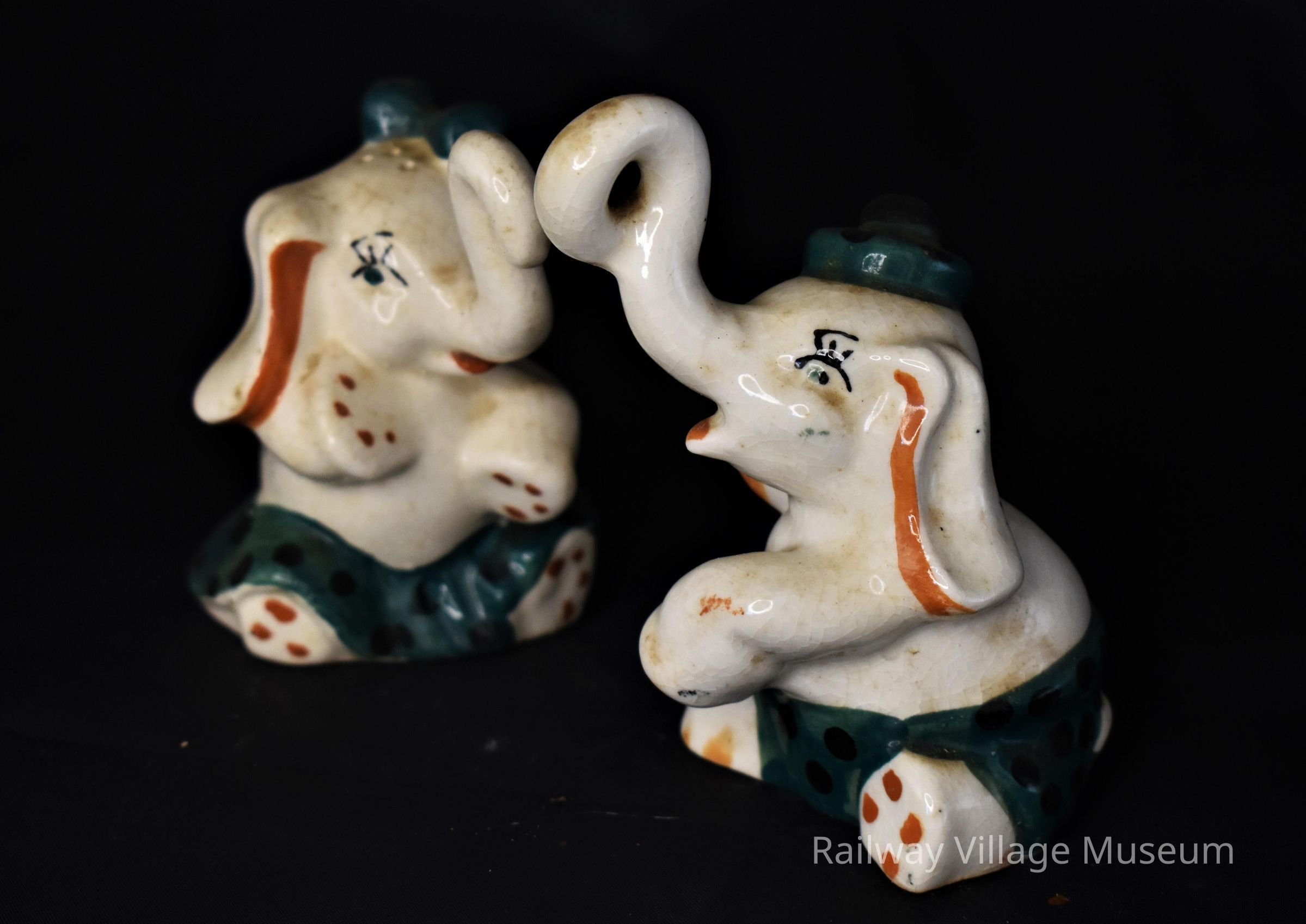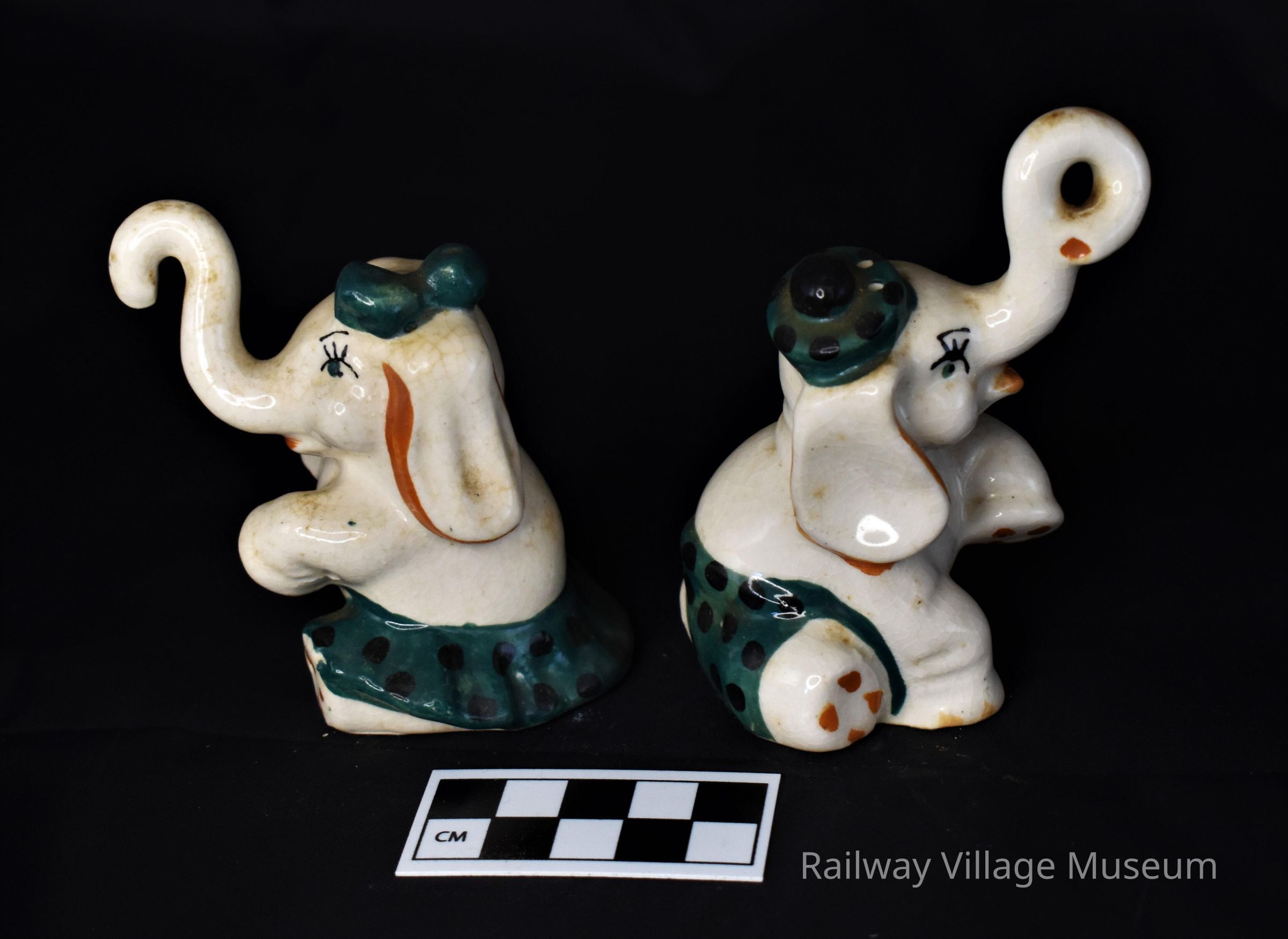 This pair of male and female elephant shakers were manufactured by the Ceramic Arts Studio. The female wears a green skirt with polka dots and a matching green bow over one ear. The male wears green and black polka dot shorts with matching tam. Both are marked on the base that they were made in Japan although the Ceramic Arts Studio was based in Madison, Wisconsin. Only the female shaker has its cork stopper intact.