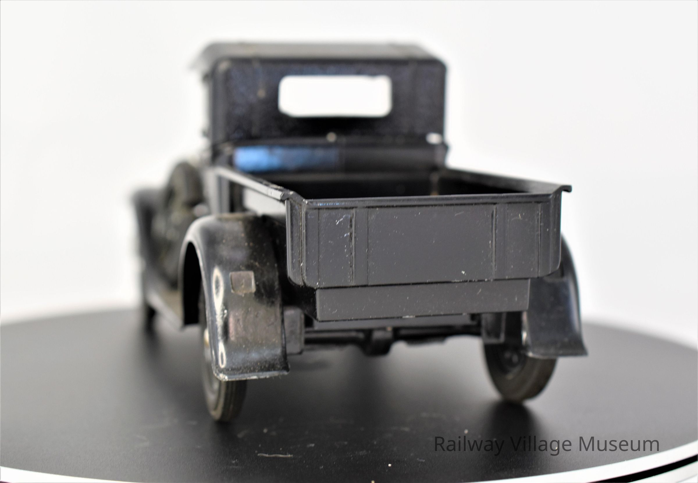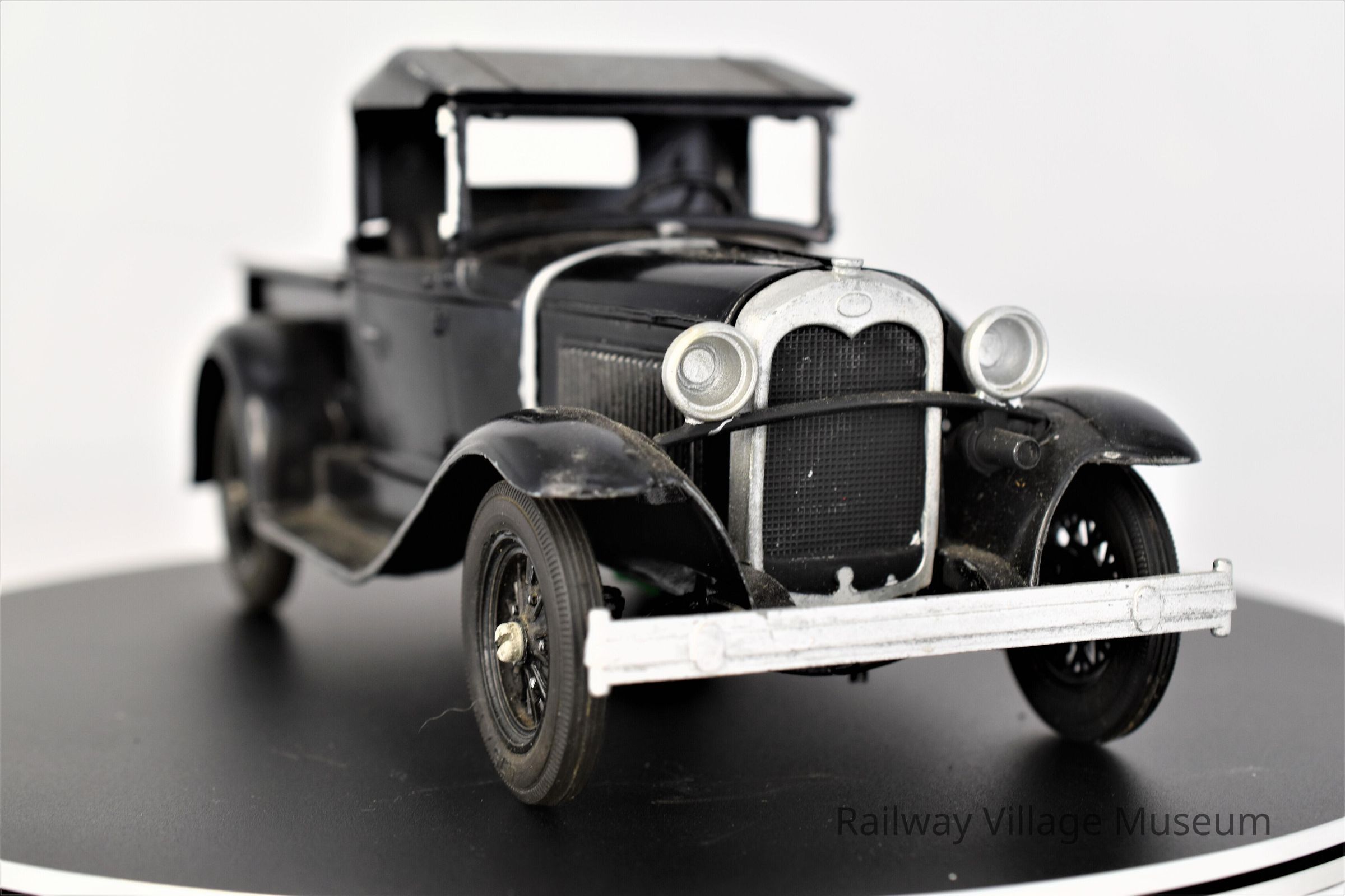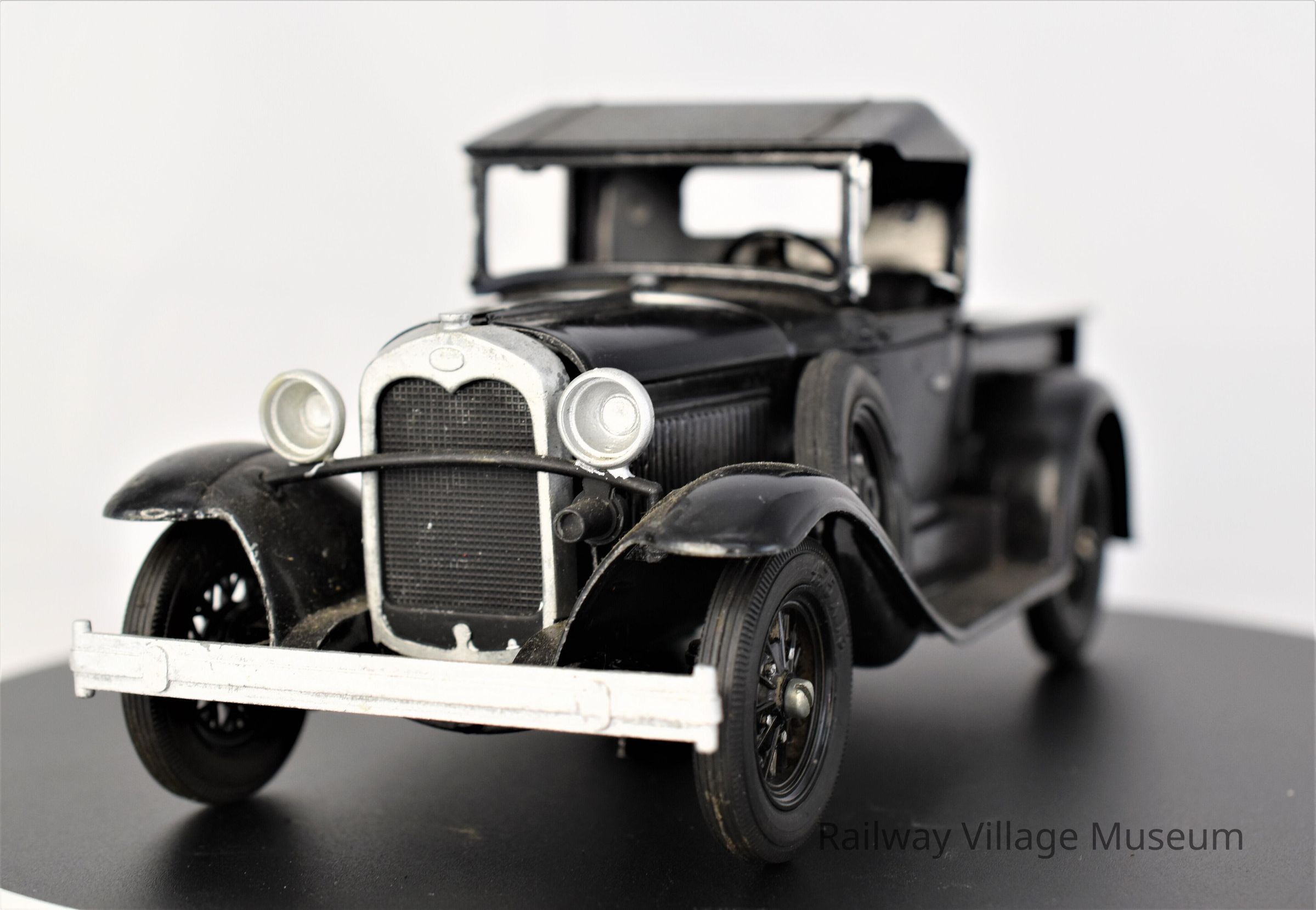 A black Model A Ford Pickup, crafted from a kit. This cars tires are black, and the steering wheel turns the front two tires.