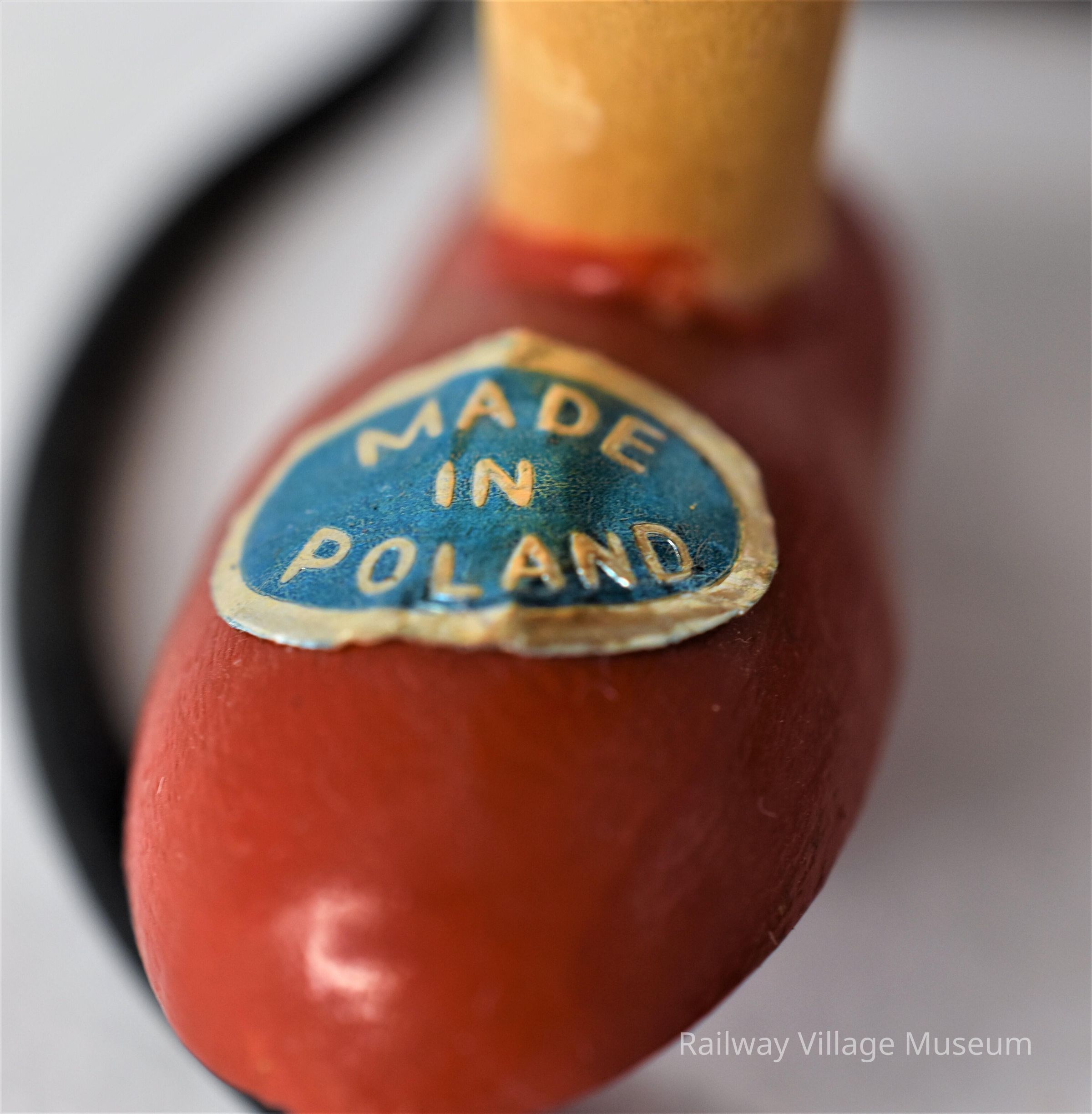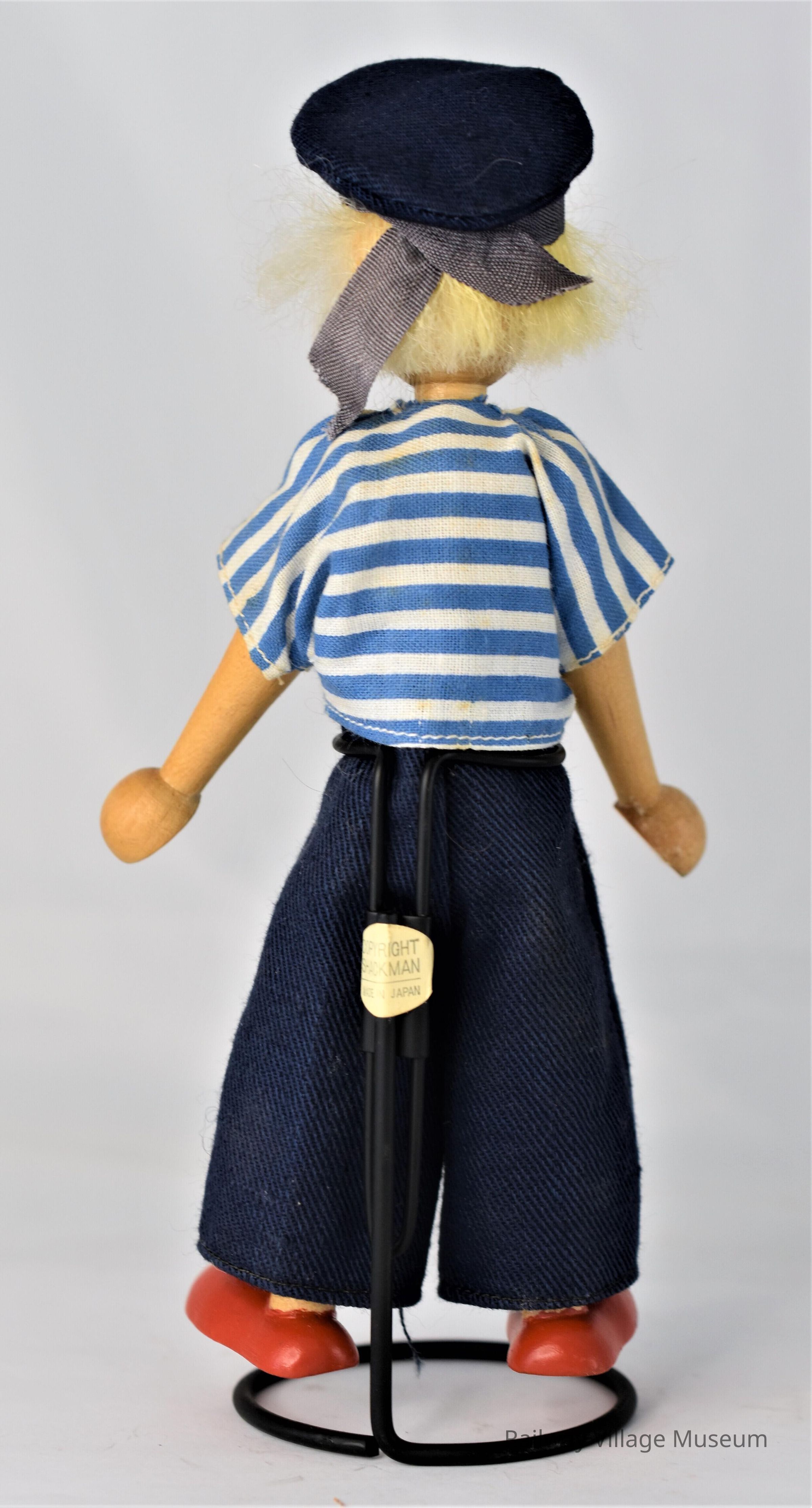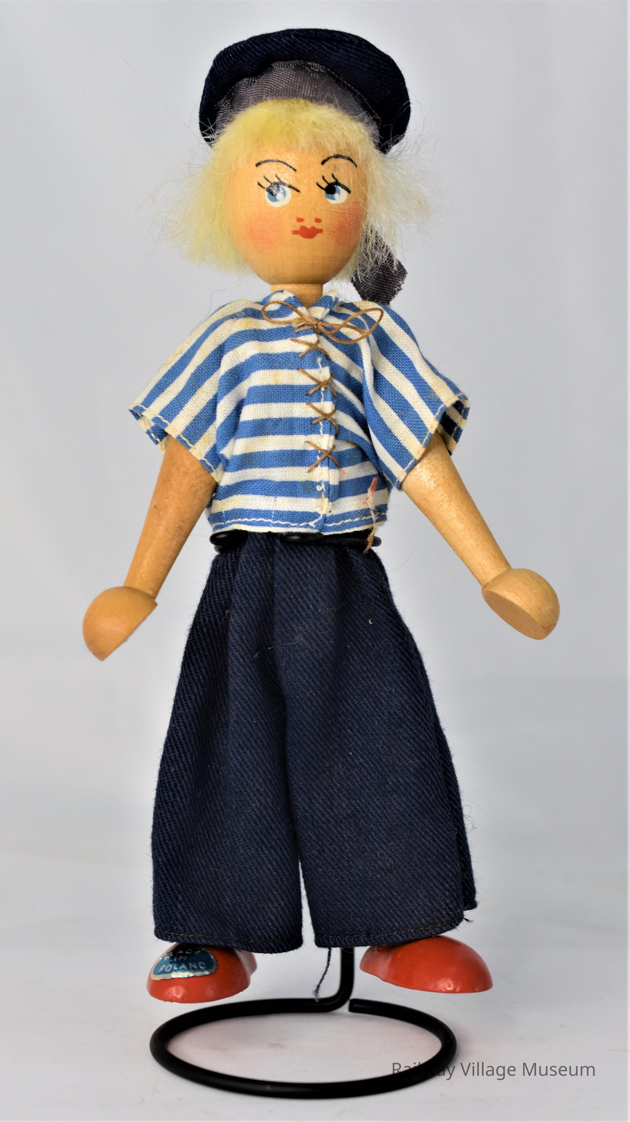 A wooden doll, with a "Made in Poland" sticker attached to its shoe. It's wearing a blue and white sailor outfit.Lexicon