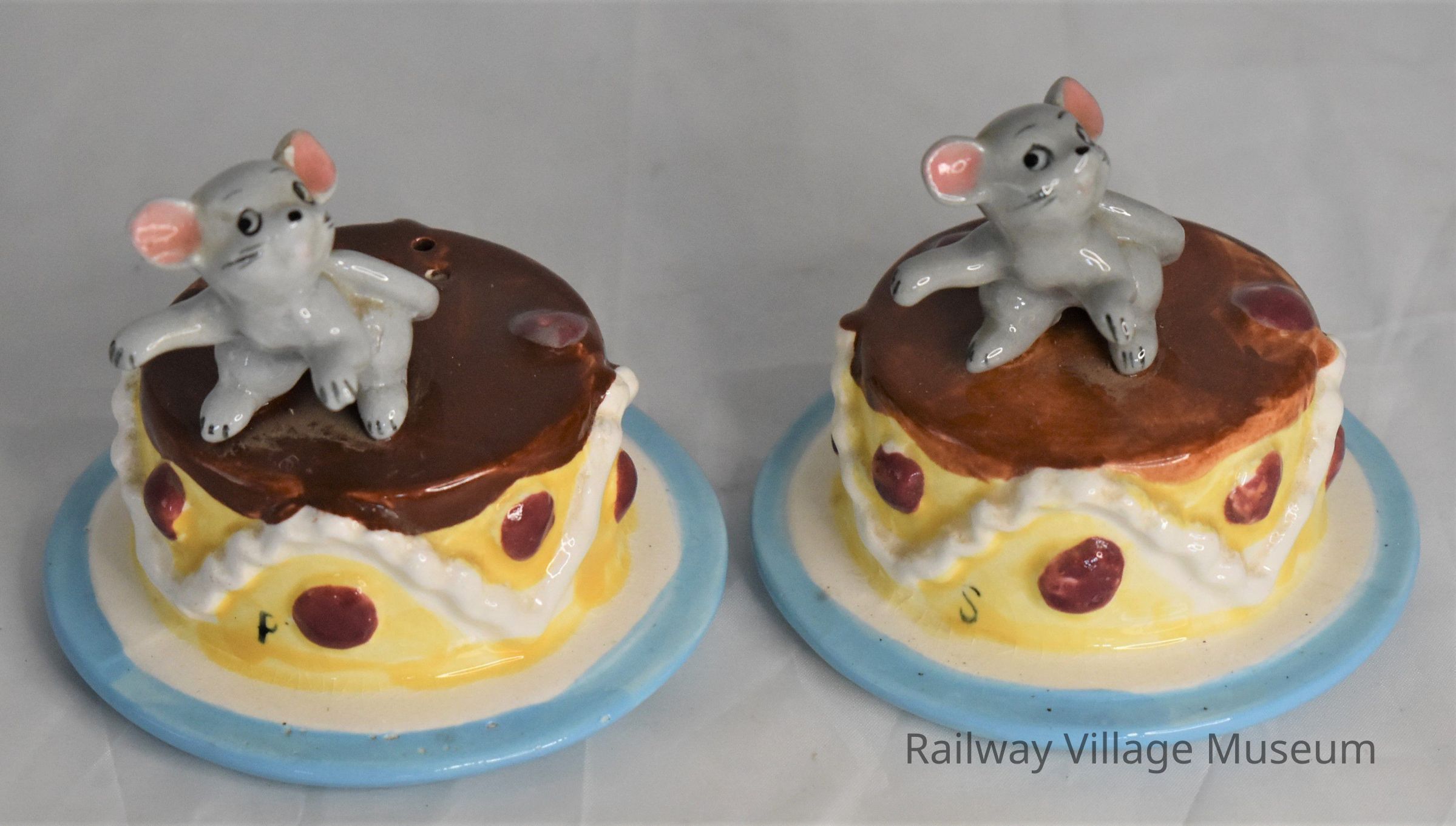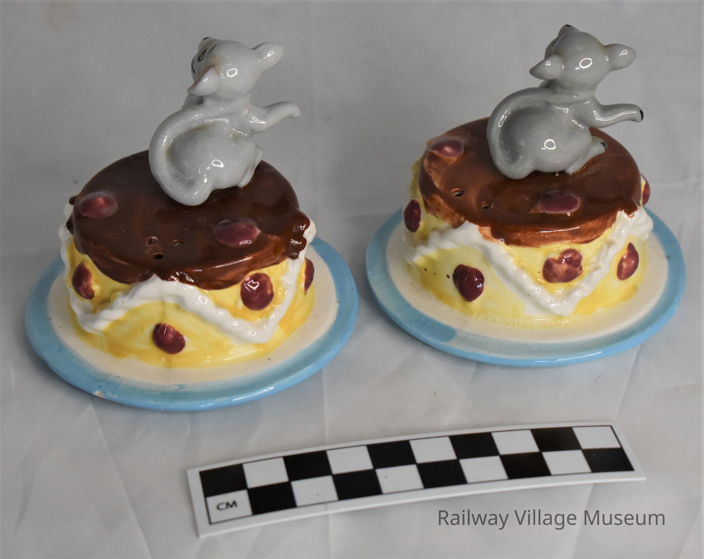 Vintage ceramic mouse on cake salt and pepper shakers: 2023.1.68a, and 2023.1.68b