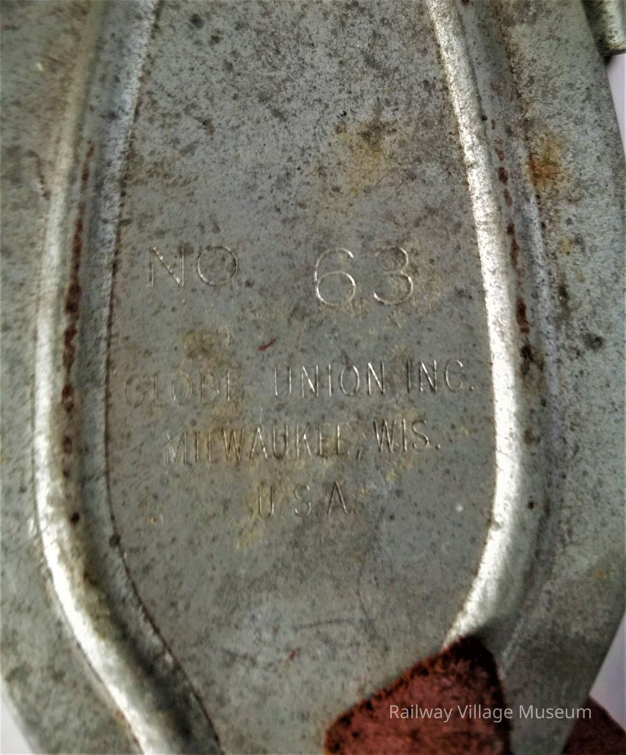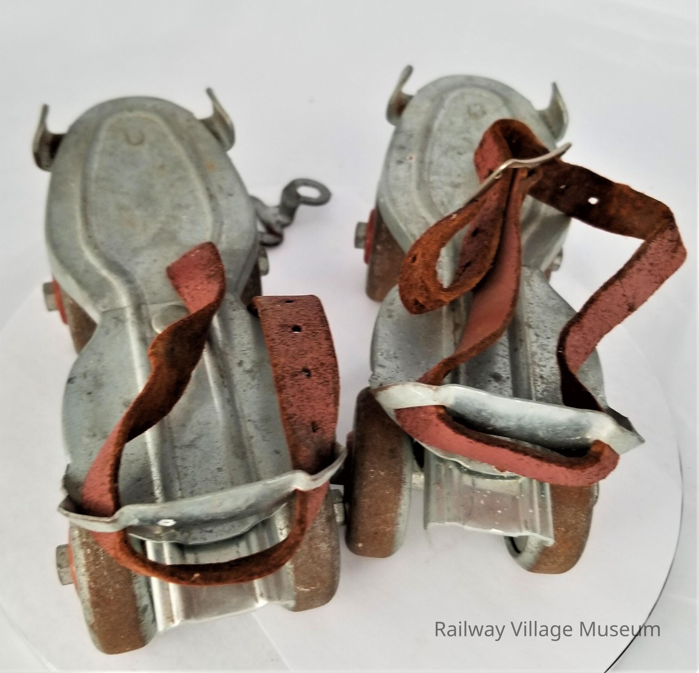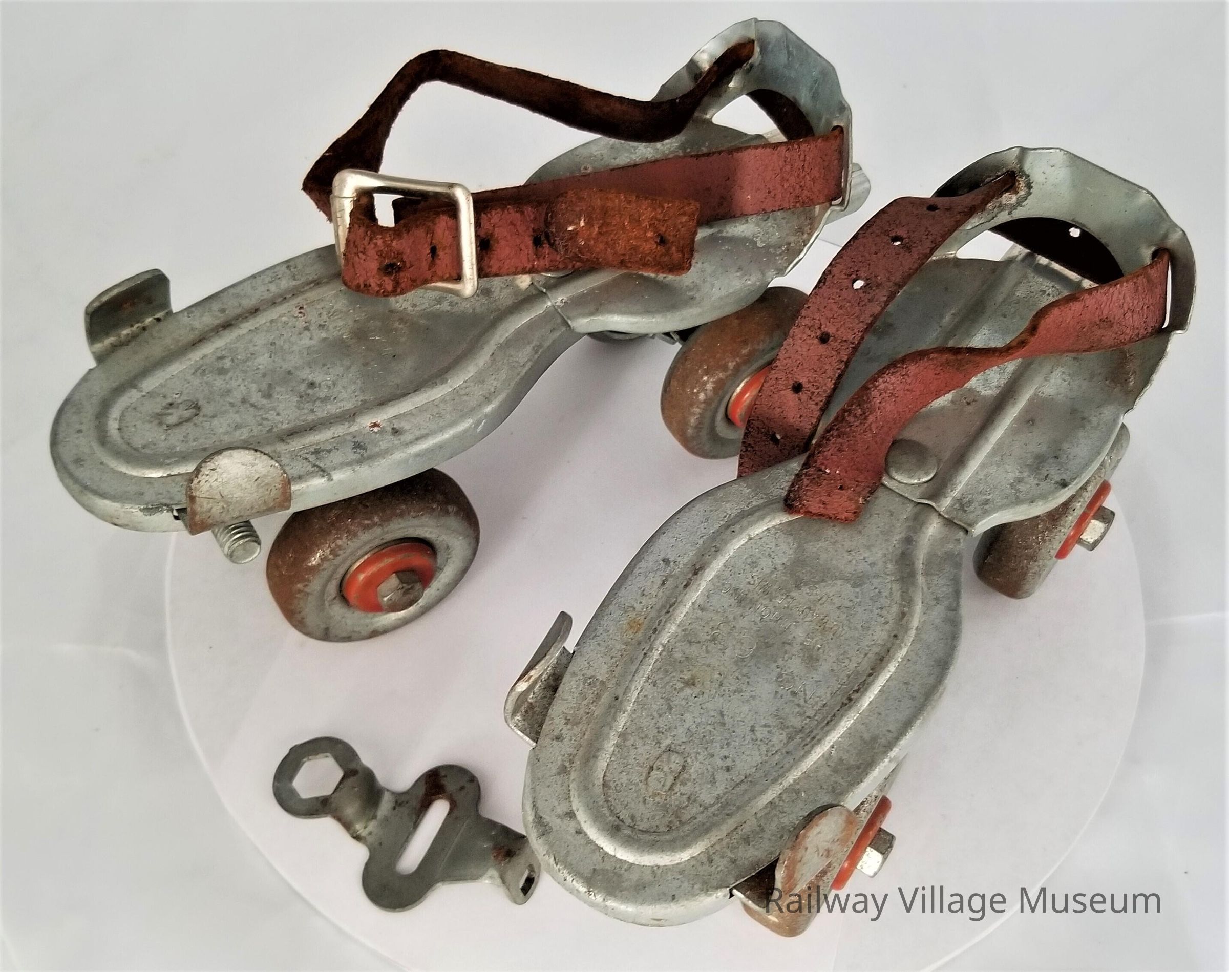 These adjustable roller skates (No. 63), by the Globe Union company, clipped on to regular shoes. The accompanying key would be used to adjust the length of the skate and the width of the clip near the toe. The skates have red leather ankle straps and metal wheels. The Globe Union company primarily produced batteries but, as the production of batteries lessened in the summer months. the company filled the gap by producing these clip on skates particularly between the 1940's and 50's.