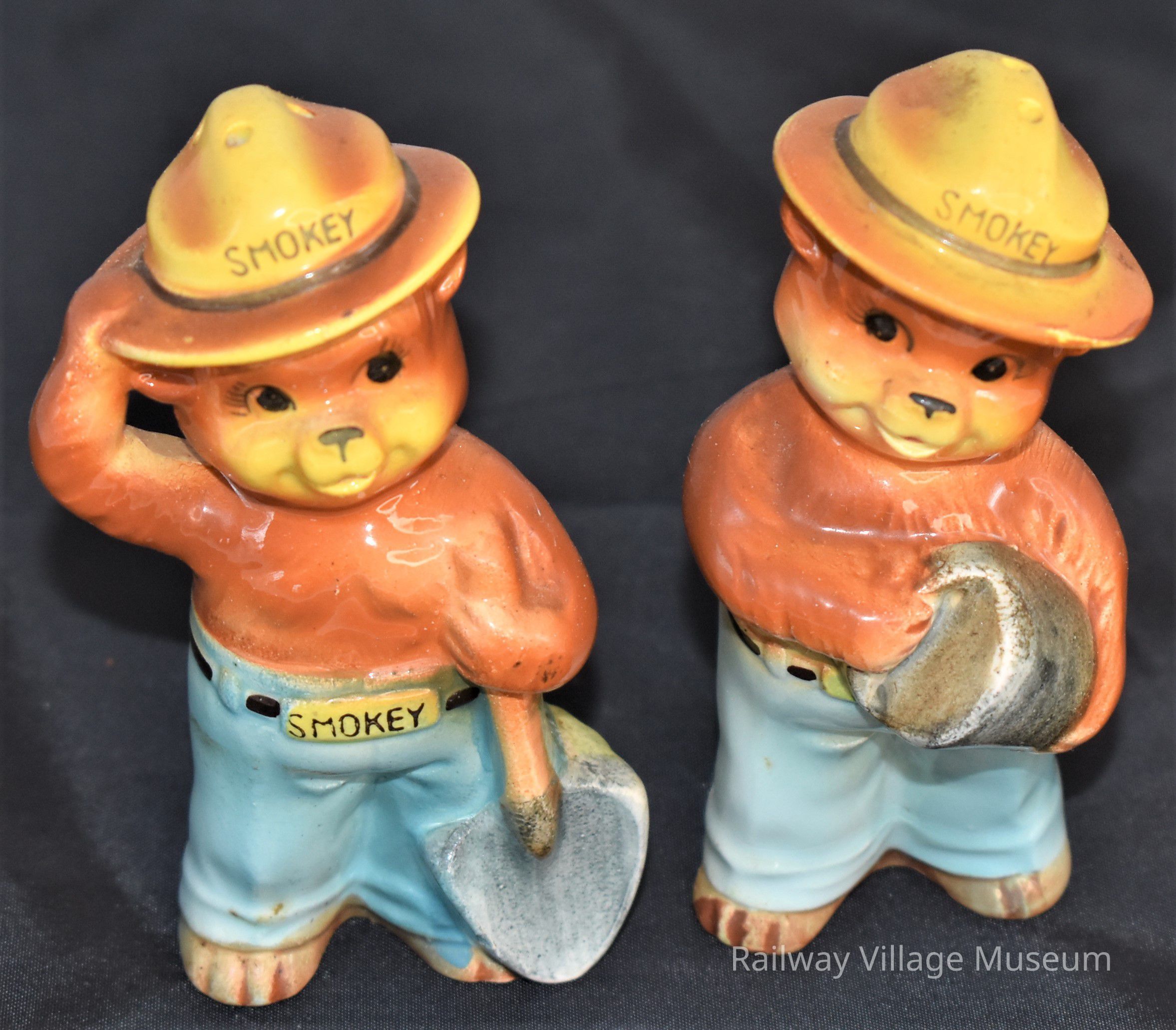 Vintage "Smokey the Bear" forest rangers ceramic salt and pepper shakers. Made in Japan. Smokey the bear is an American campaign and advertising icon for the U.S. Forest service. Originally the slogan in 1944 was "Smokey says - Care will prevent 9 out of 10 forest fires". In 1947 it changed to "Remember...Only you can prevent forest fires.".