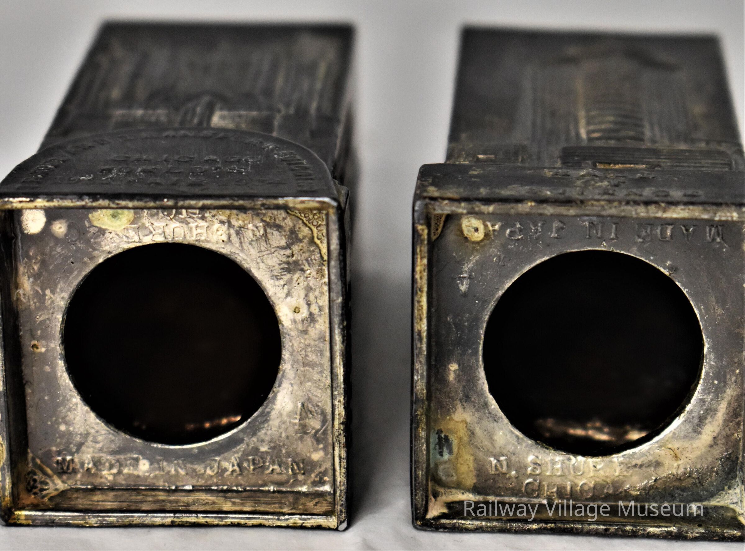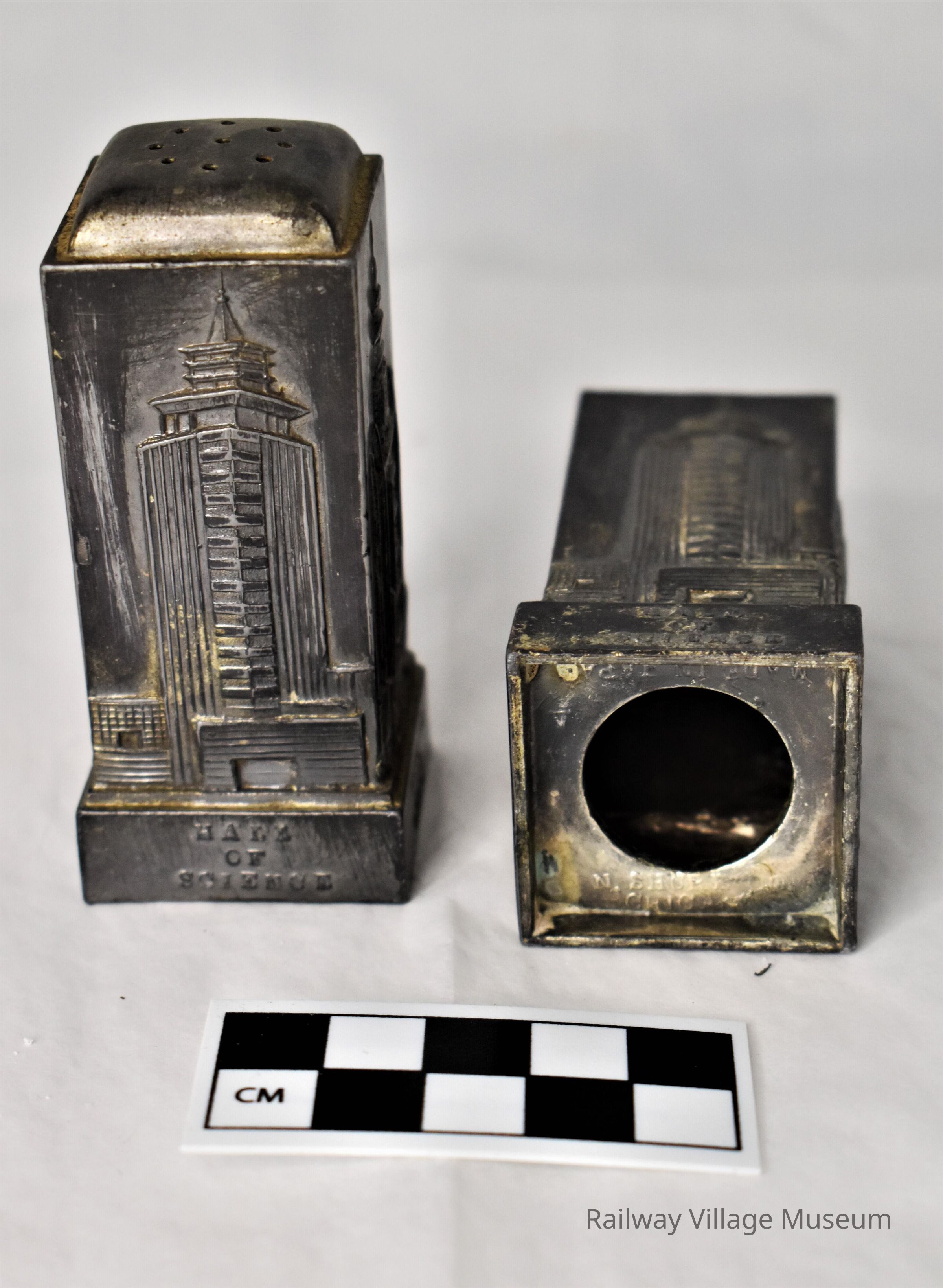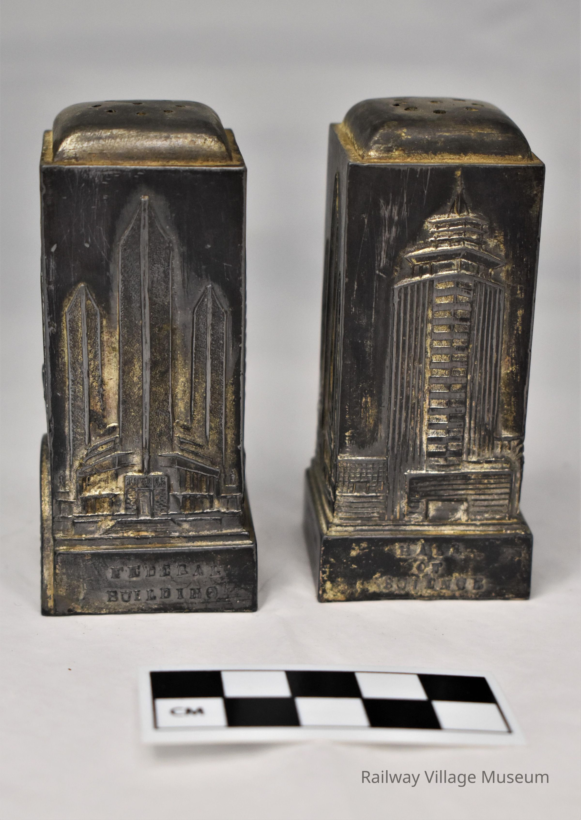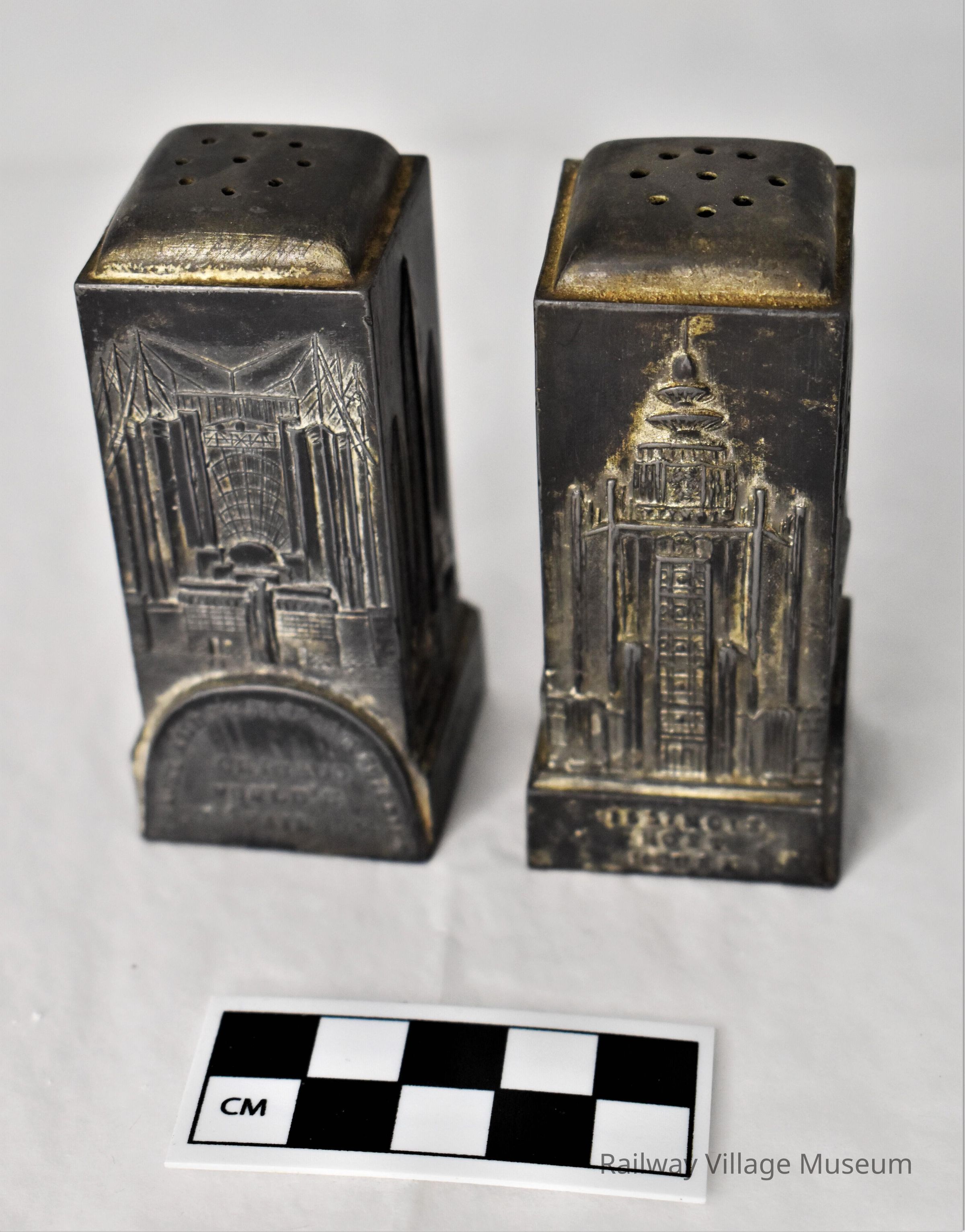 Metal salt and pepper shaker souvenirs of the Chicago World's Fair. These matching shakers have a different Chicago landmark on each of its four sides. Manufactured by the N. Shure Co of Chicago and made in Japan. Stoppers are no longer intact.