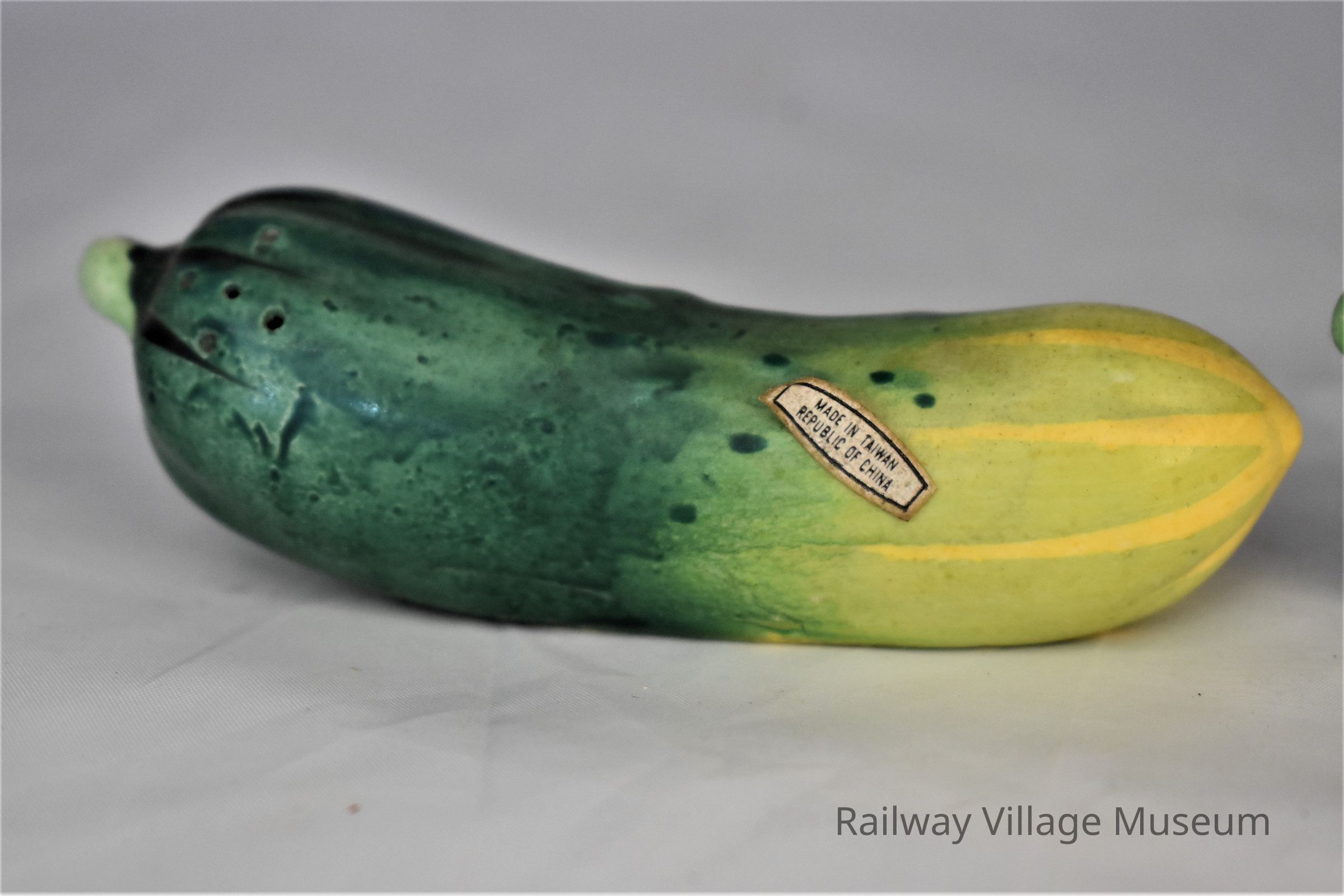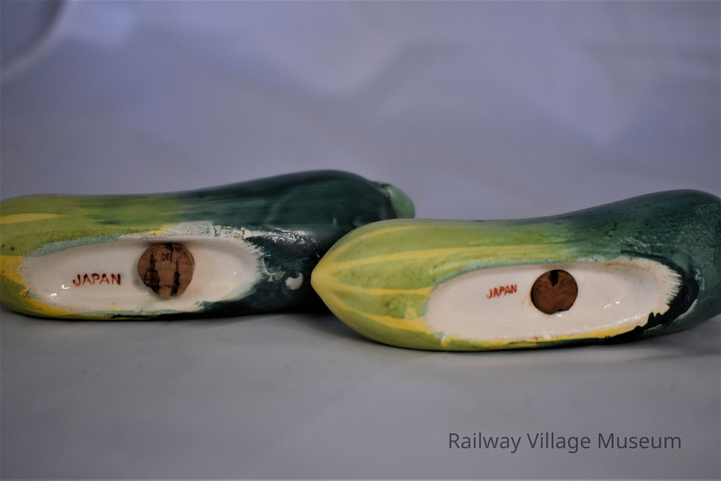 Vintage ceramic pickle salt and pepper shakers made in Taiwan Republic of China, the label of which is only on the pepper shaker.