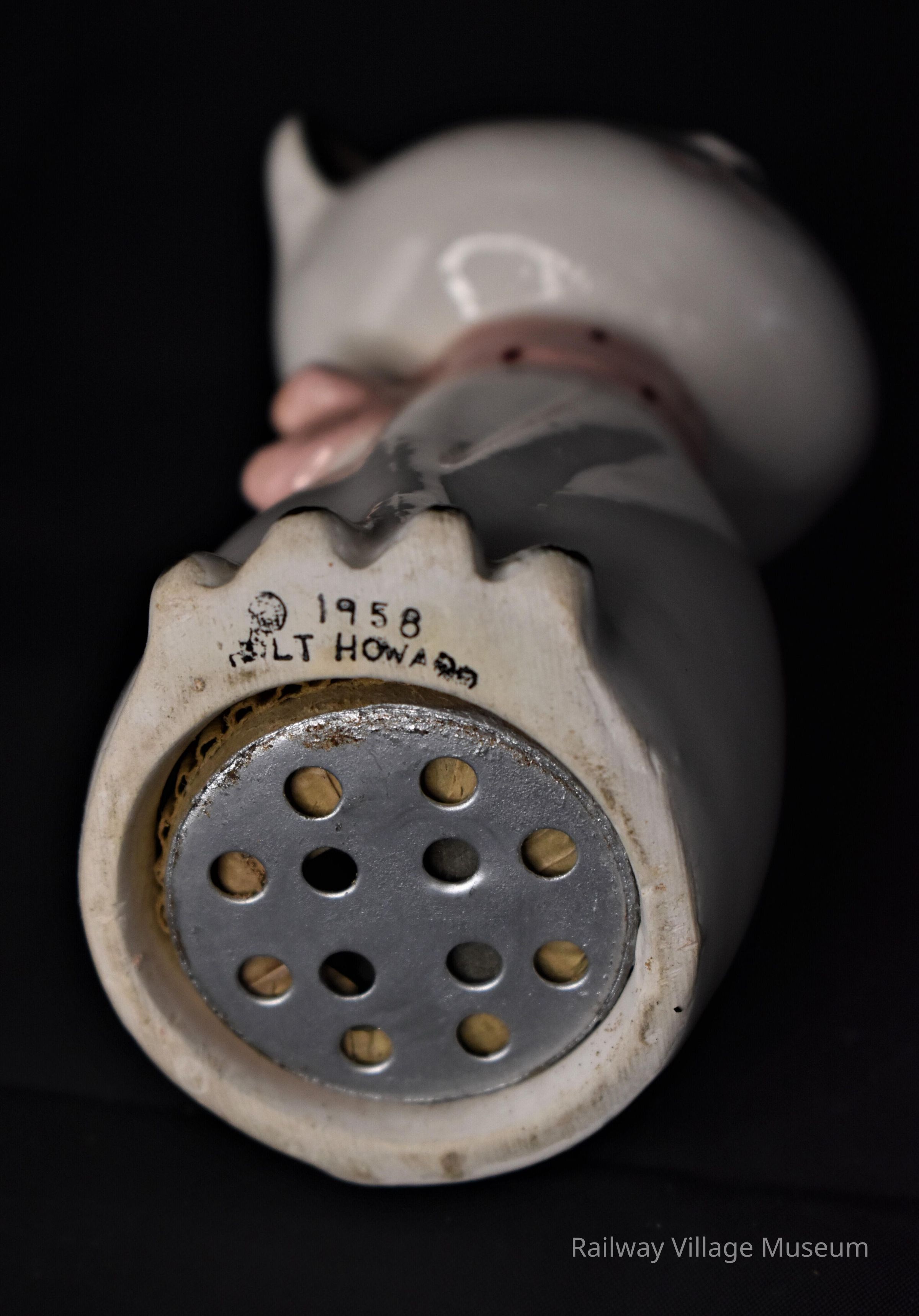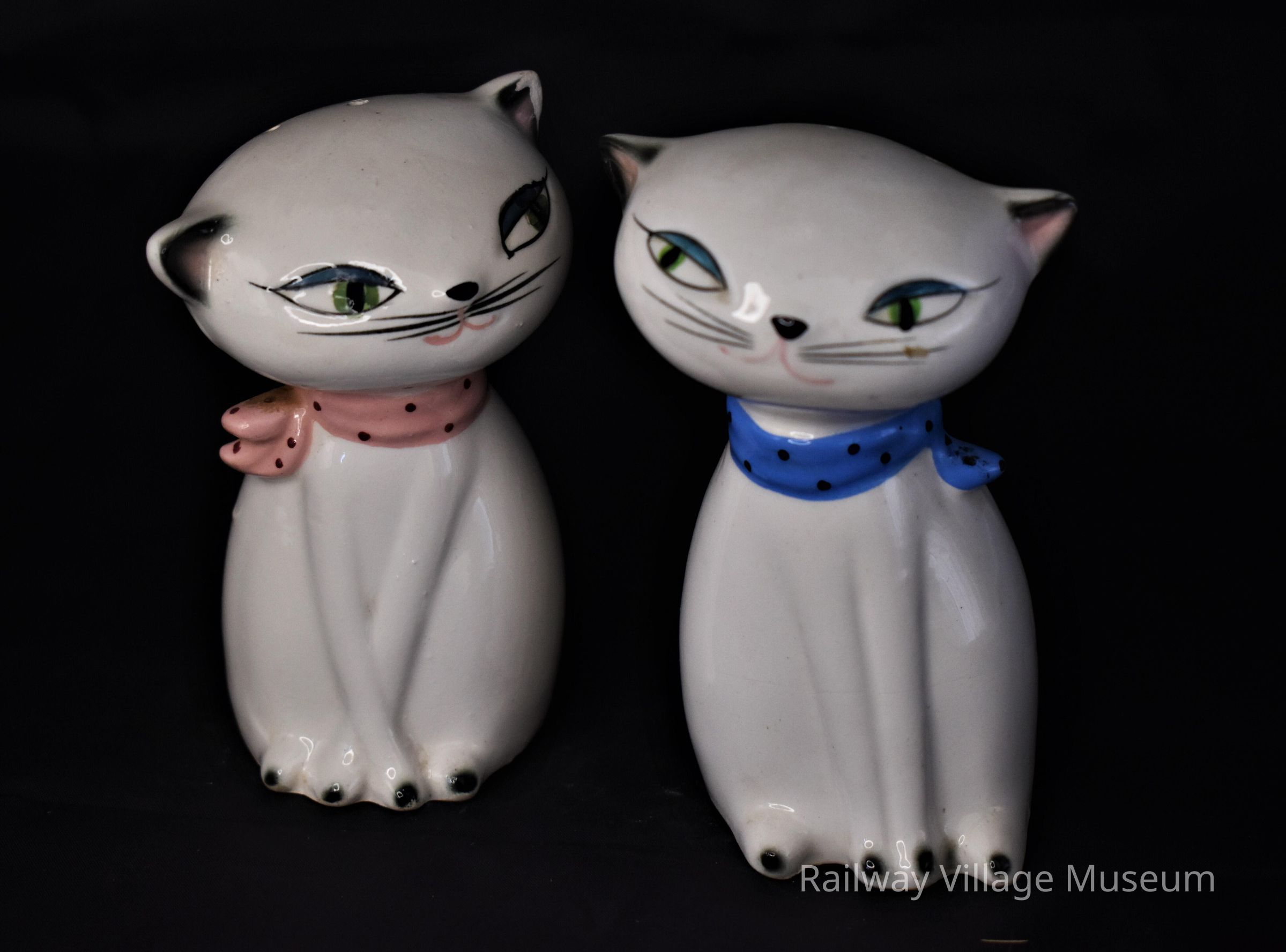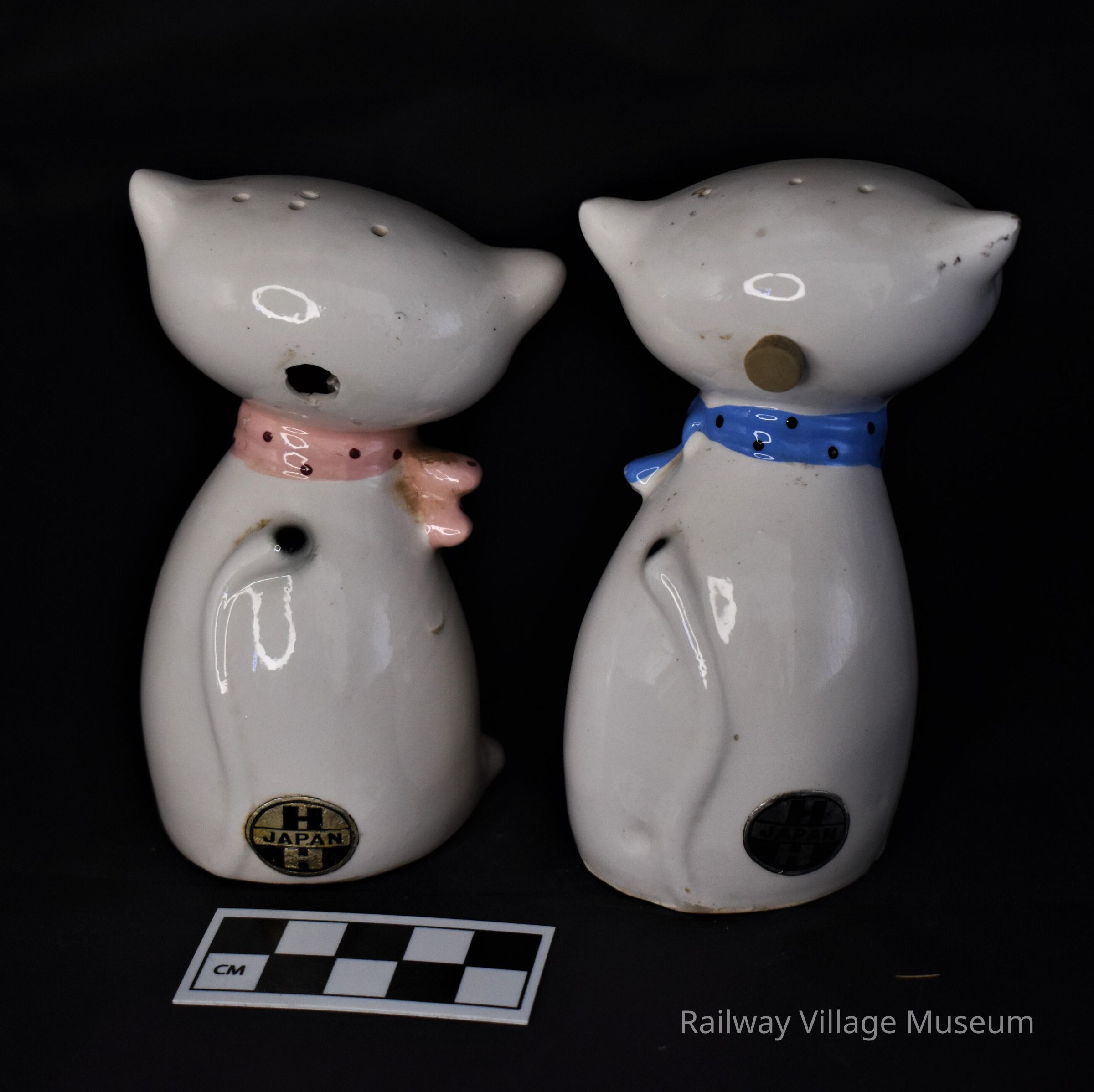 A pair of ceramic cat salt and pepper shakers from popular manufacturer, Holt Howard. One cat is wearing a pink polka-dot scarf and the other a blue polka-dot scarf. Only one cat still has a stopper in the back of its head intact. Both have the foil Holt Howard sticker with the company's "HH Japan" logo. Manufacturer stamp on the base of each cat states it was made in 1958.