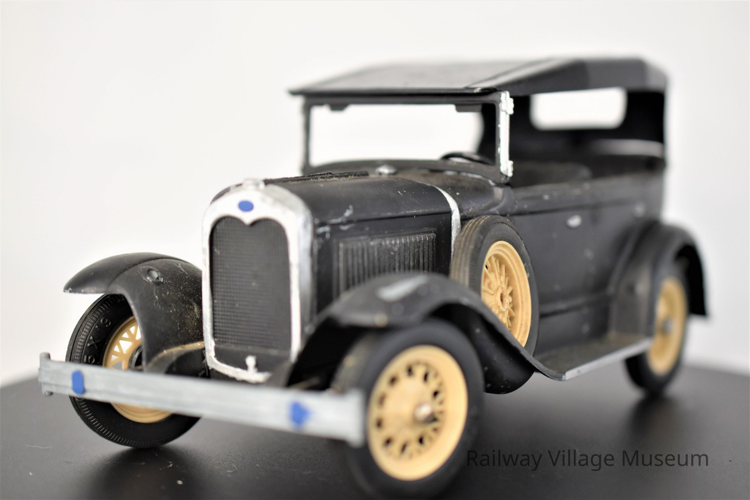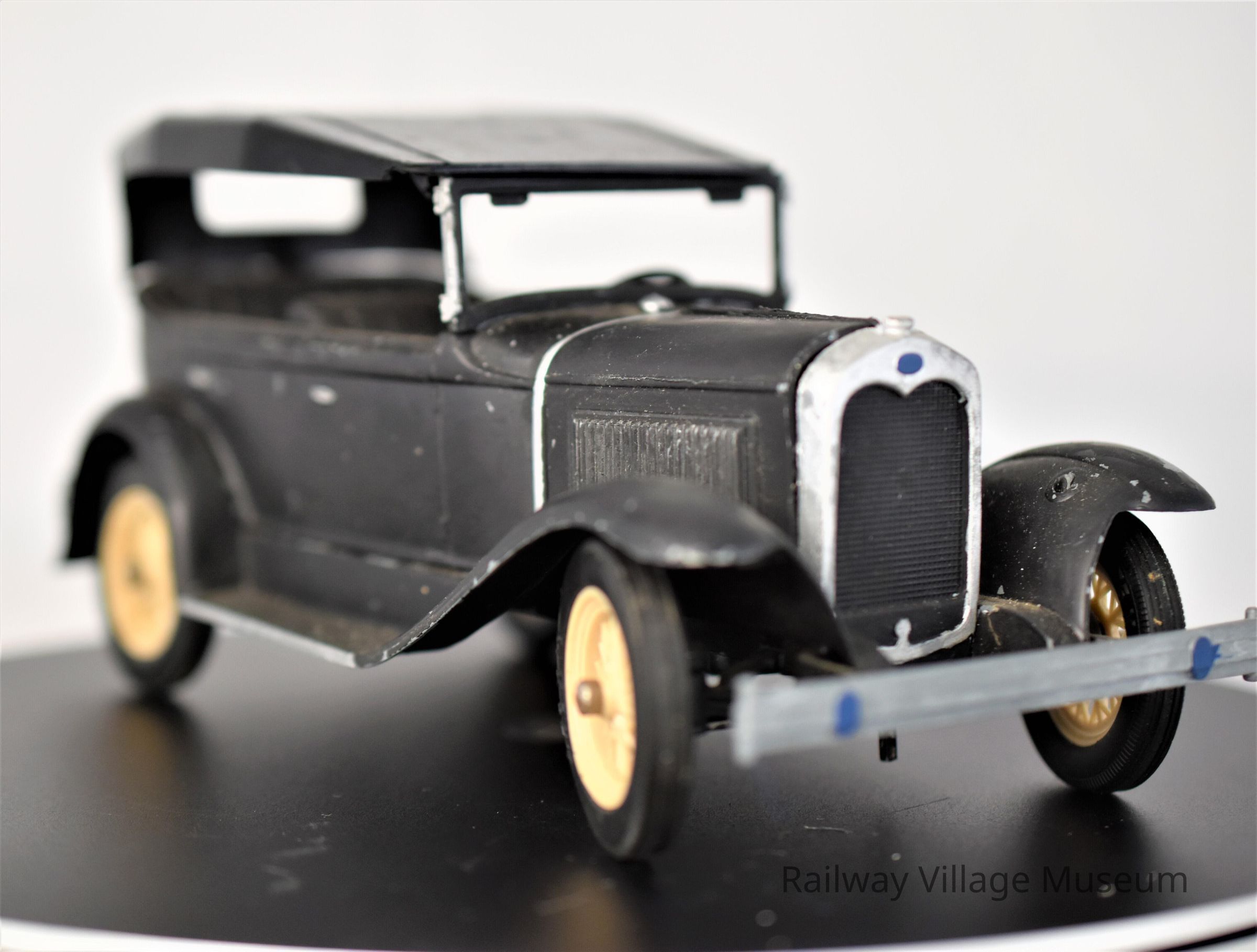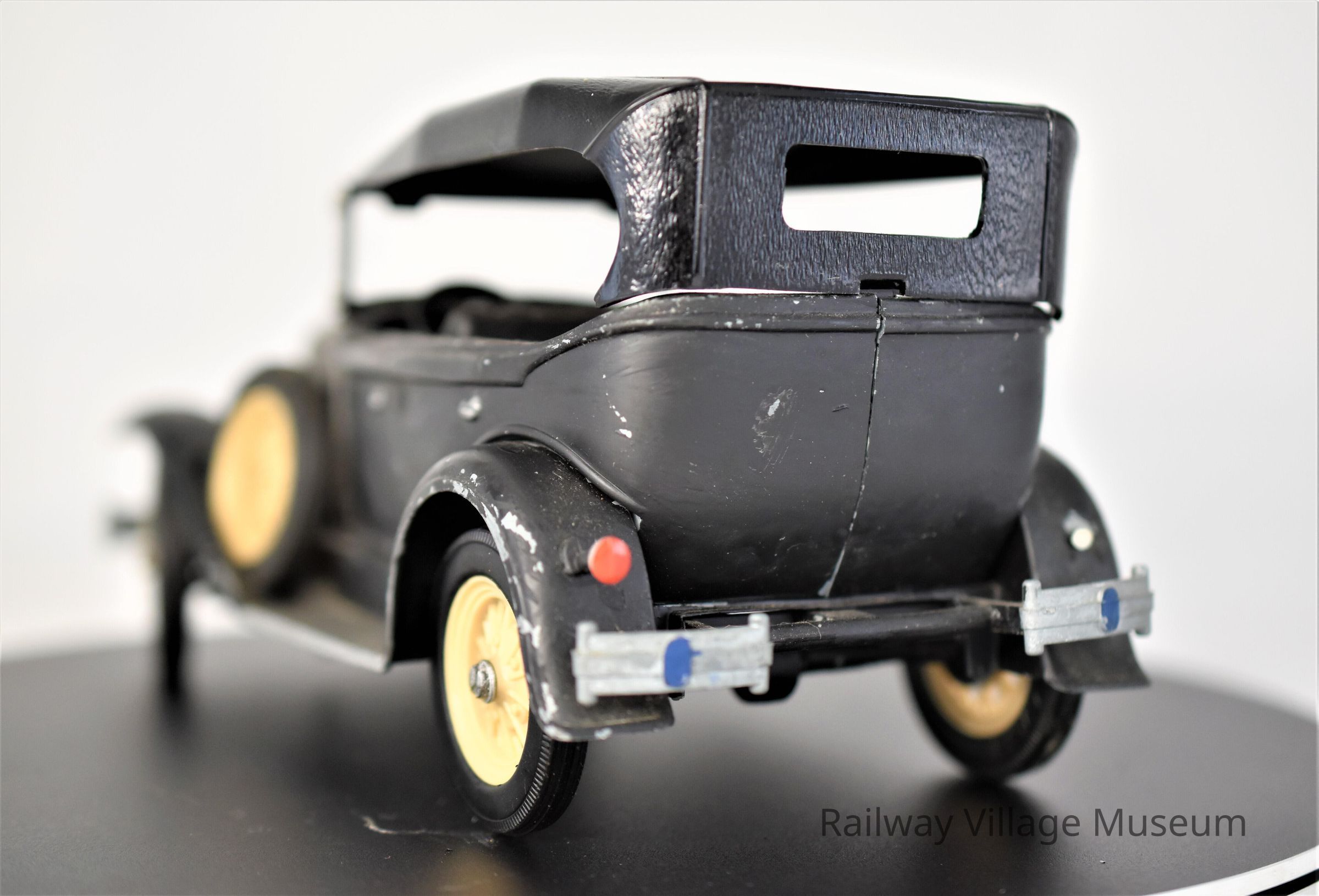 A Model A Ford Phaeton. This car was built from a kit, and appears to be complete. The tires are a cream color. This model appears to have been painted over by the previous owner. It is unknown if the original color was also black.Made/Created