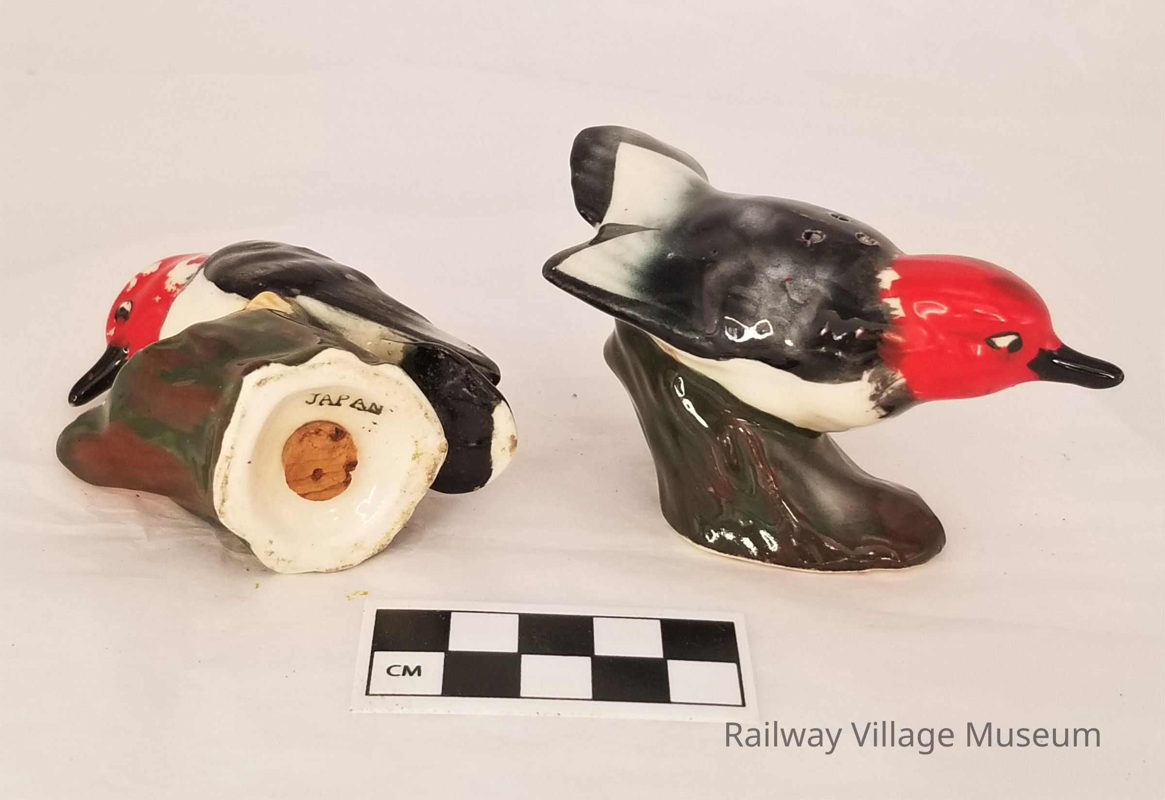 A pair of red-headed woodpeckers in different positions sitting on logs. Hand-painted ceramic shakers. Made in Japan. Some of the red paint on the heads of both woodpeckers is rubbed or chipped off. Cork stoppers are both in place.