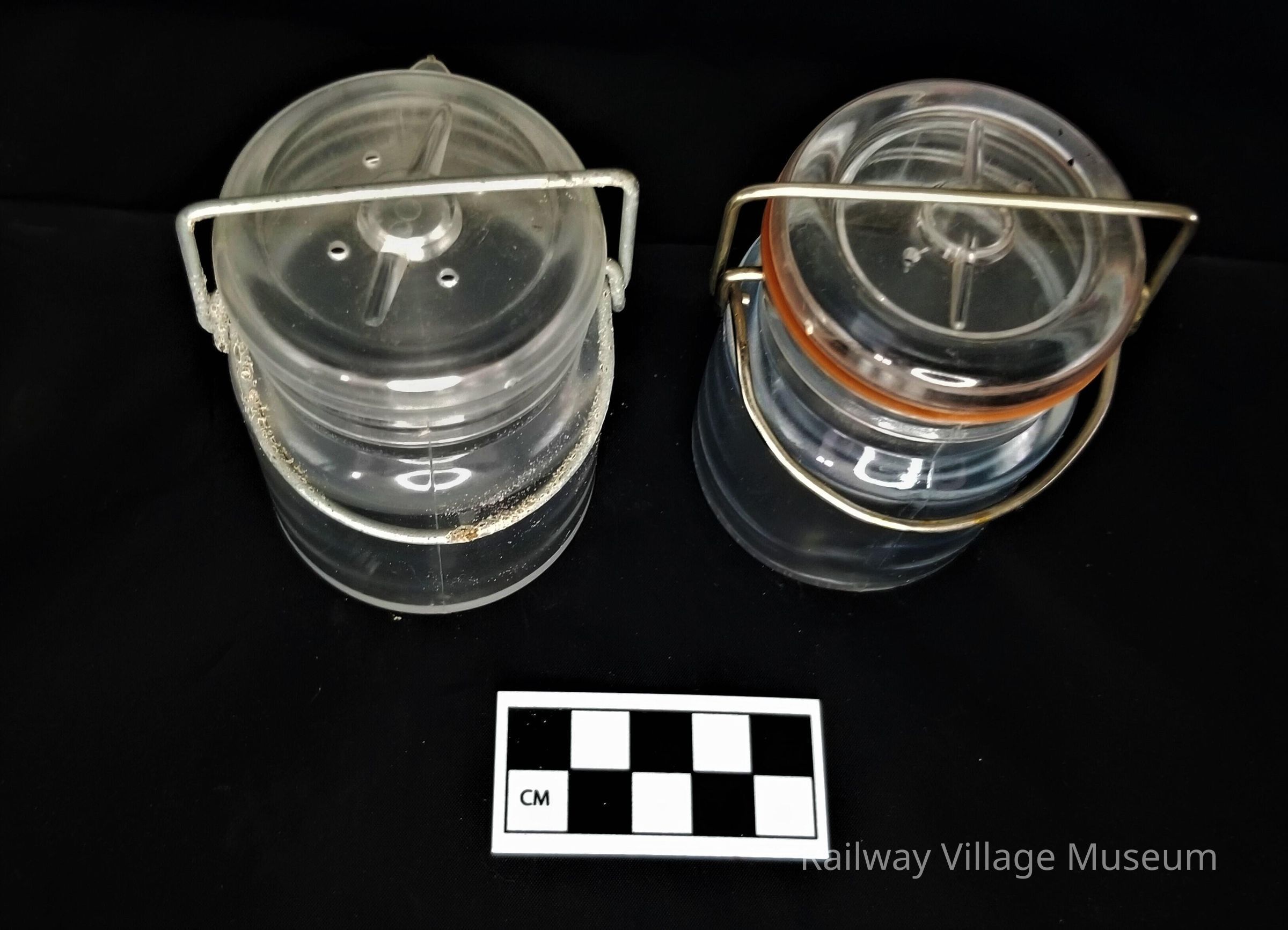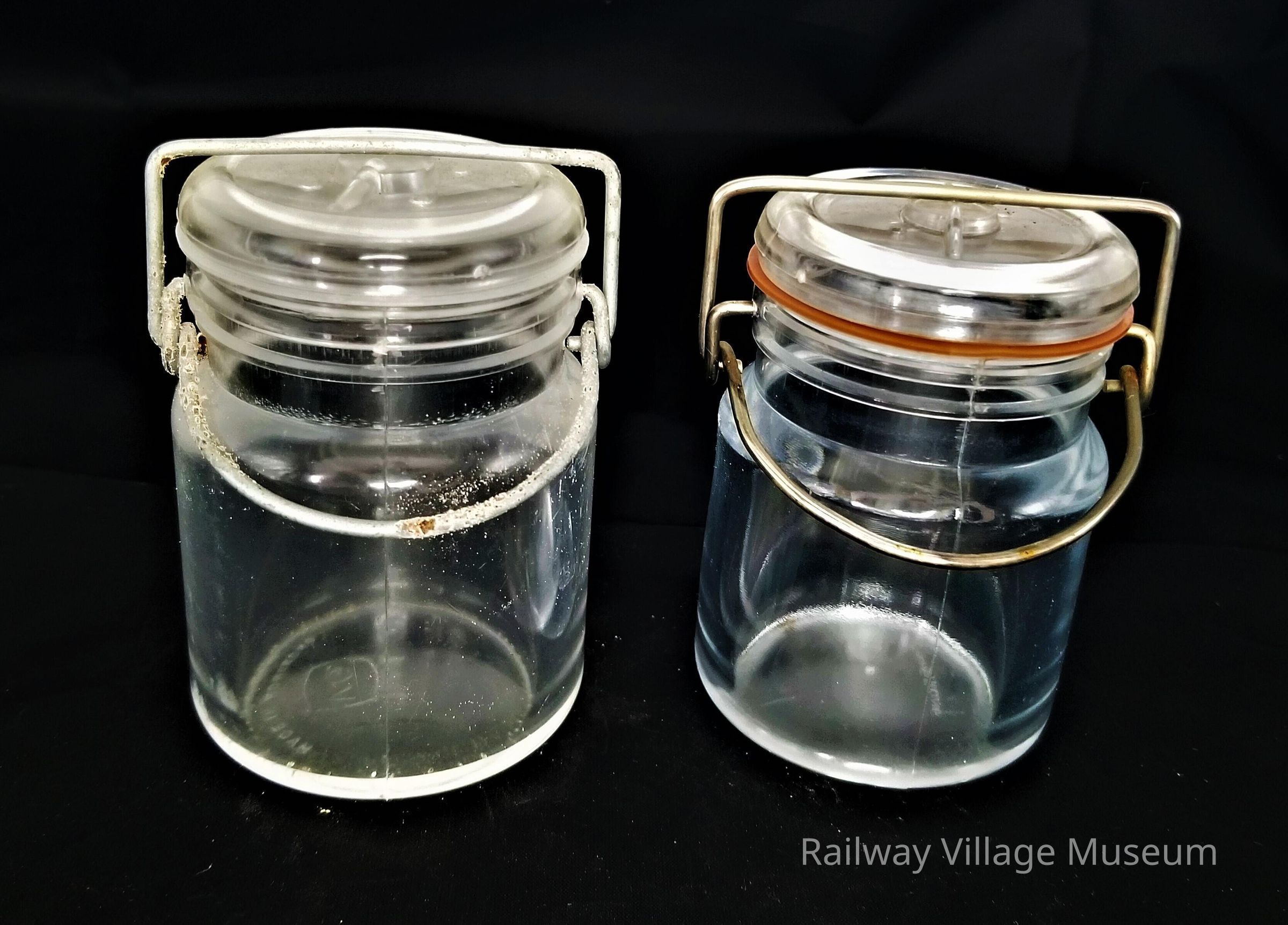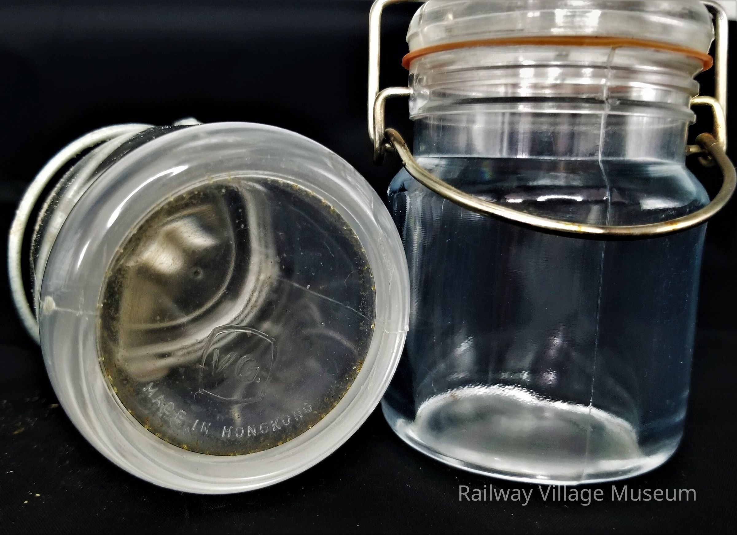 These plastic canning jar salt and pepper shakers were made in Japan. The metal mechanism locks the lids in place. Labeled on base with V.G Made in Hong Kong
