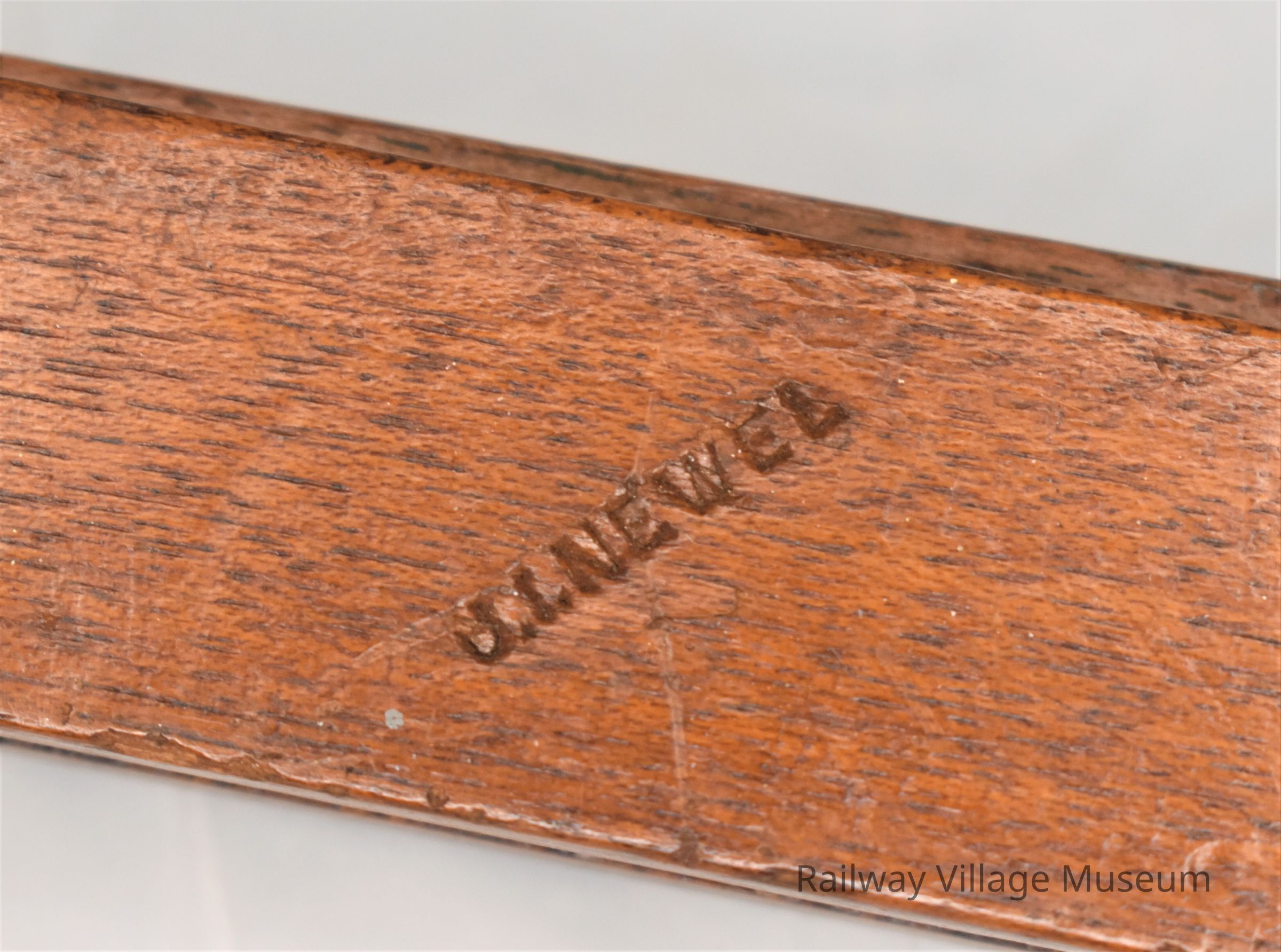 Wooden protractor with gold seal and labeled with owner: J.I.Newel.Use