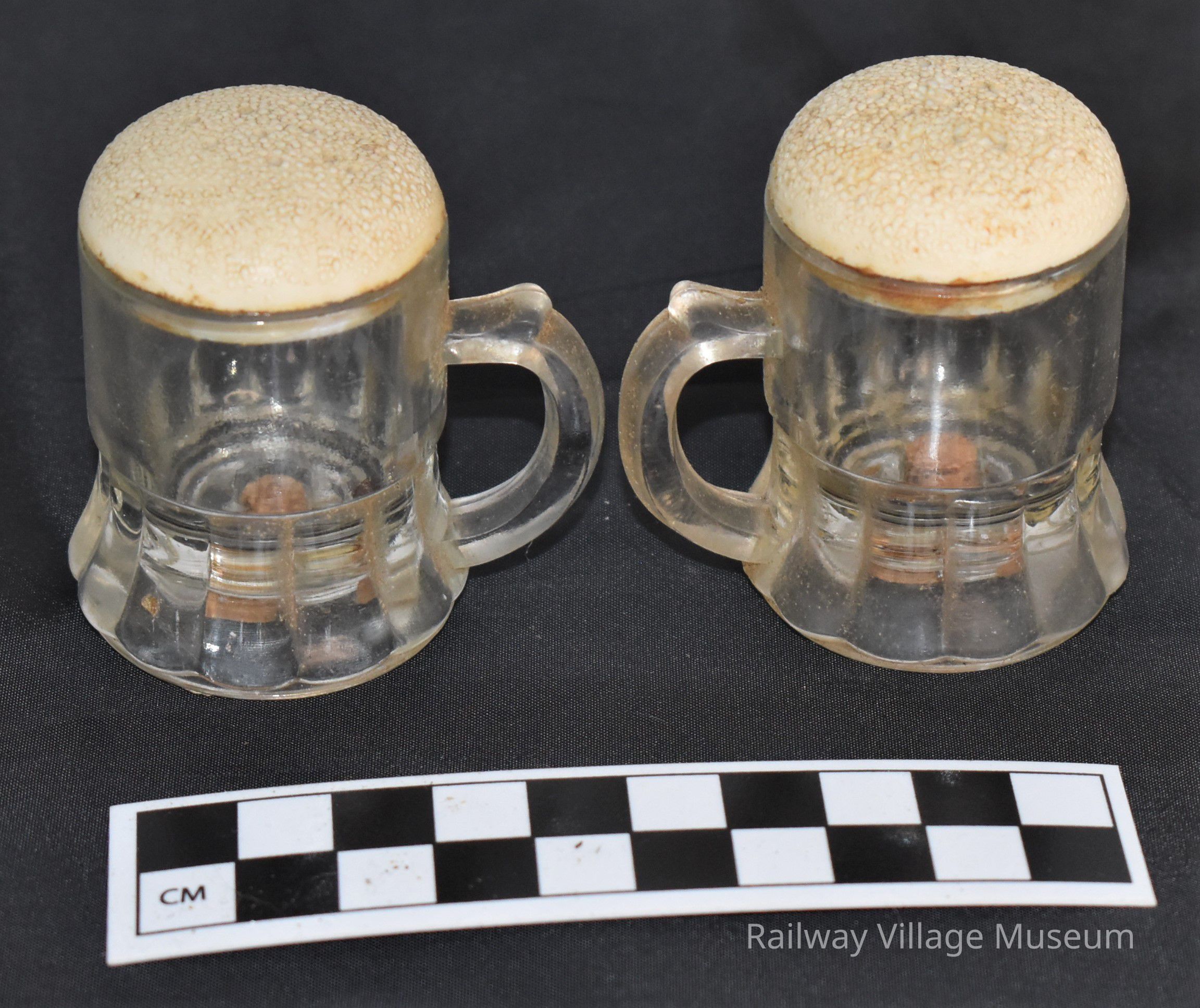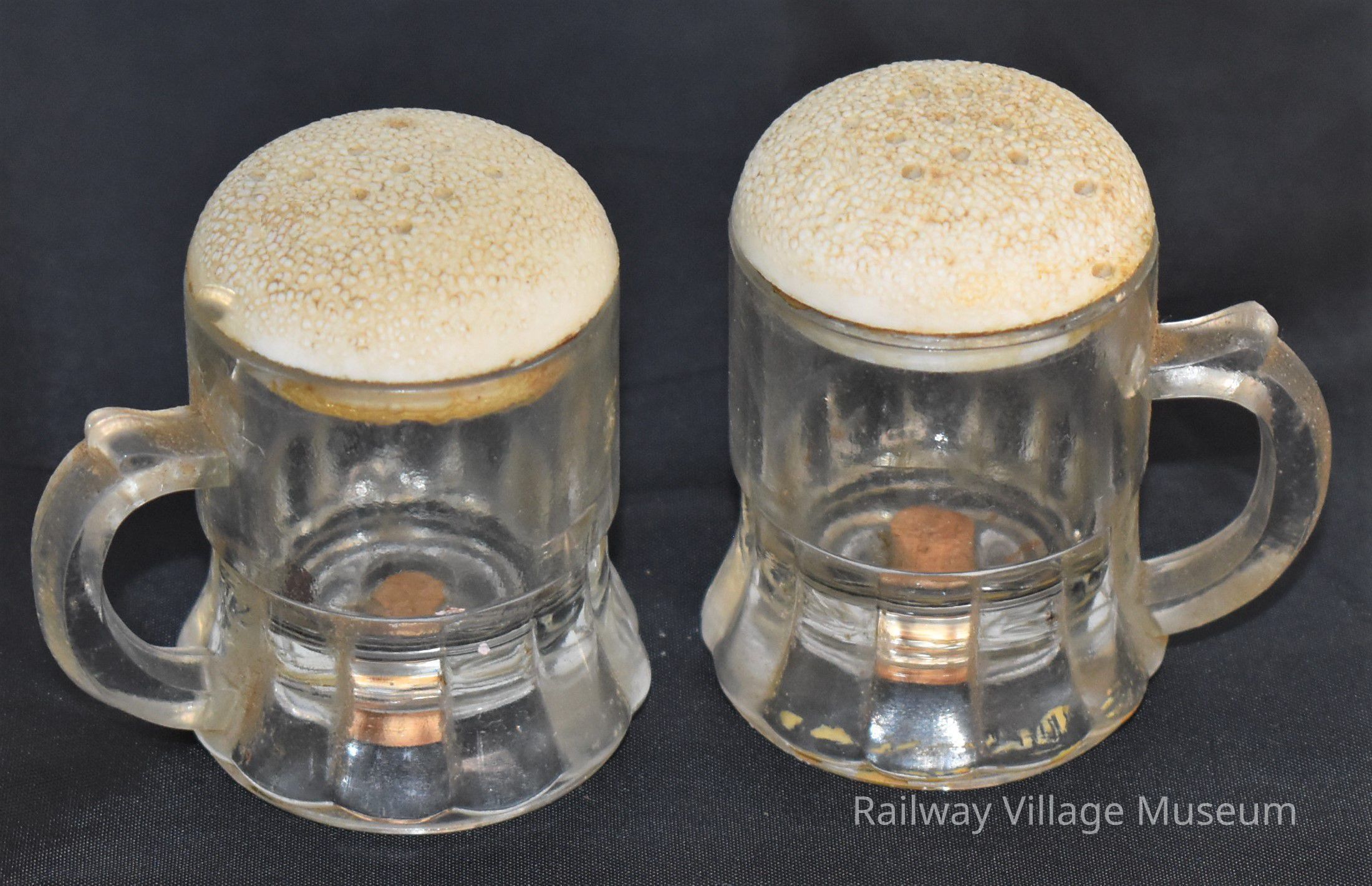 Vintage glass beer mugs with plastic tops resembling foam salt and pepper shakers.