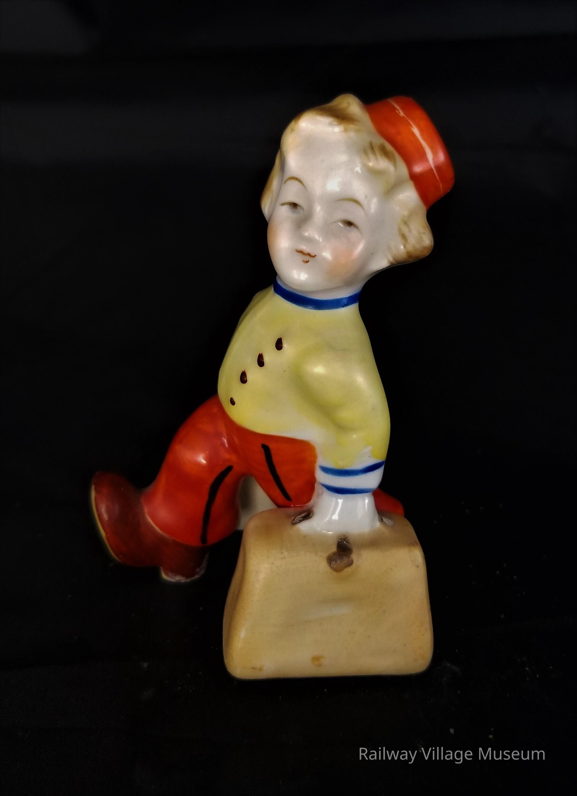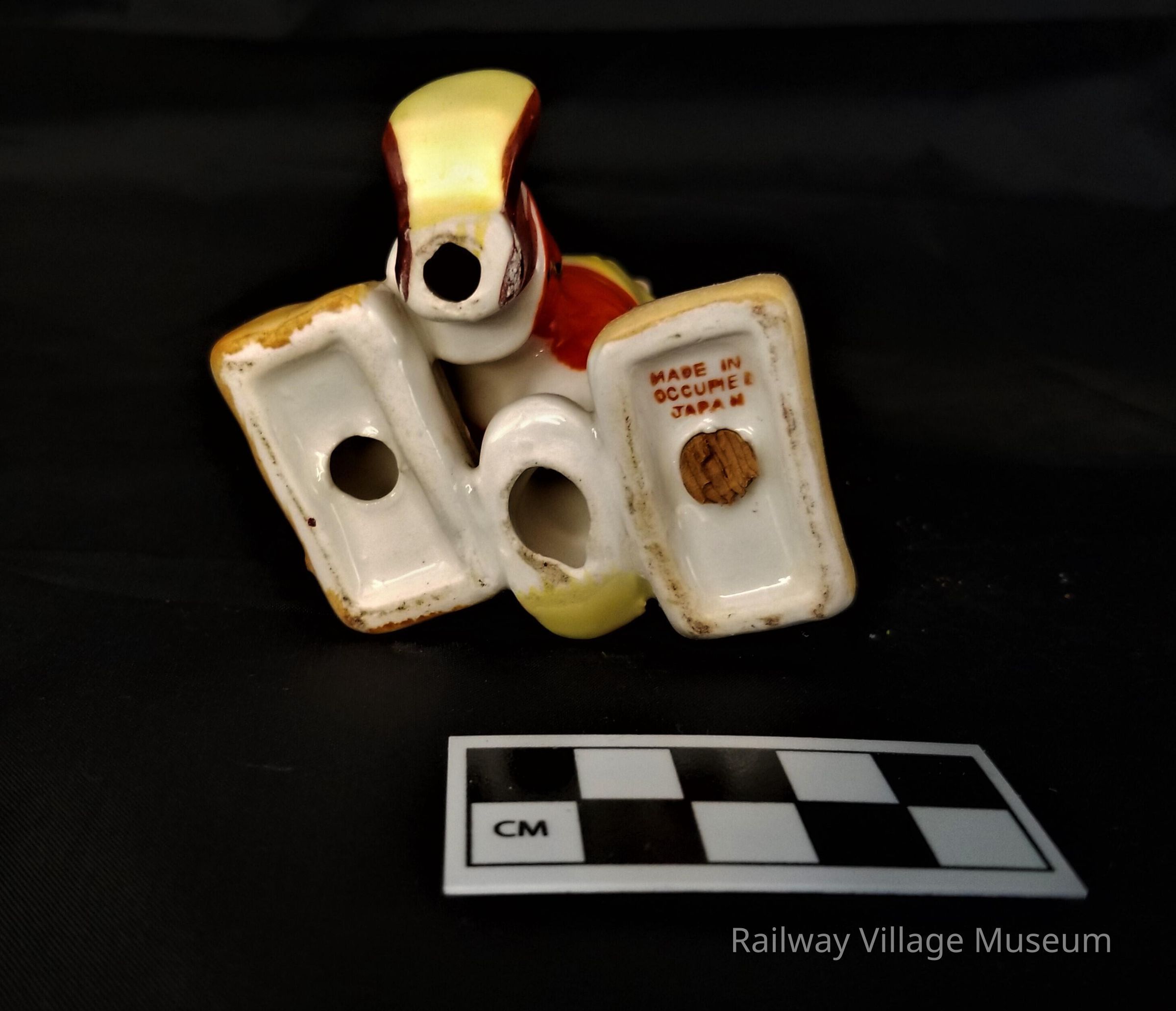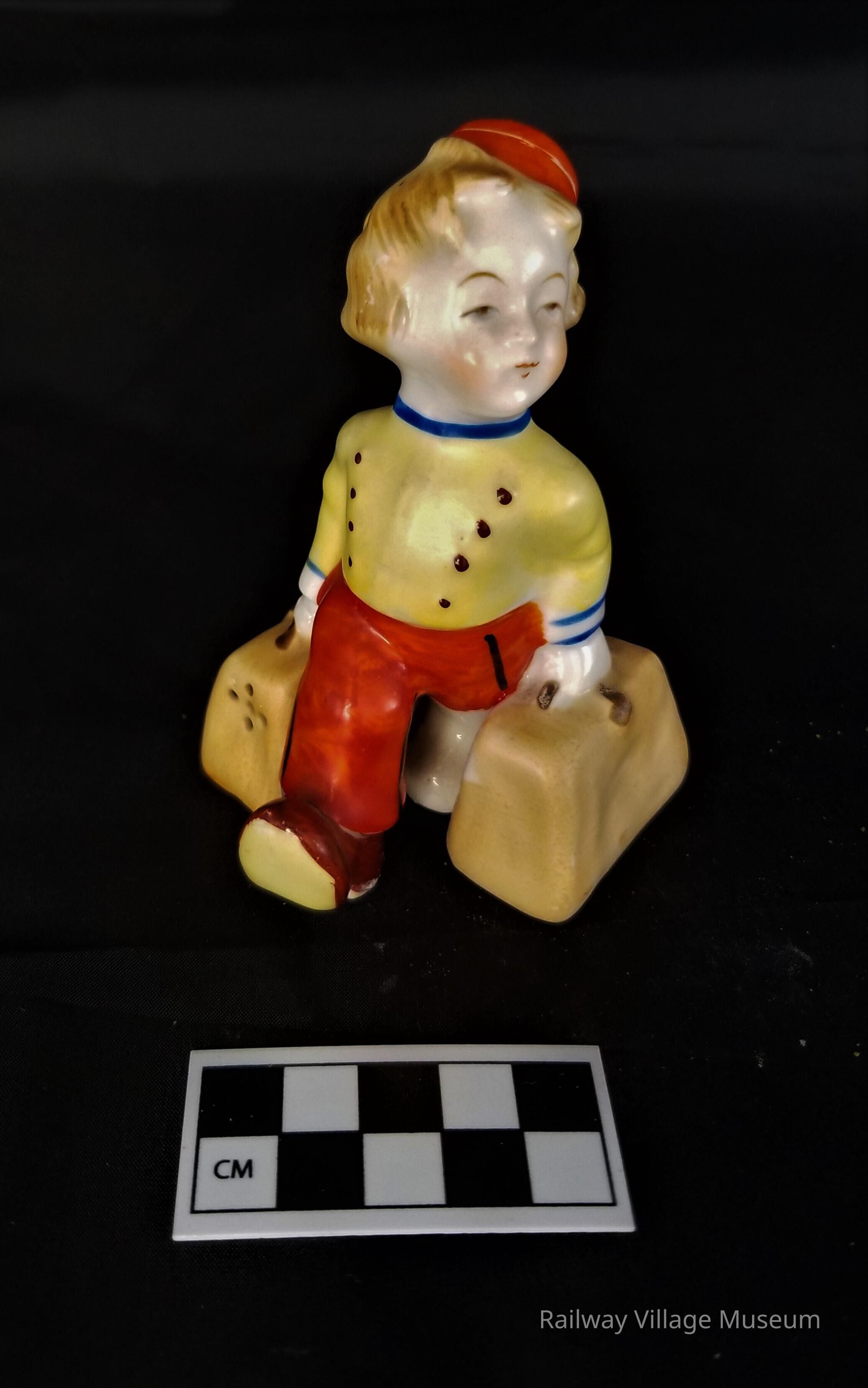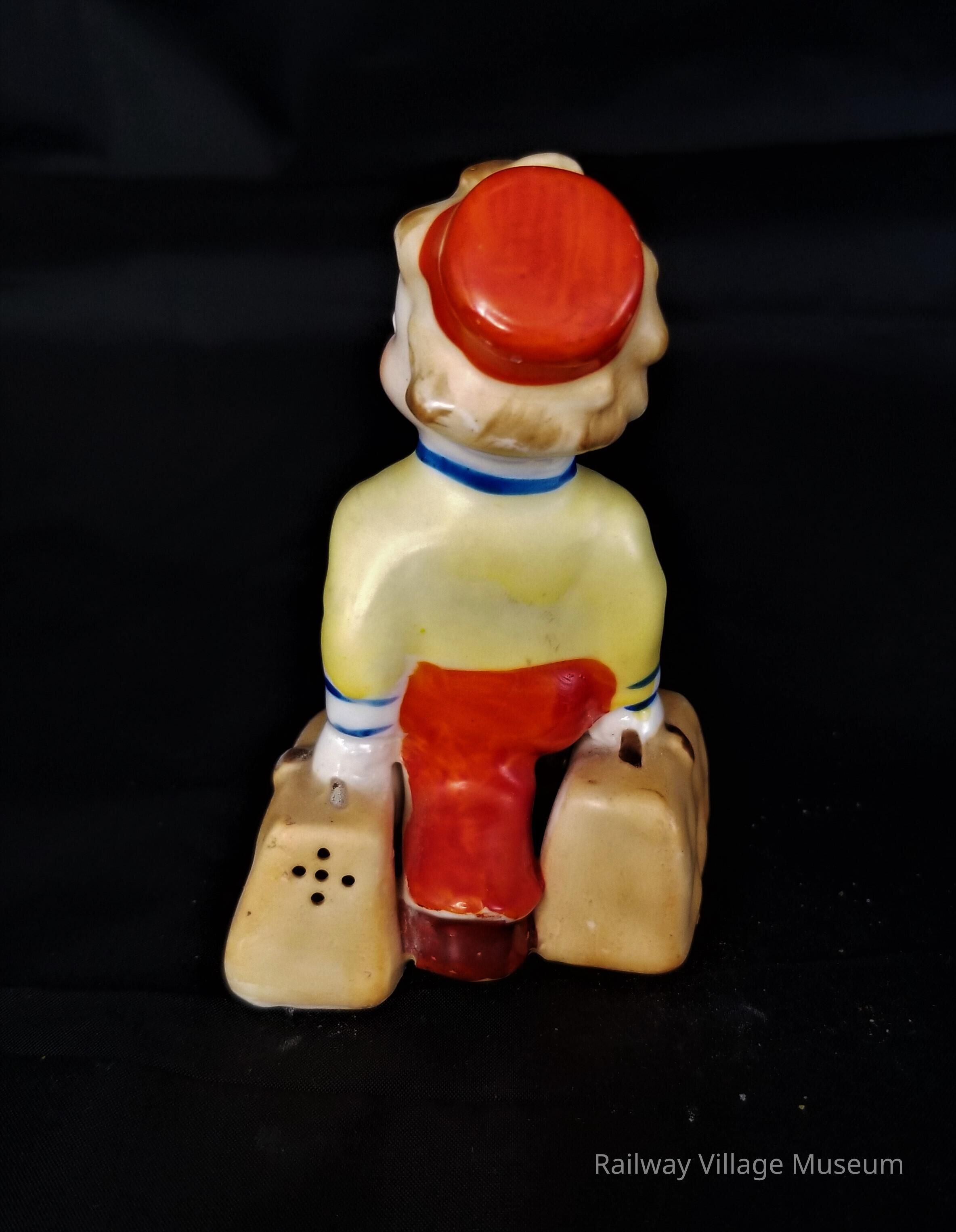 Ceramic hand-painted salt and pepper shaker made in occupied Japan. The suitcases held by the bell boy figure hold the salt and pepper. The holes are on the front of one suitcase and the back of the other so depending what direction you shake you get your salt or your pepper.