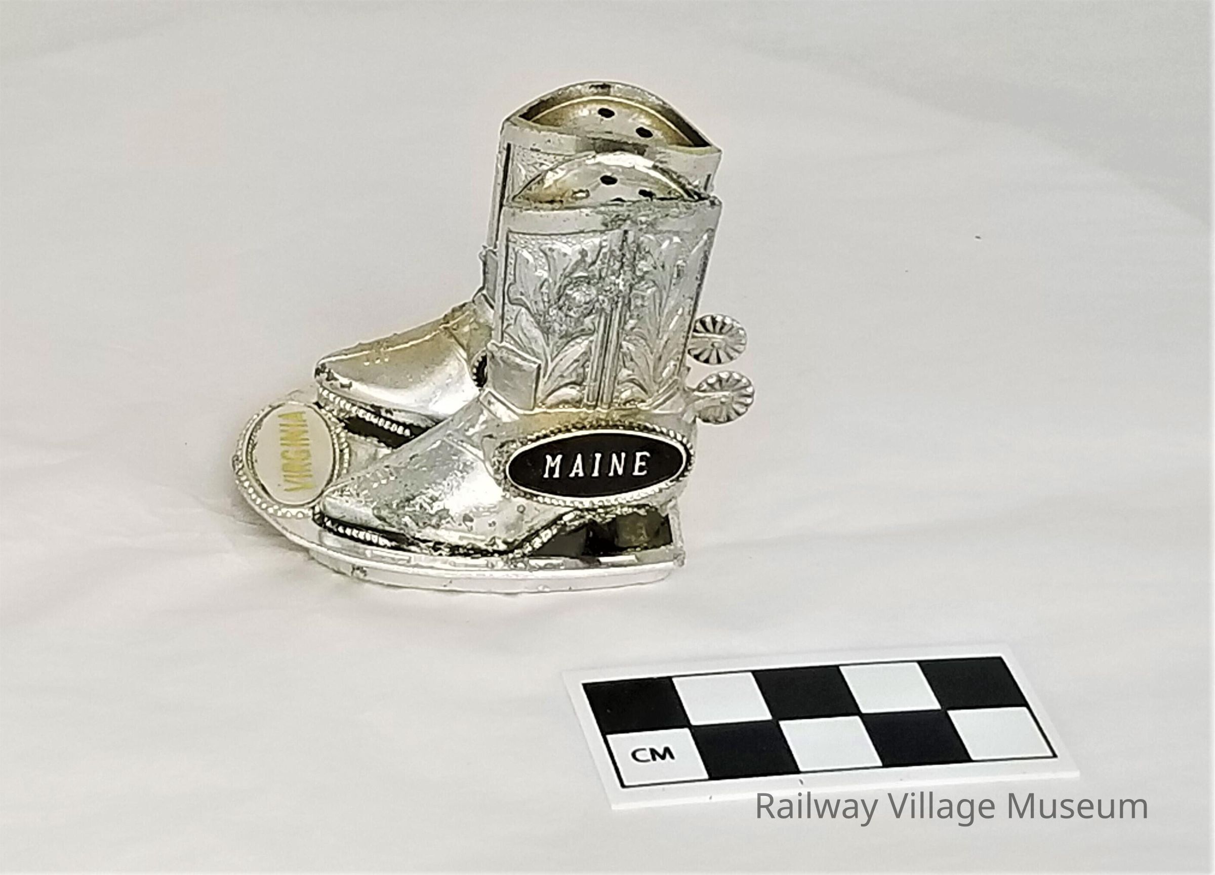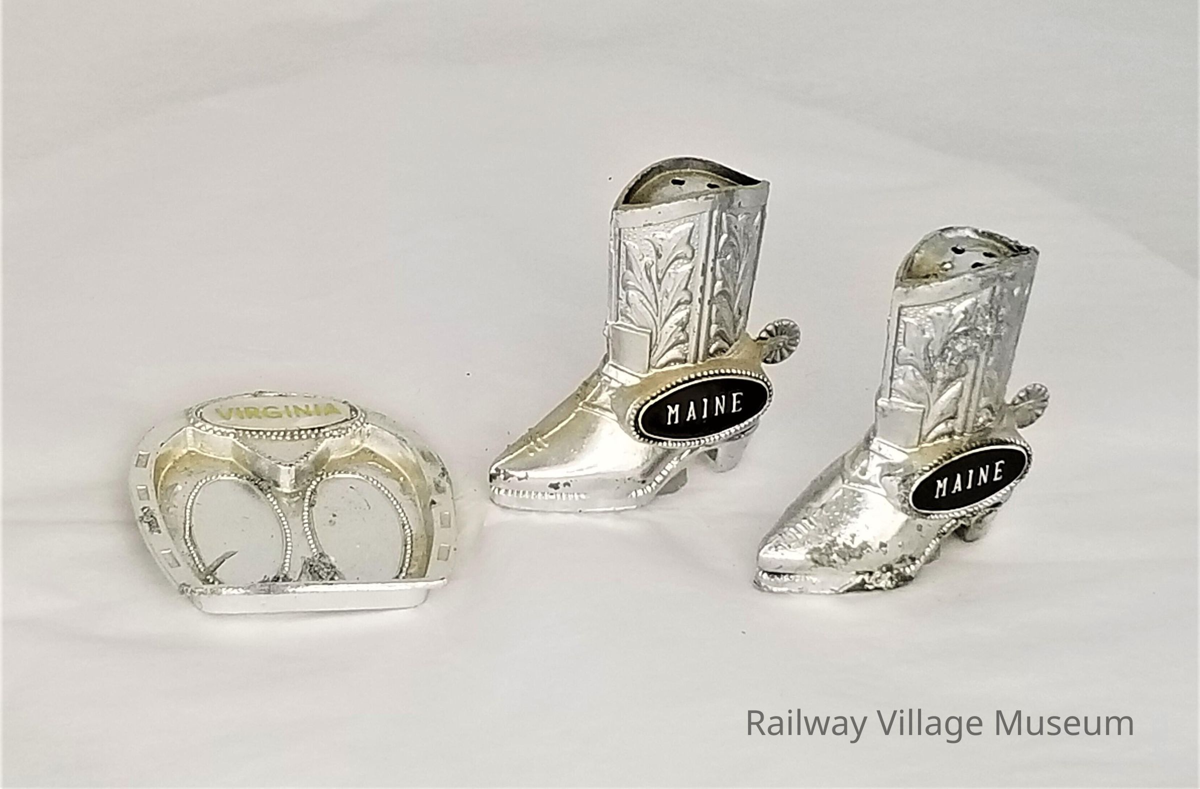 This shaker set consists of two boots as shakers and a small stand. These were likely not part of the original set as the stand is marked with "Virginia" and the boots are each marked with "Maine". A common set that is often marked with various states or tourist locals. Made in Japan.