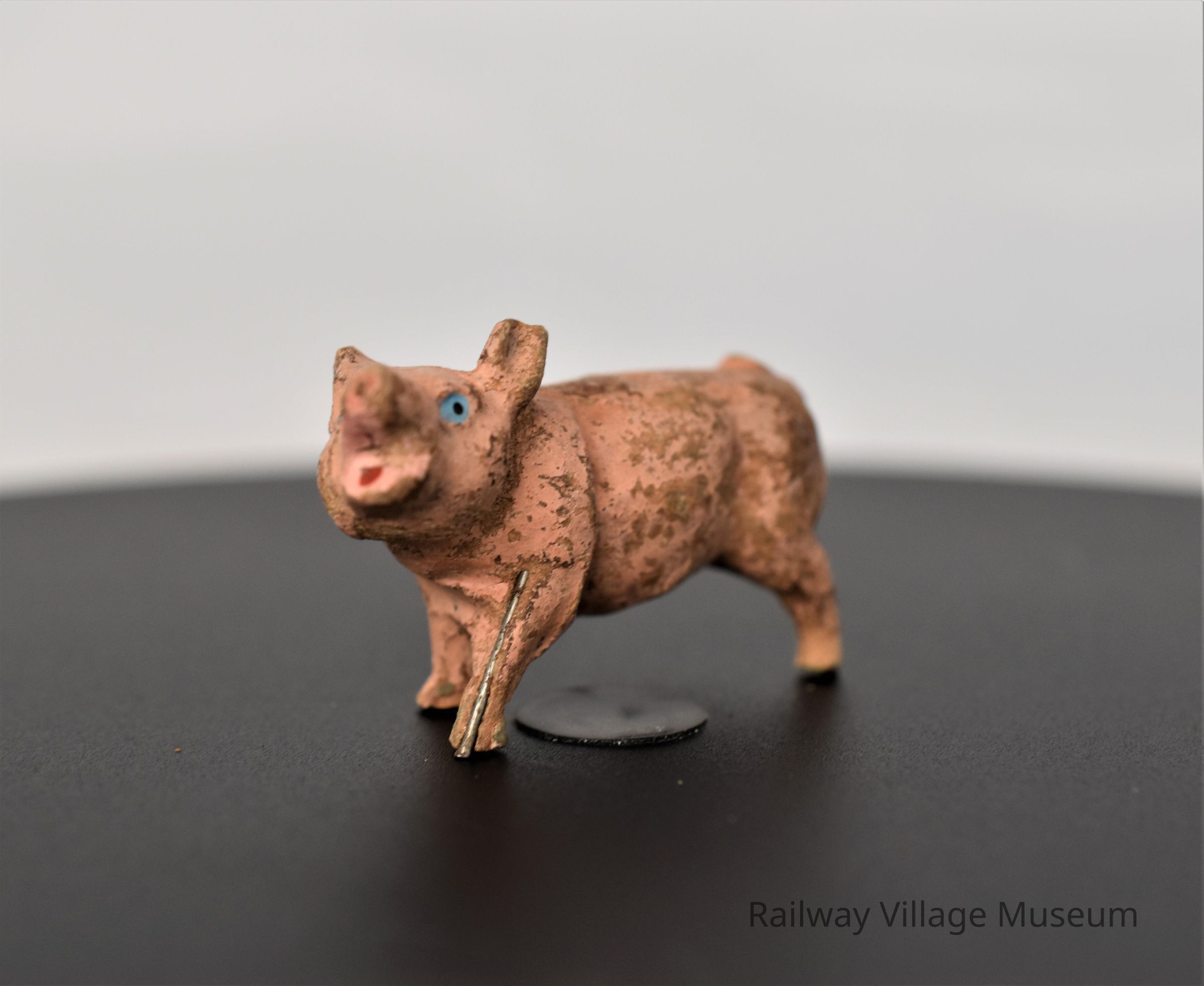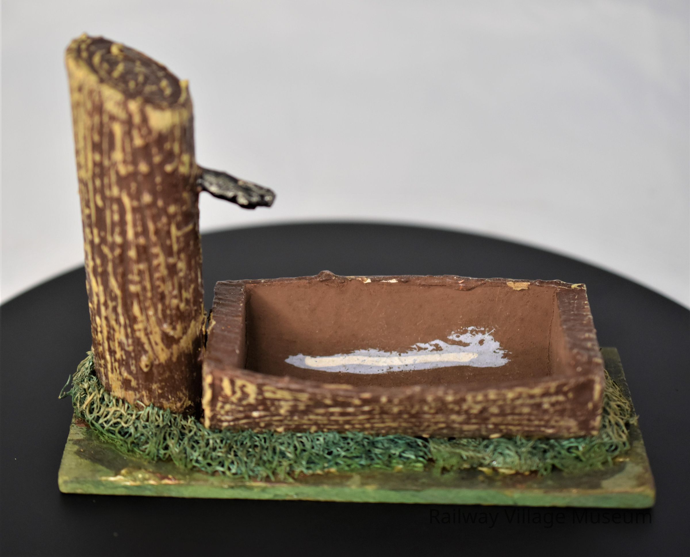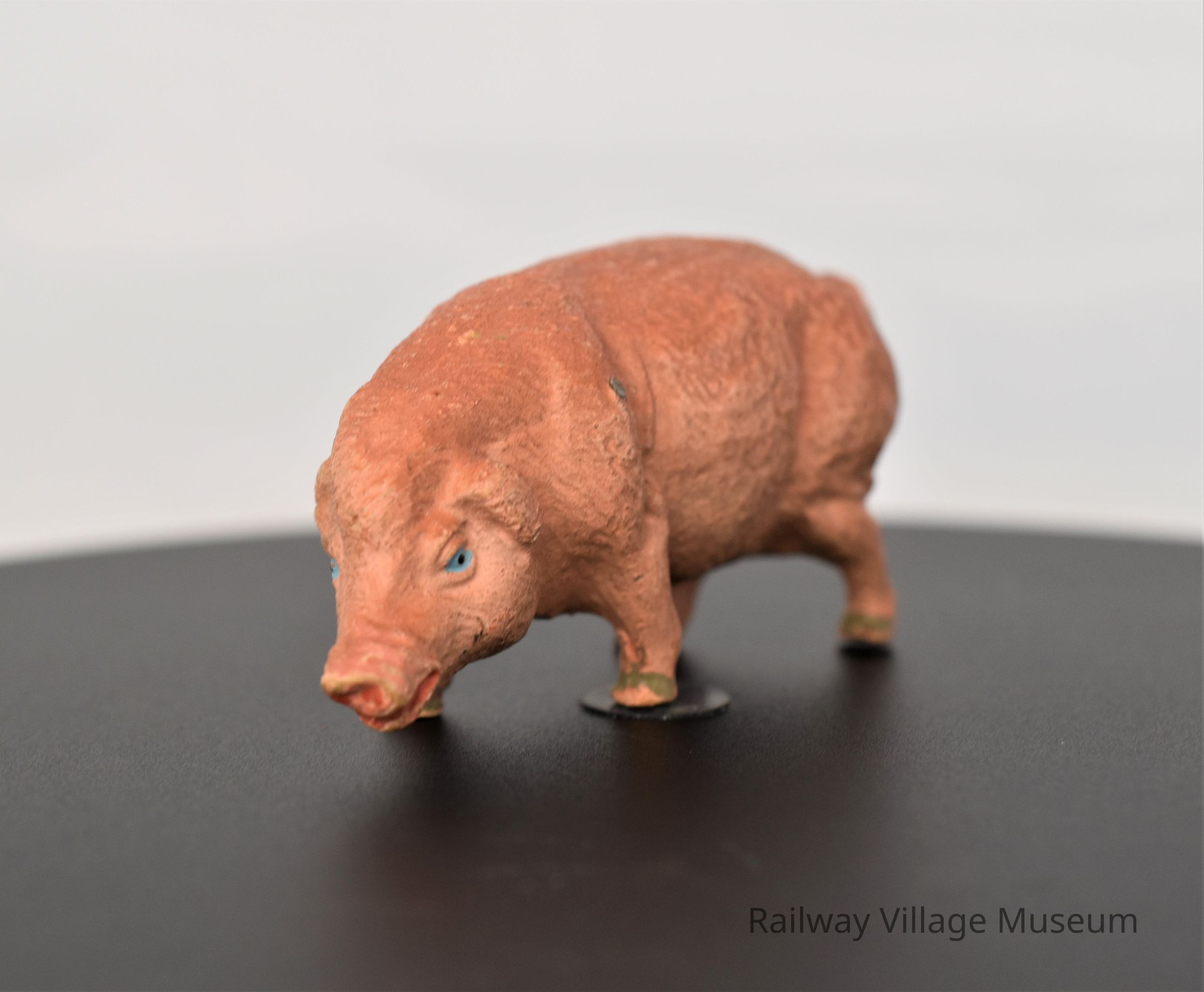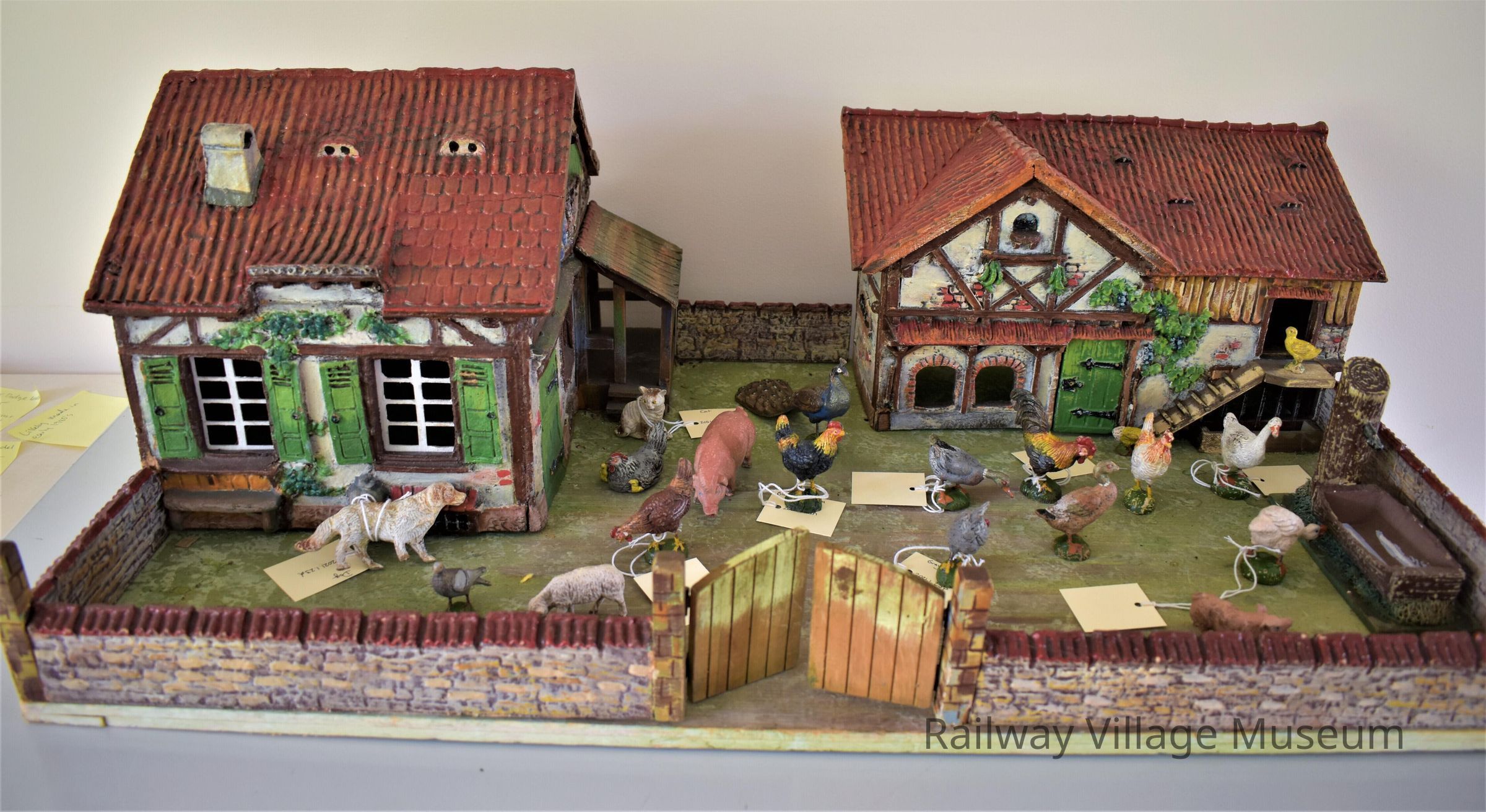 An Elastolin farm set. The animals are all made out of a composite material that is most likely sawdust and glue. The gate and trough are made out of wood.
