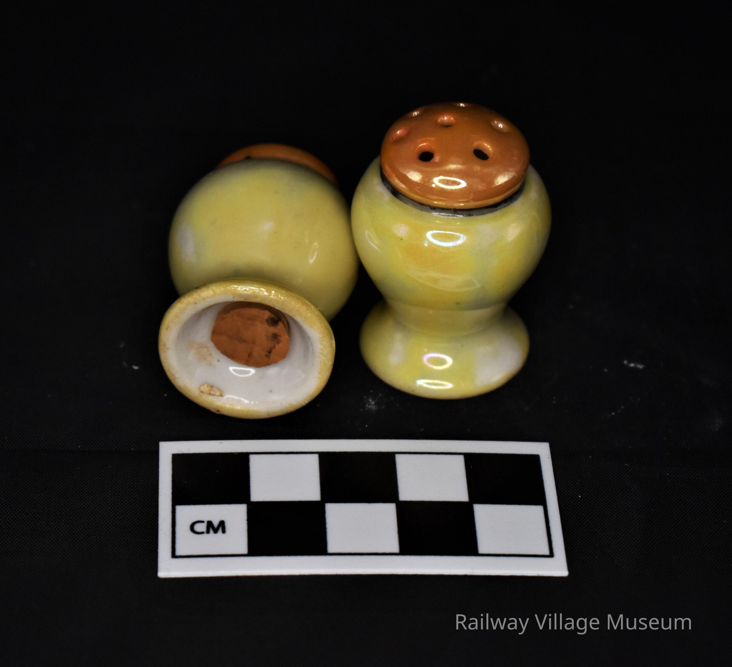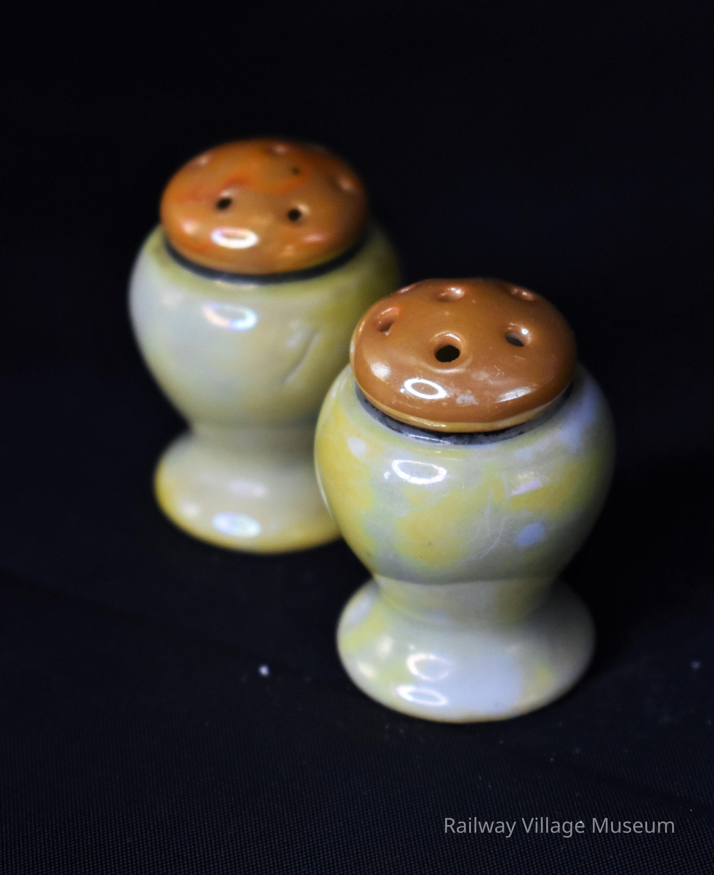 These ceramic mini salt and pepper shakers are painted in a glazing style called "luster" which gives an iridescent finish. One has a cork intact, and the other's cork has been pushed inside the shaker body. They are both unmarked.