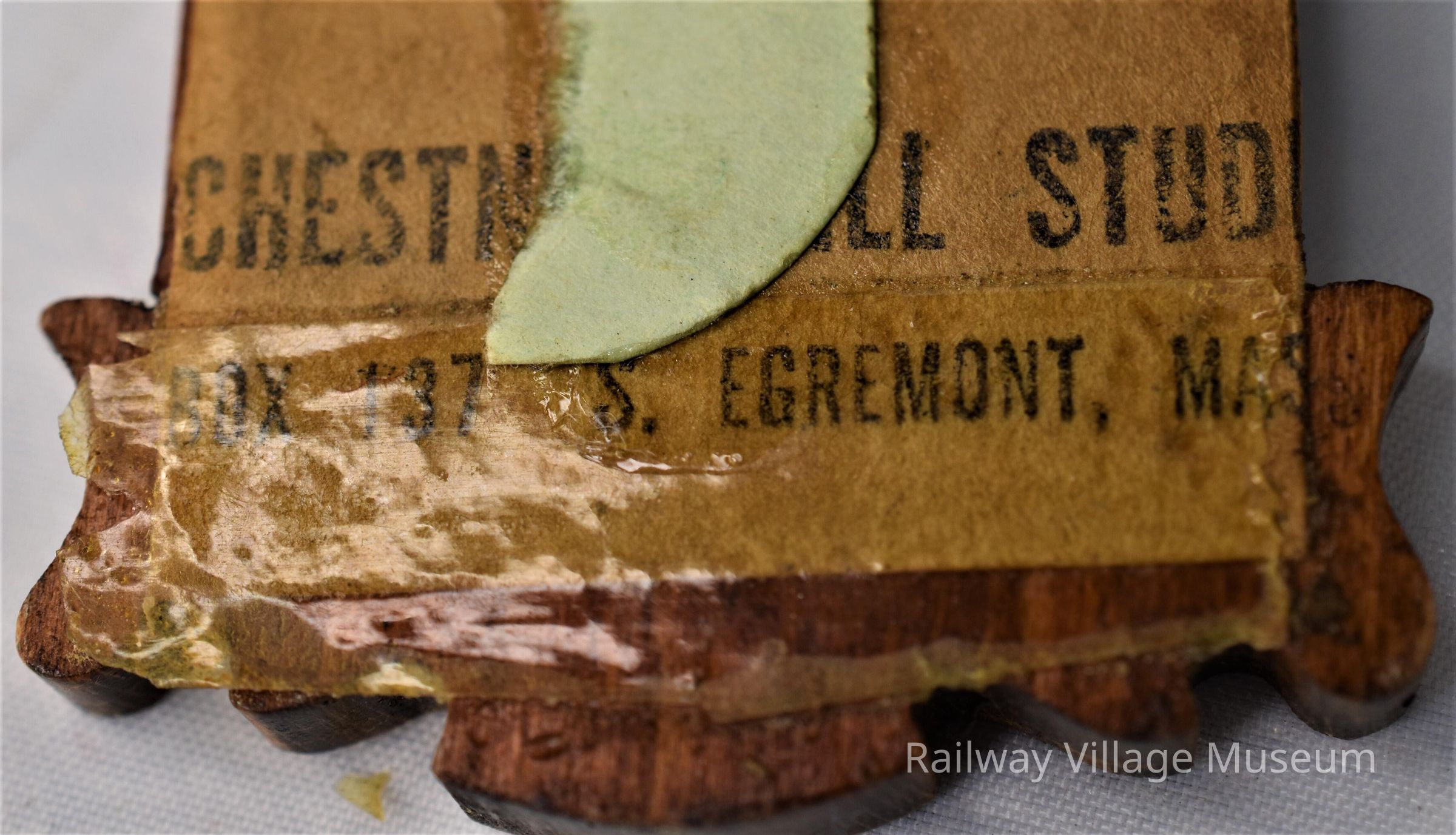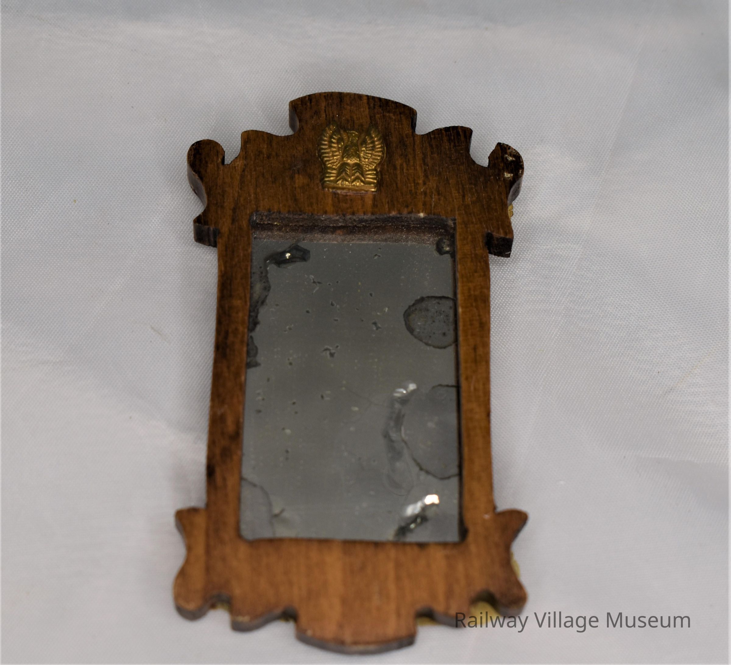 A wooden mirror, by an unknown maker. There is a stamp on the back with a name and an address, but search results yielded nothing relating to the stamp.Lexicon