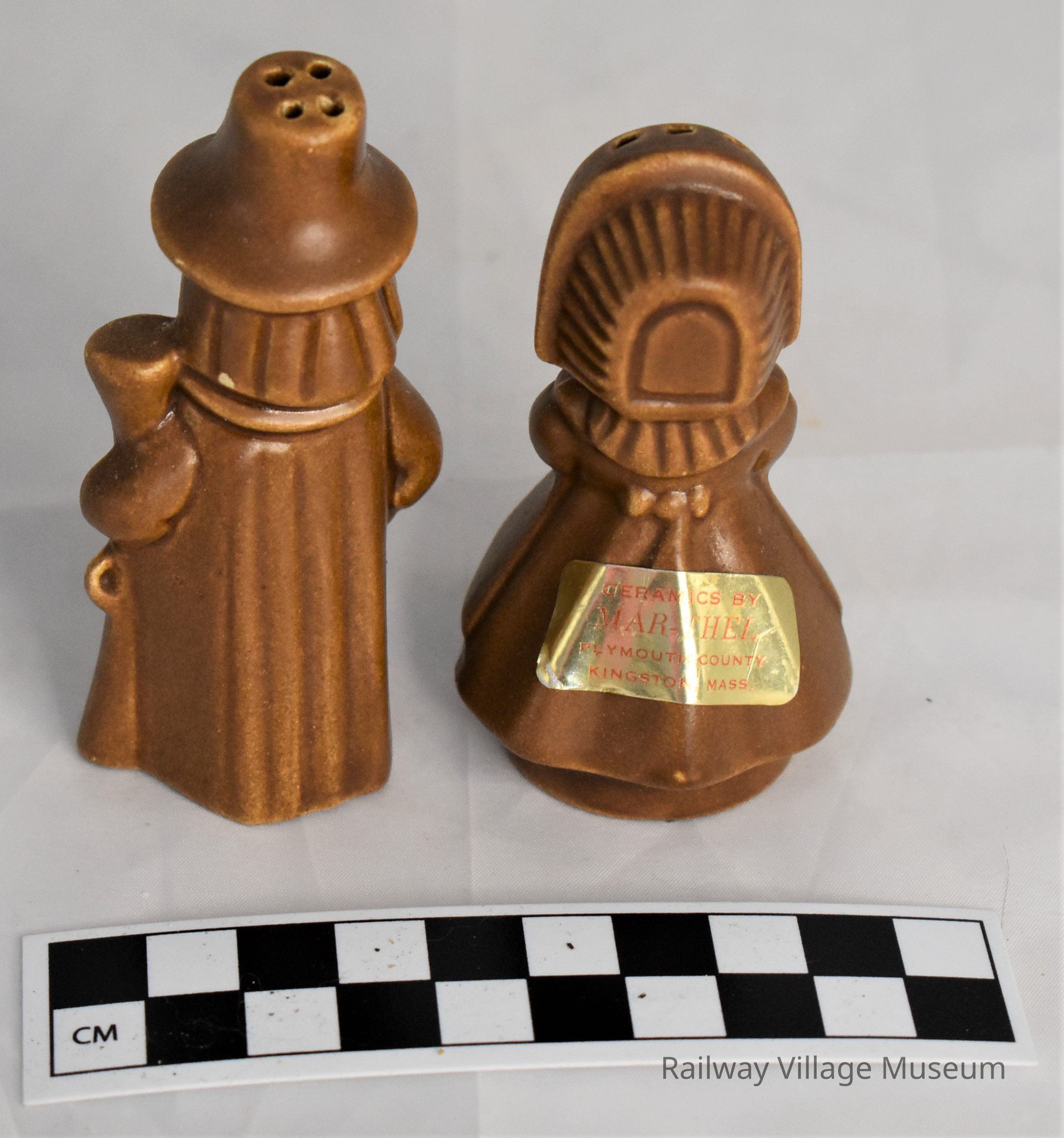 Ceramic pilgrim salt and pepper shakers made by Mar-Thel Ceramics in Plymouth County Kingston, Mass. These were originally sold at a wax museum in Massachusetts. Original label on woman shaker.