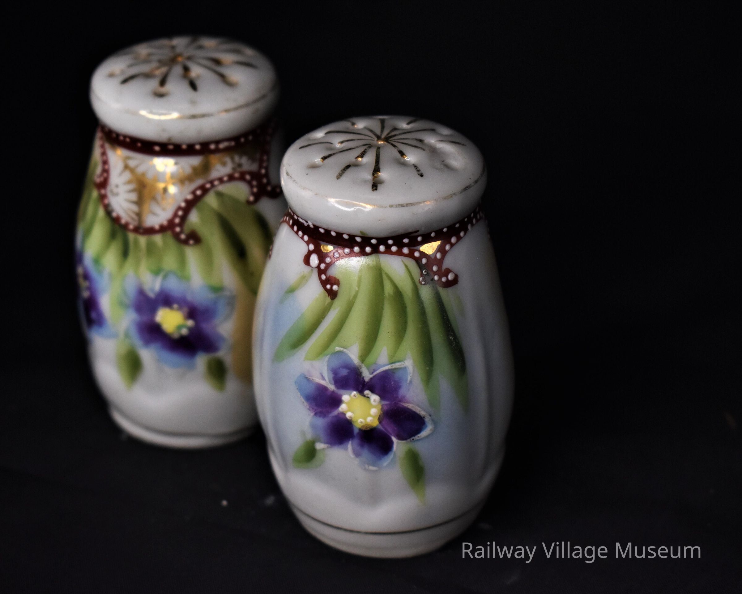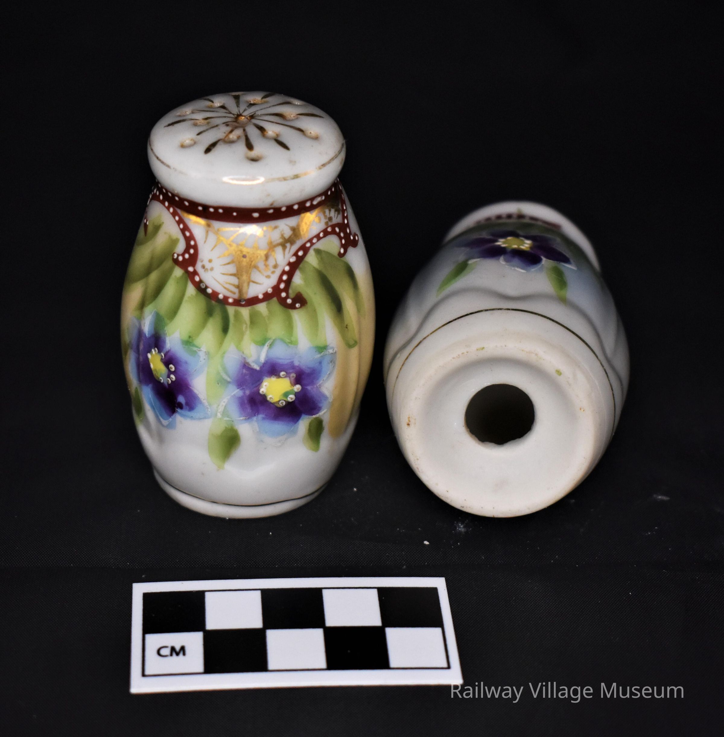 Hand-painted ceramic shakers with matching blue floral motifs. red and gold detailing on the necks and gold on the tops. Shakers are unmarked. Neither shaker has stopper intact.