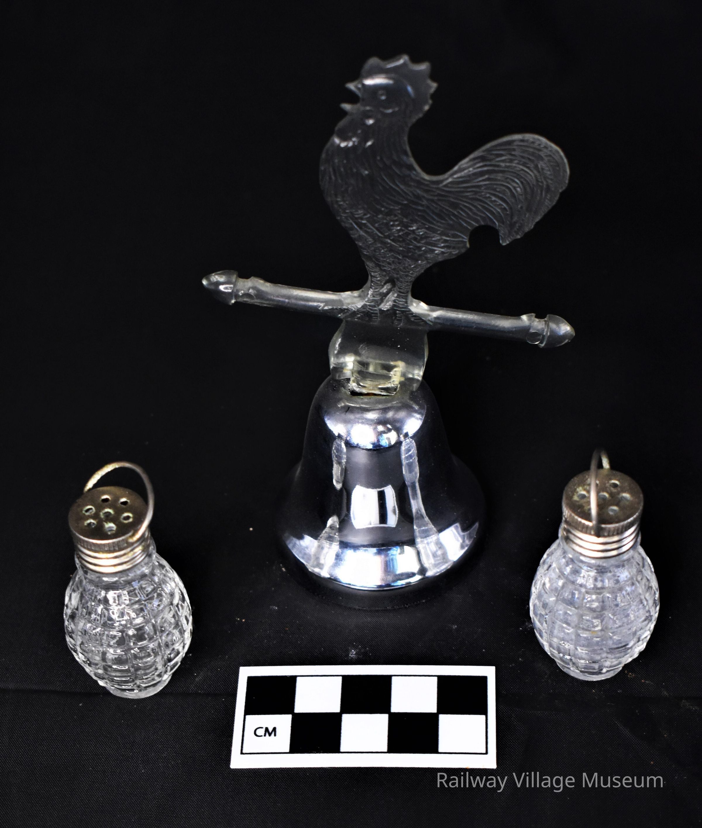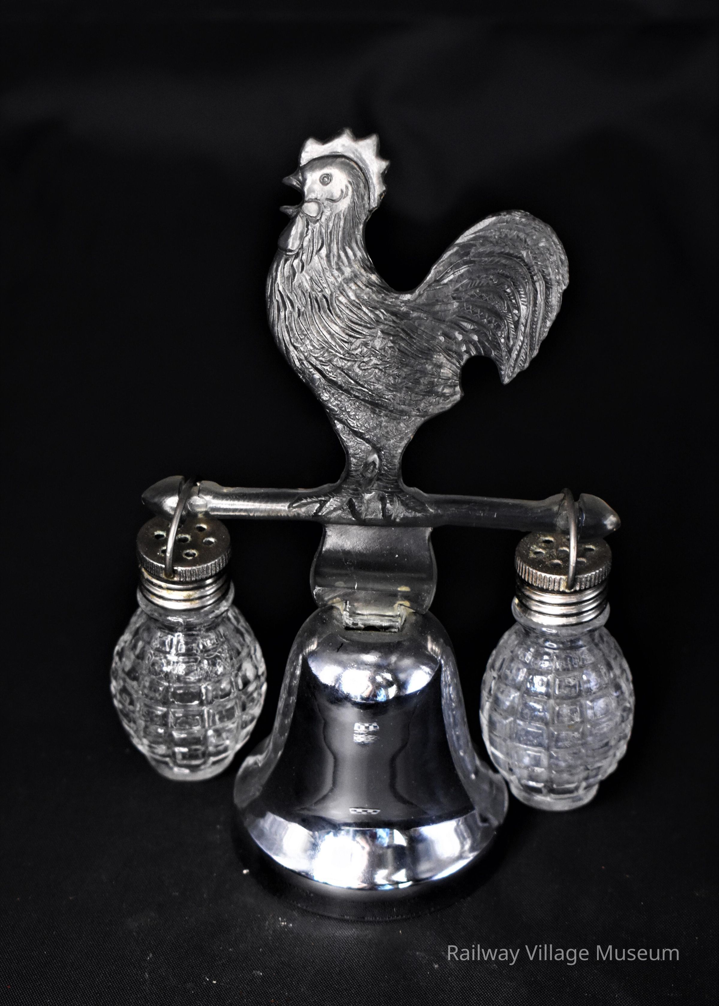 Metal bell topped with a thin plastic rooster perched on a crossbar holding glass and metal lantern shaped shakers. They are unmarked.