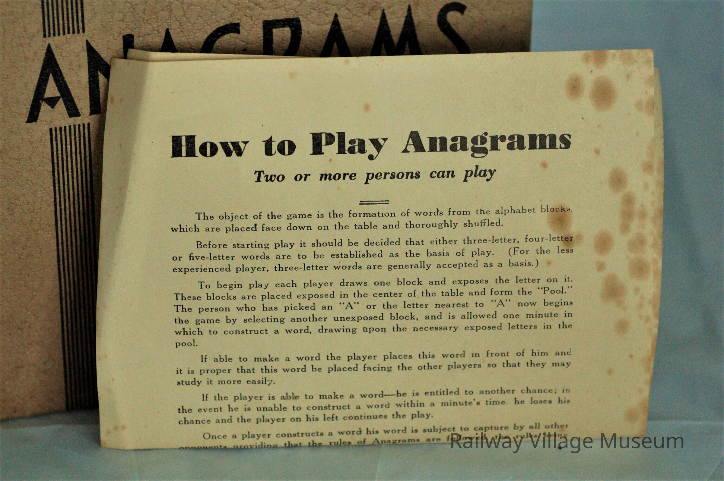 Anagrams is a precursor to the game Scrabble. Anagrams was originally produced in 1934. This edition by the Selchow & Righter Co. dates to the 1940's.