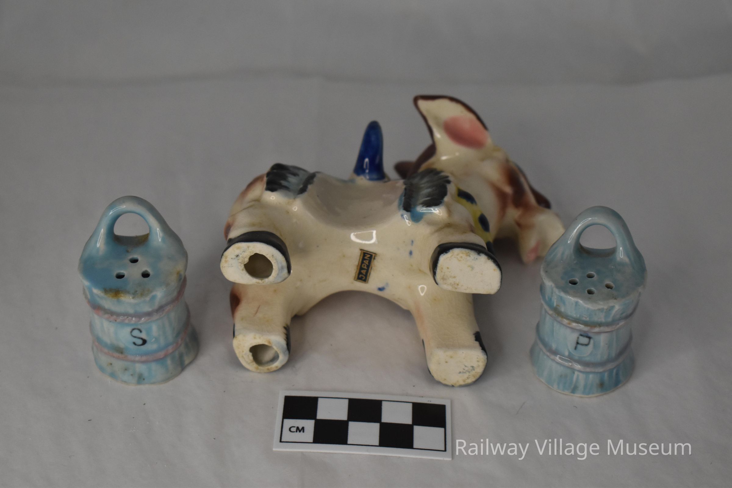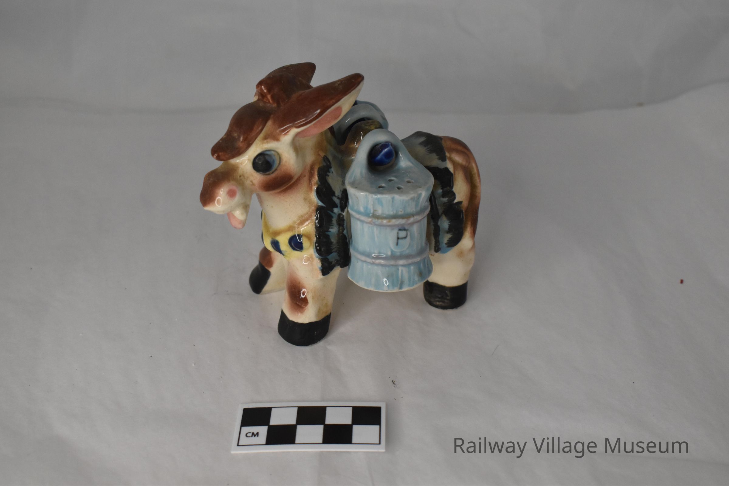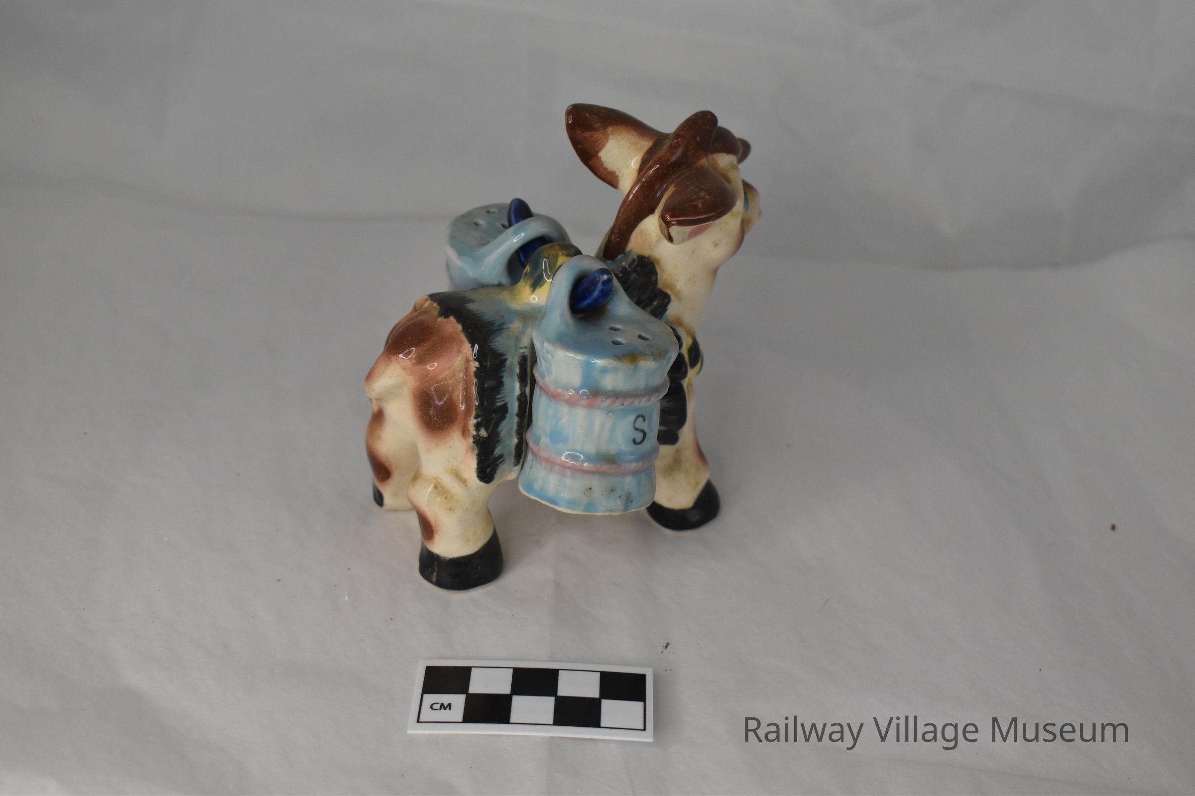 Ceramic donkey with panier shakers that hang from the donkey's back. Made in Japan. Manufacturer unknown but is possibly by the OV Co. Cork stoppers intact.