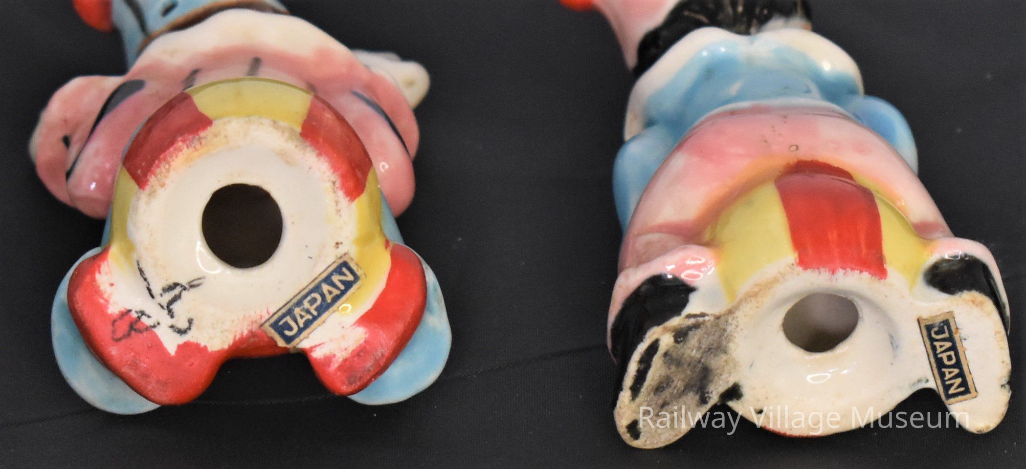 Vintage colorful ceramic circus clowns salt and pepper shakers. Original "Japan" labels on the bottom of each shaker.
