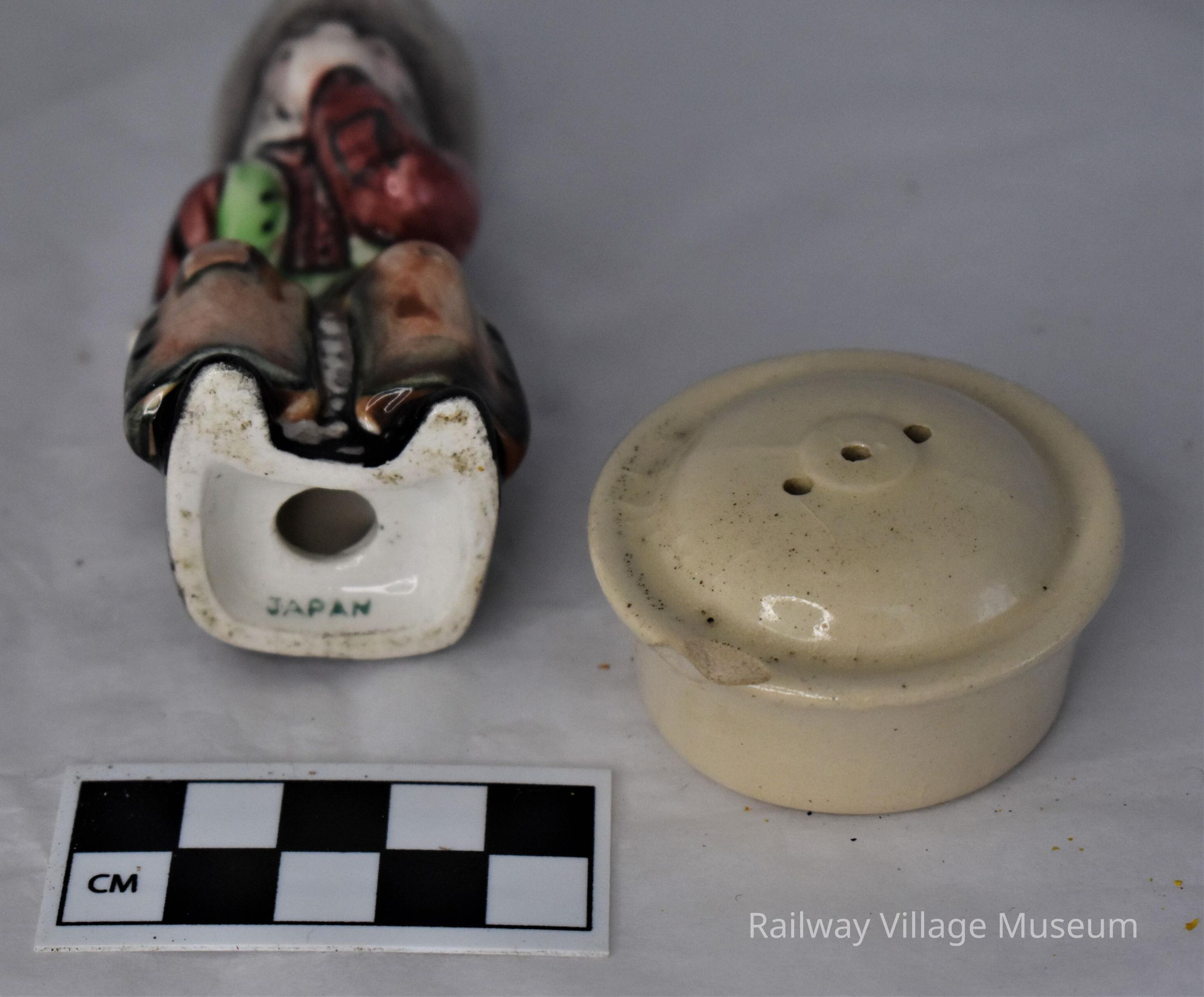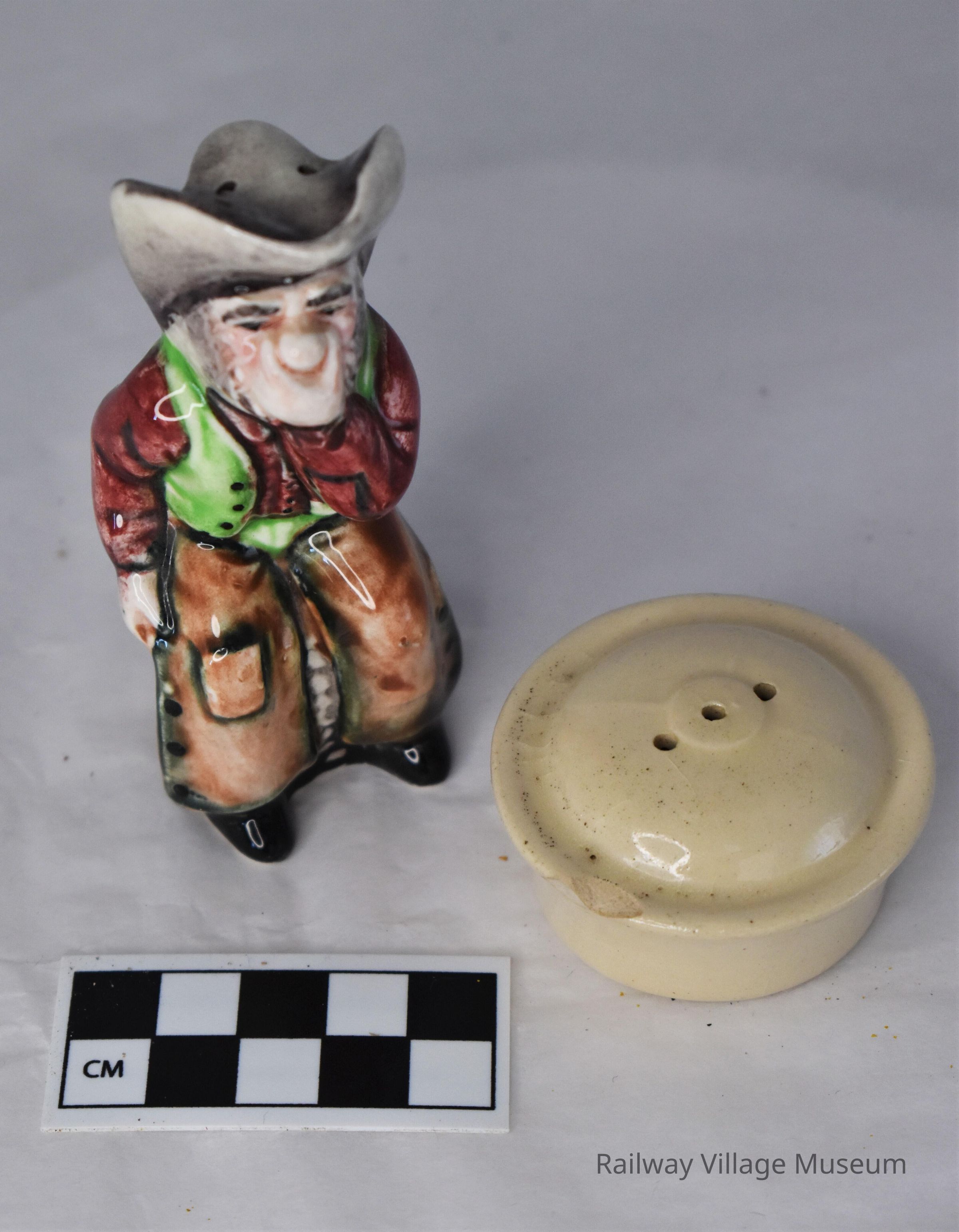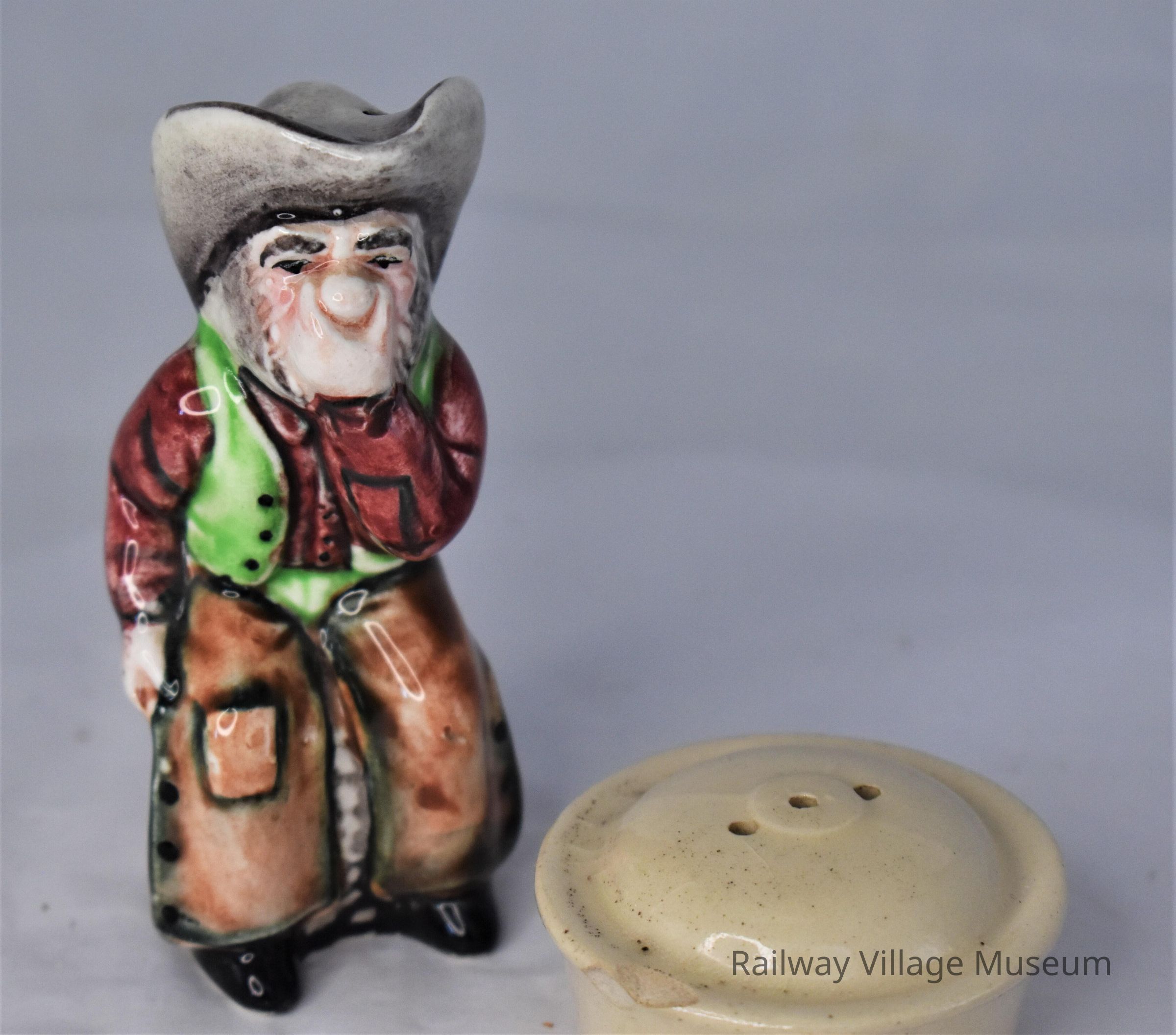 This quirky ceramic salt and pepper shaker set includes a pepper shaker cowboy wearing chaps and a vest sitting on a log holding his nose and saltshaker chamber pot. Though the chamber pot is unmarked, the cowboy is marked with a "Japan" label. Neither shaker still has its stopper.