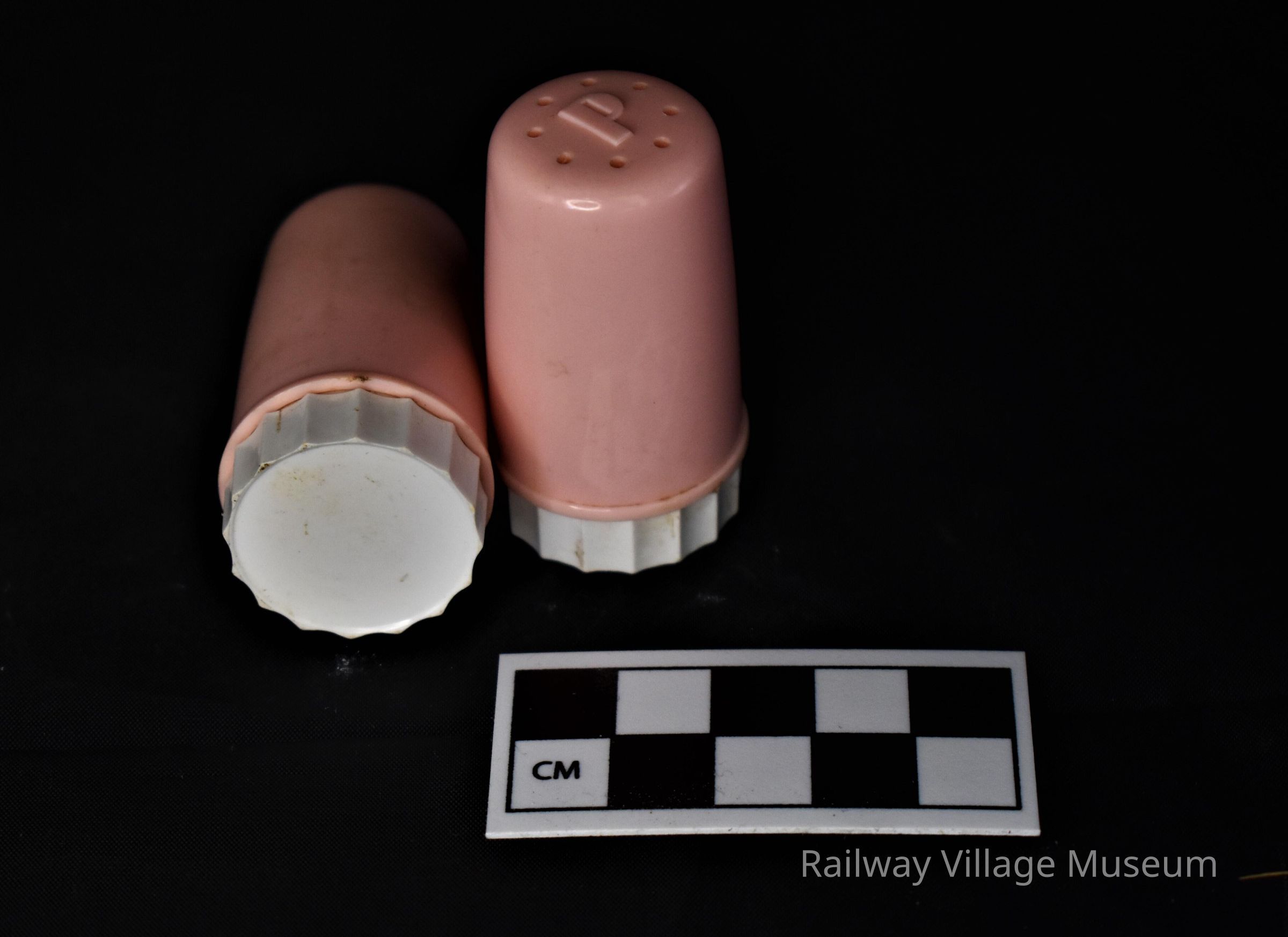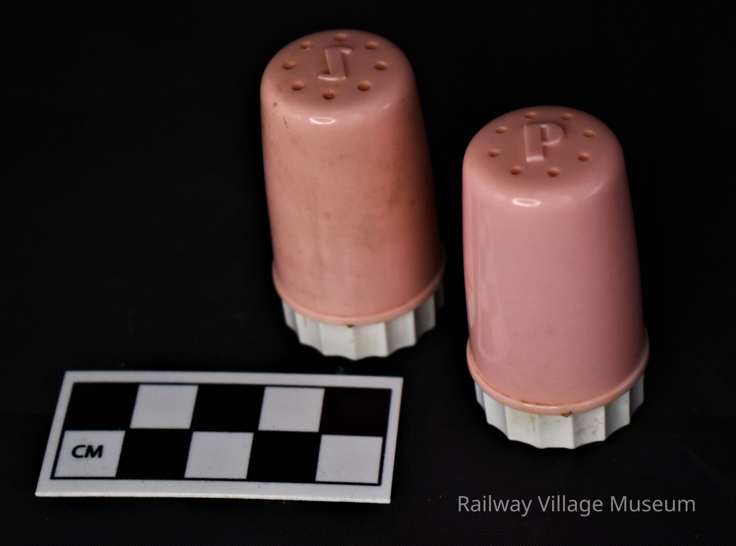Plastic pink salt and pepper shakers with screw-on bases. Both are unmarked.