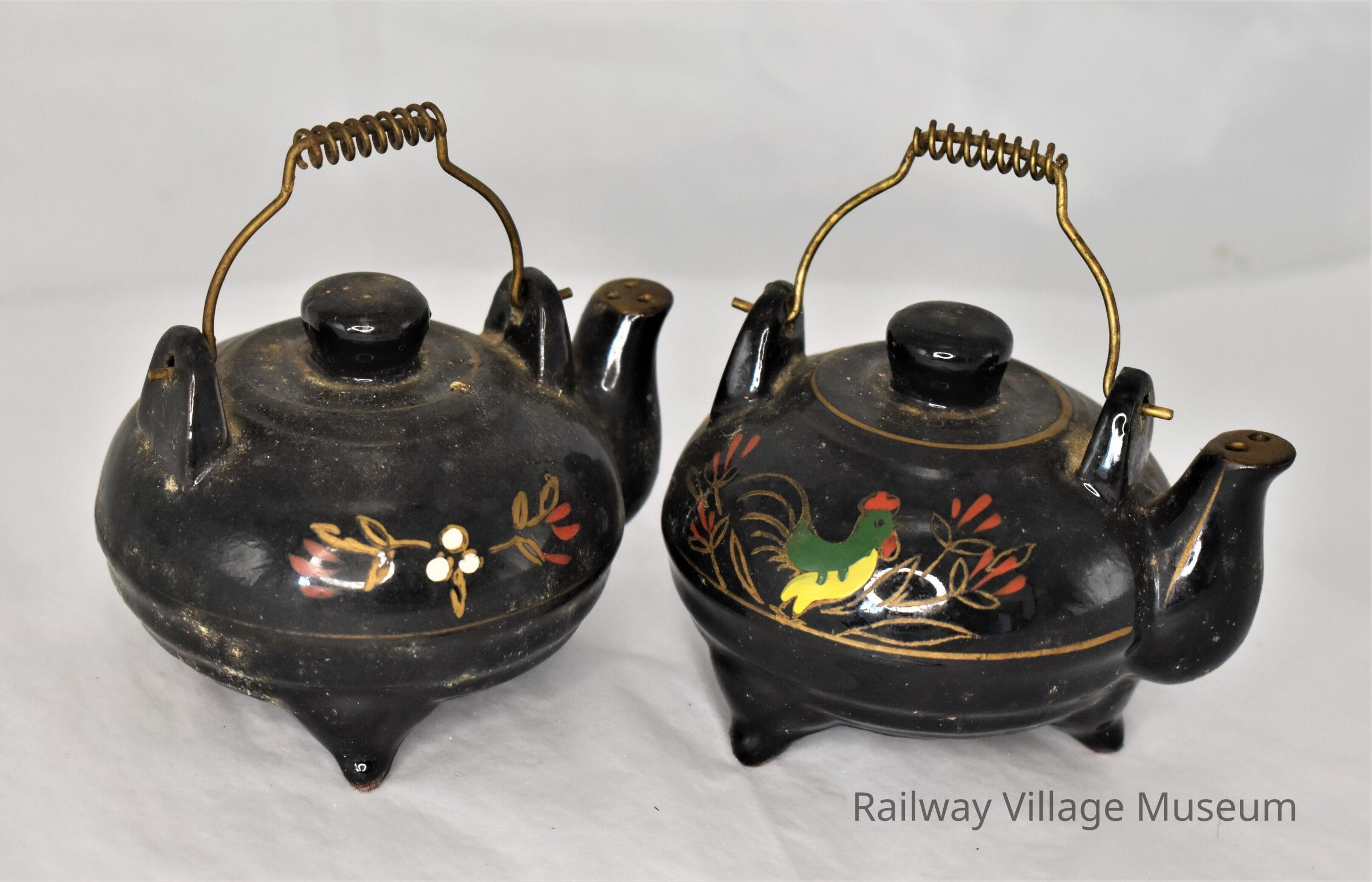 Ceramic teapot shakers with wire handles. On one side, is a green and yellow rooster with floral design and on the other a simple floral design. Each has cork stoppers and a "japan" sticker.