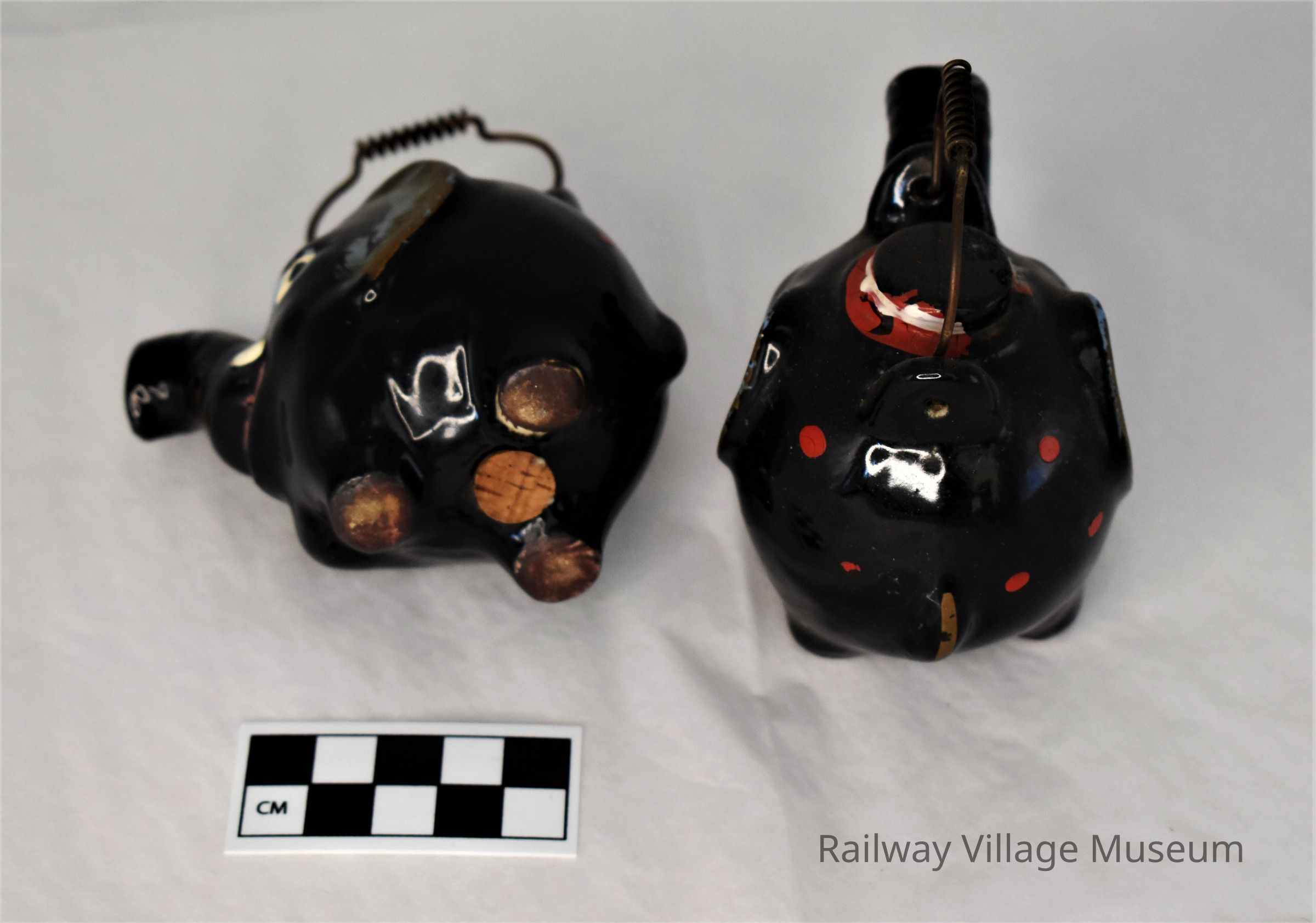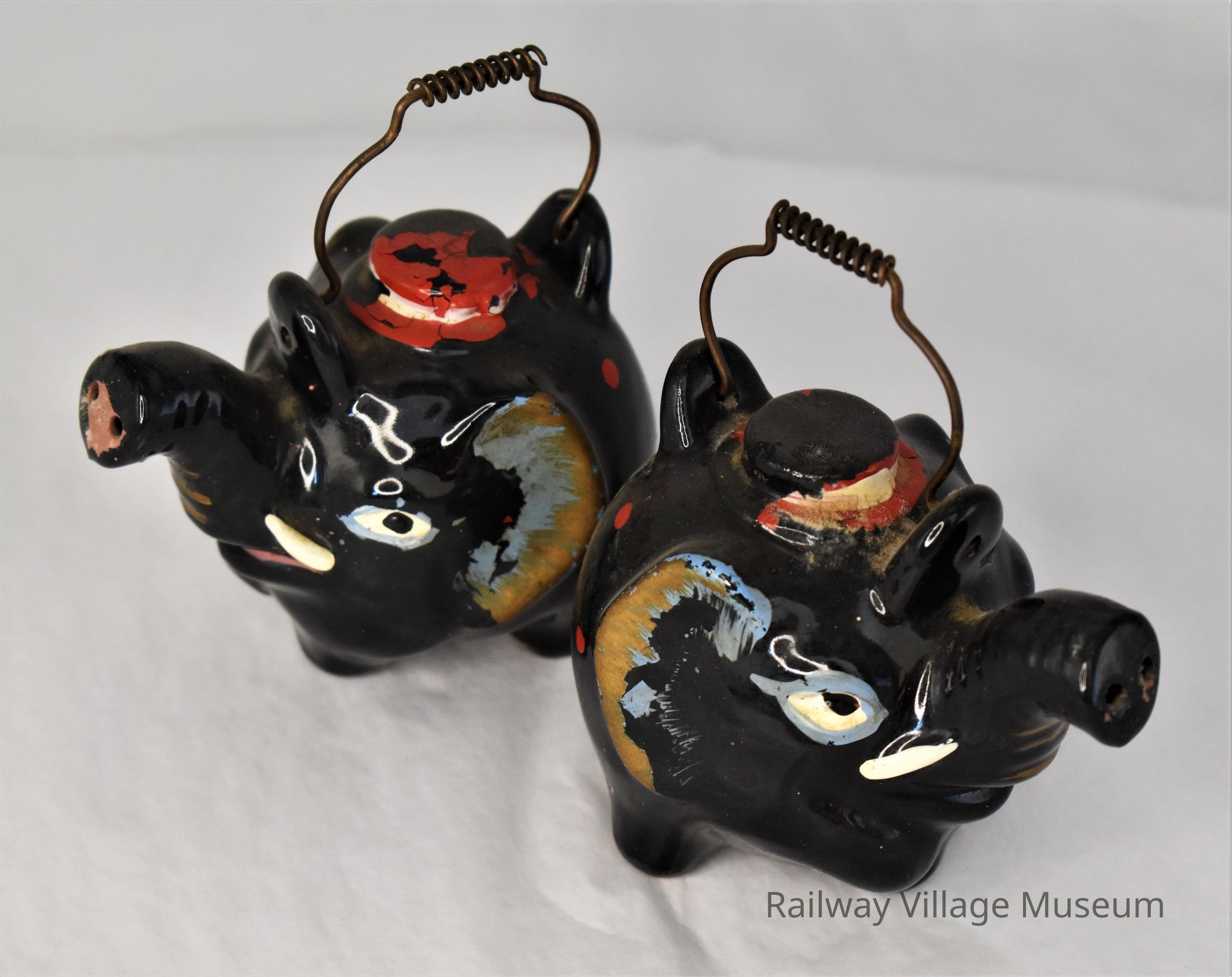 These ceramic salt and pepper shakers are shaped like stout elephants. They resemble teapots with a metal wire handle. The base color of each is black with hand-painted details on the eyes, ears, and trunk. Each is wearing a painted red hat with white stripes and polka dots on their rear-ends. Paint is flaked away on both in multiple places. Only one shaker has a cork stopper intact. They are unmarked.Lexicon