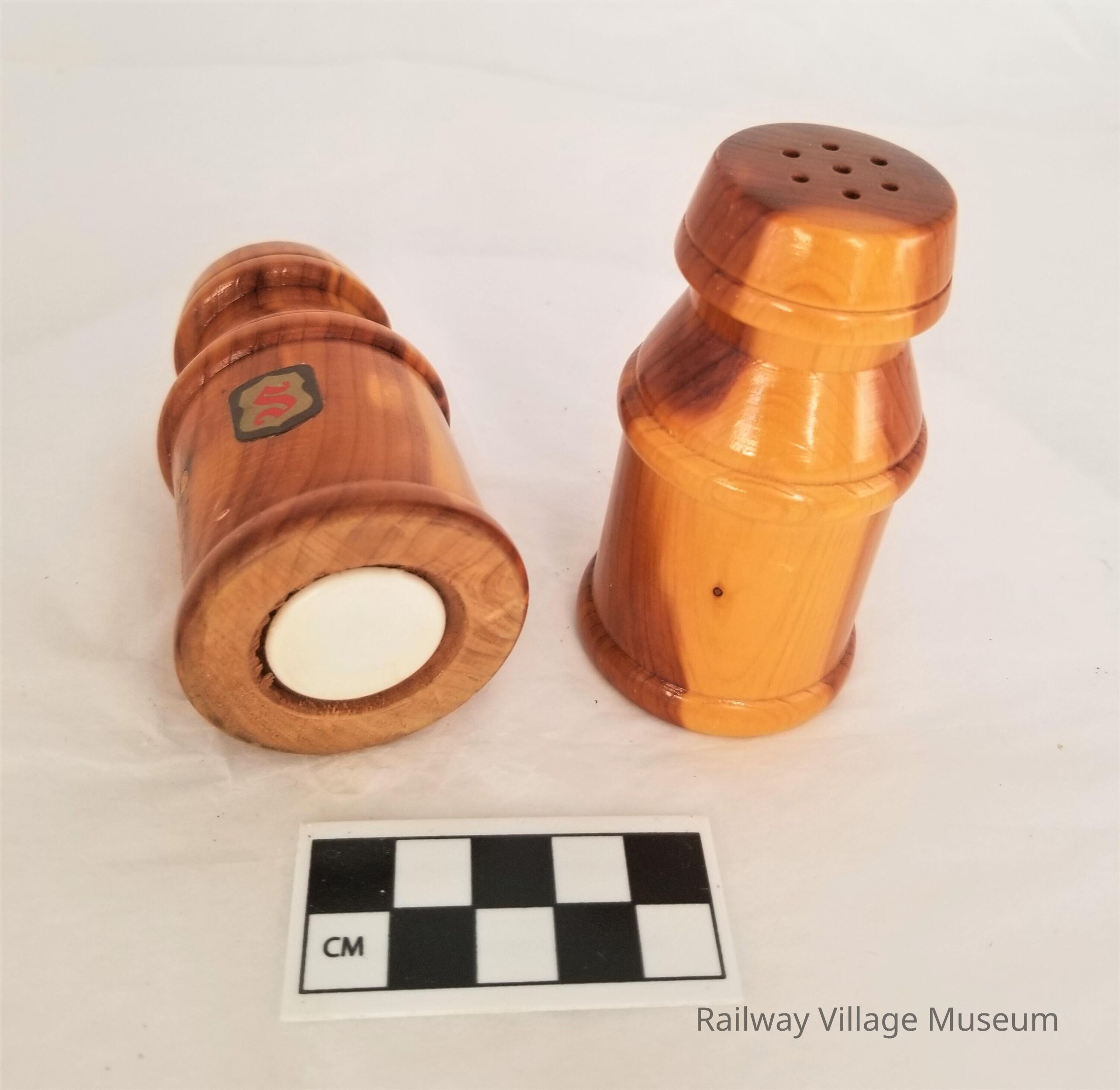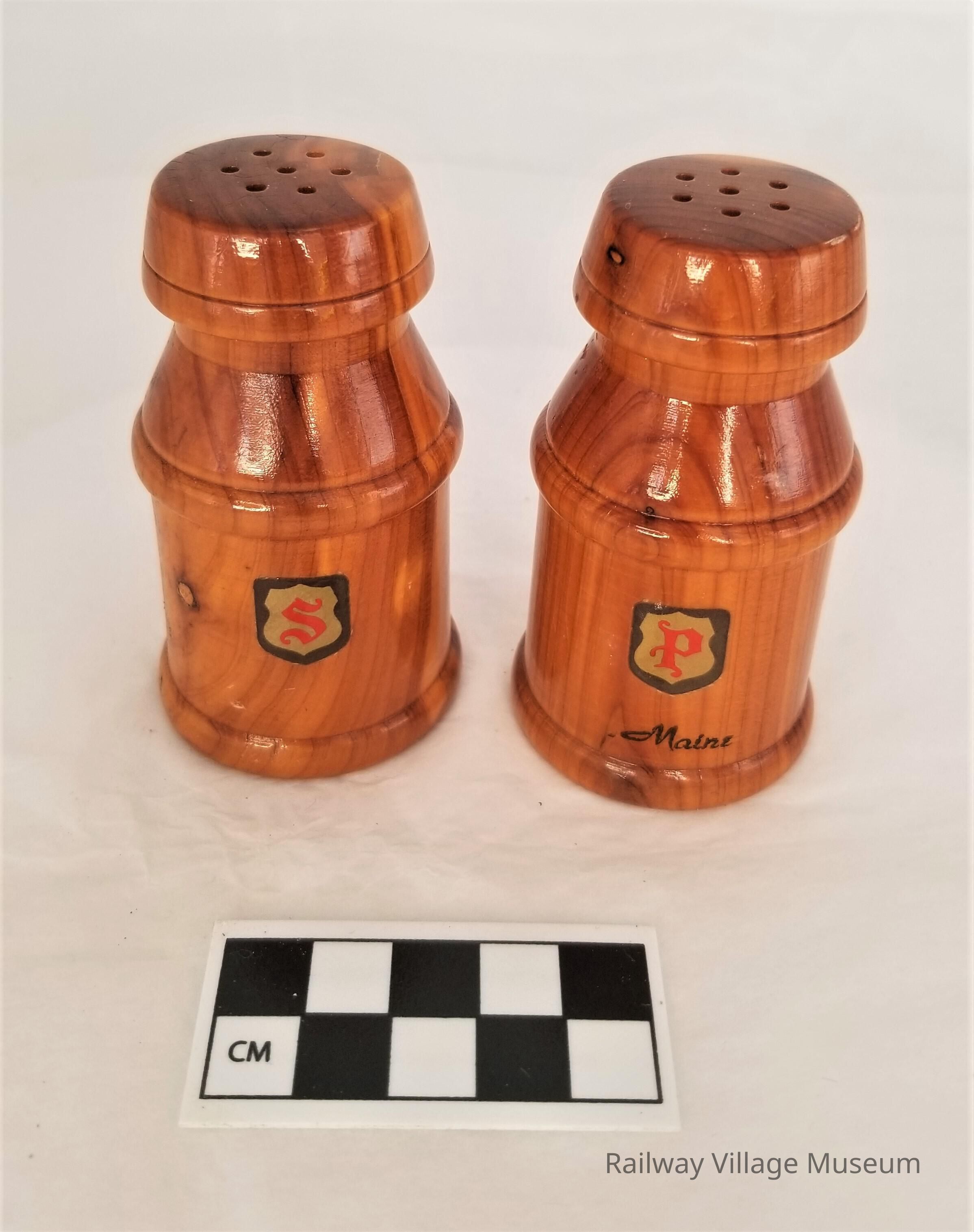 Matching wooden shakers. One with an "S" for salt and one with "P" for pepper. The pepper shaker also says, "Maine". No manufacturer is identified.