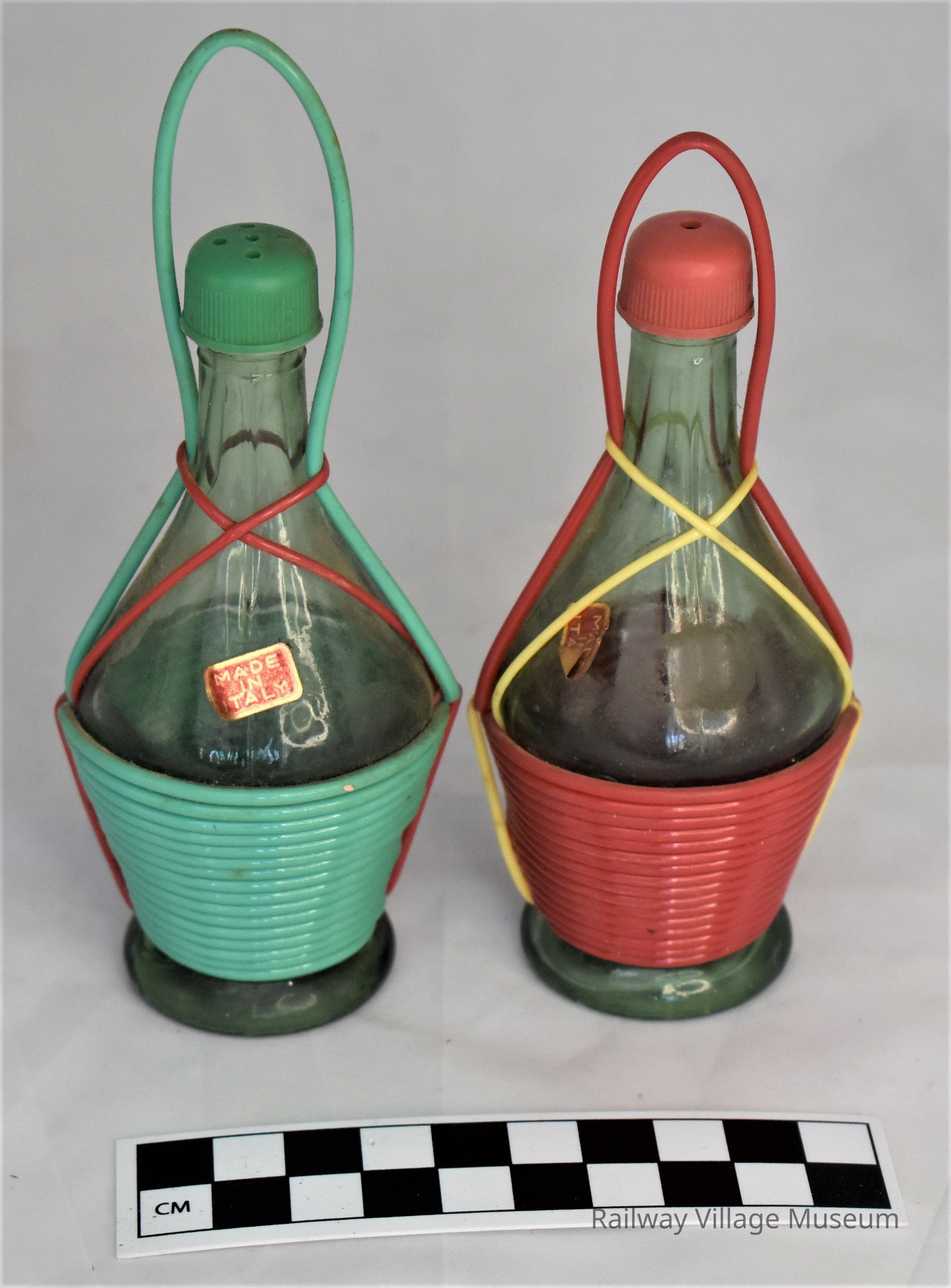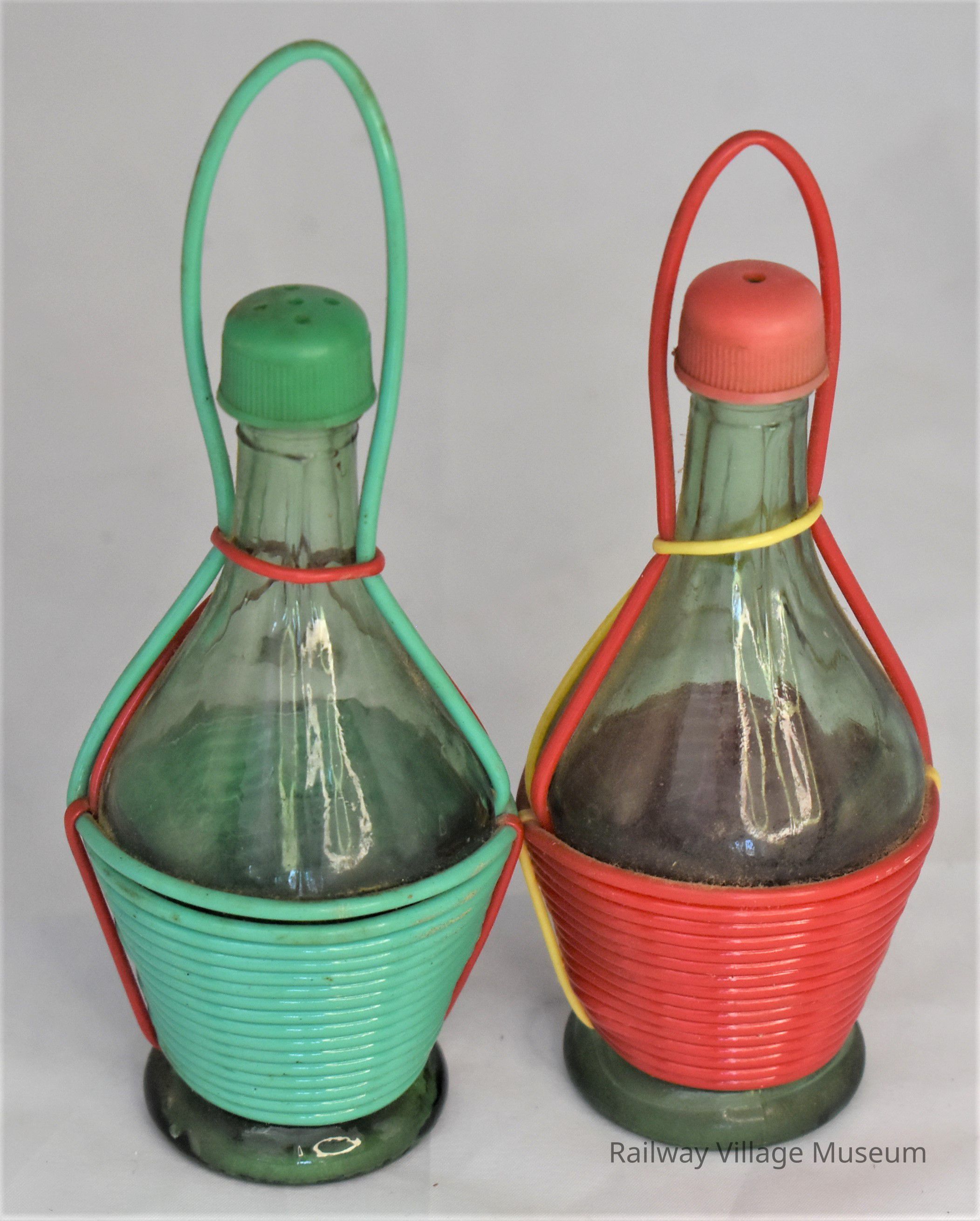 Vintage green glass Chianti wine bottles salt and pepper shakers with red and green plastic handles. Original "Made in Italy" labels.