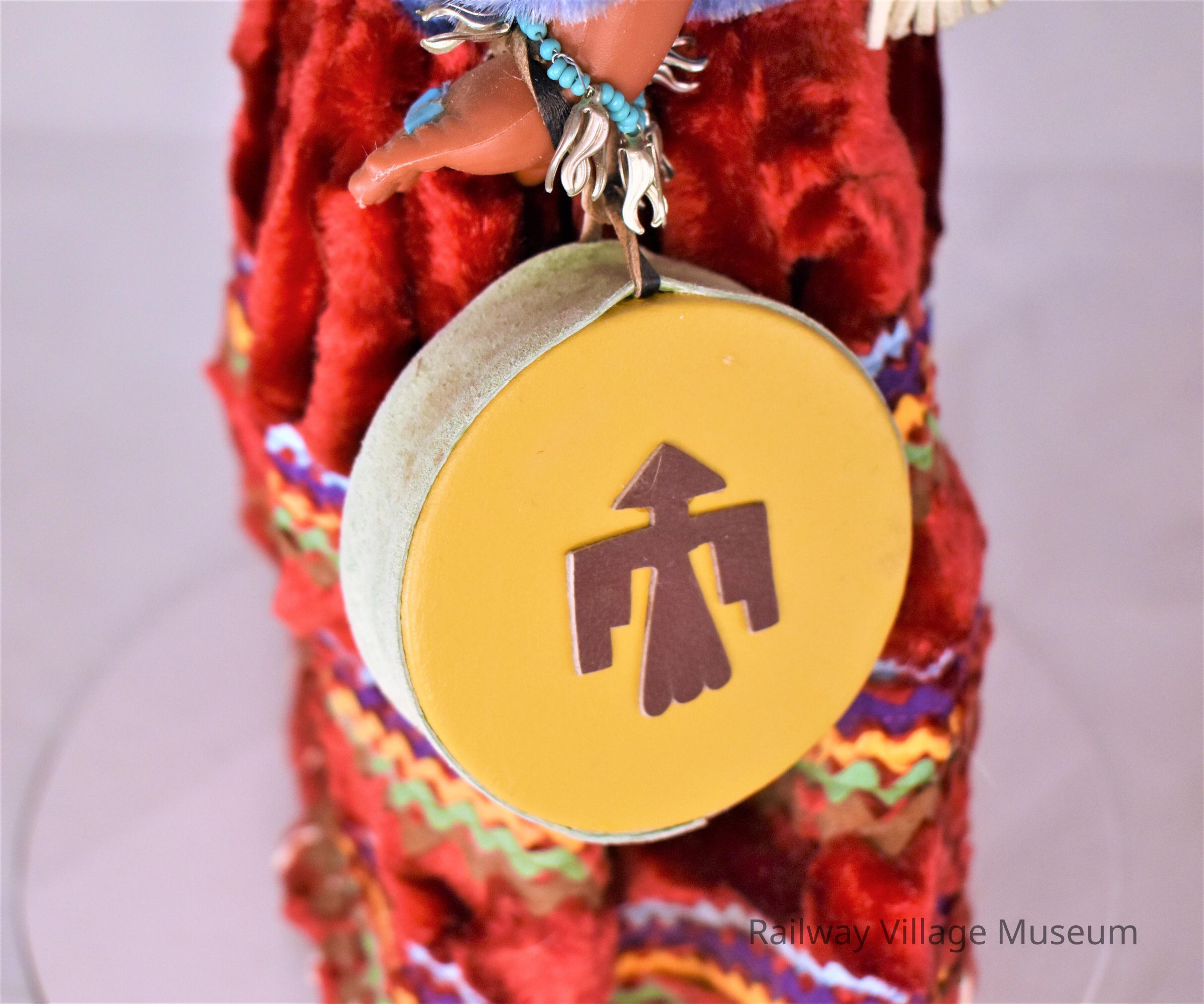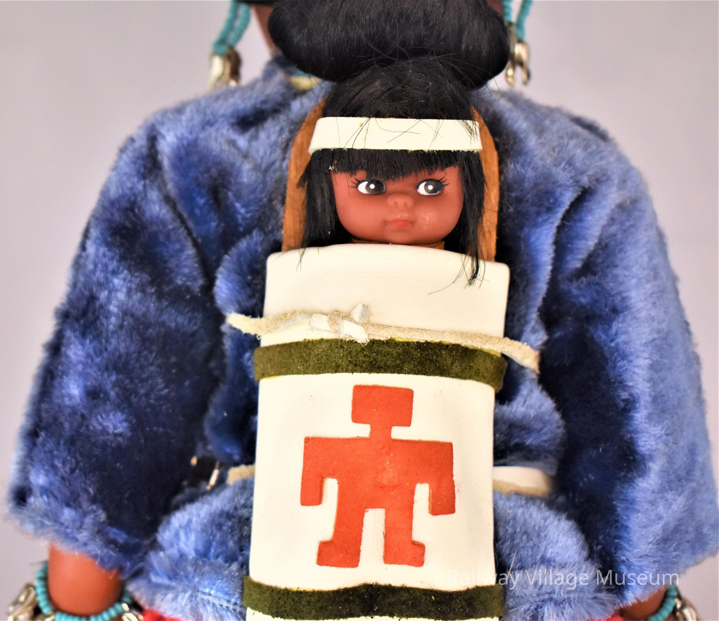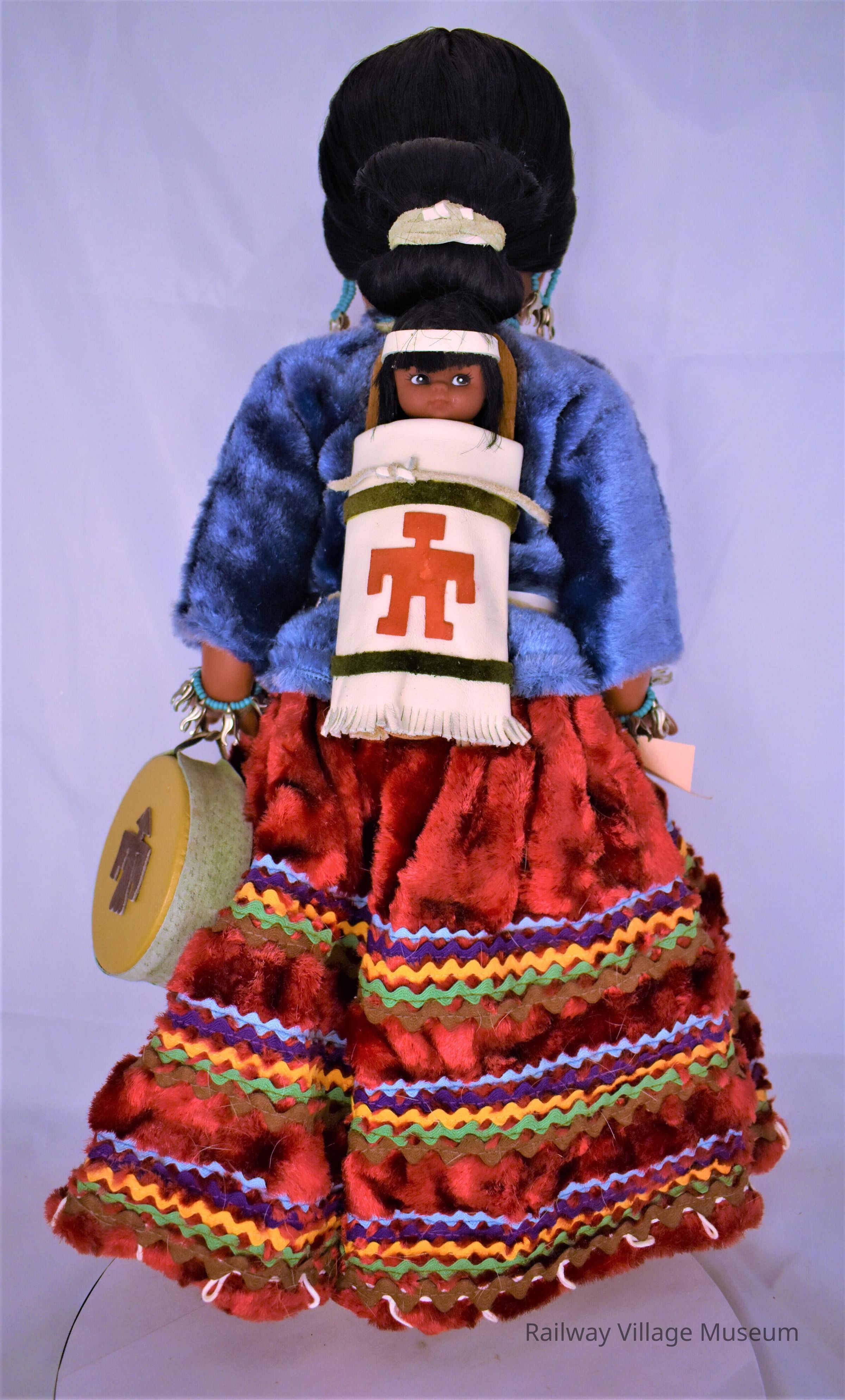 A Native American Navajo girl, that wears a blue shirt and red skirt. She has a baby in a papoose and a drum attached to her right wrist.Lexicon