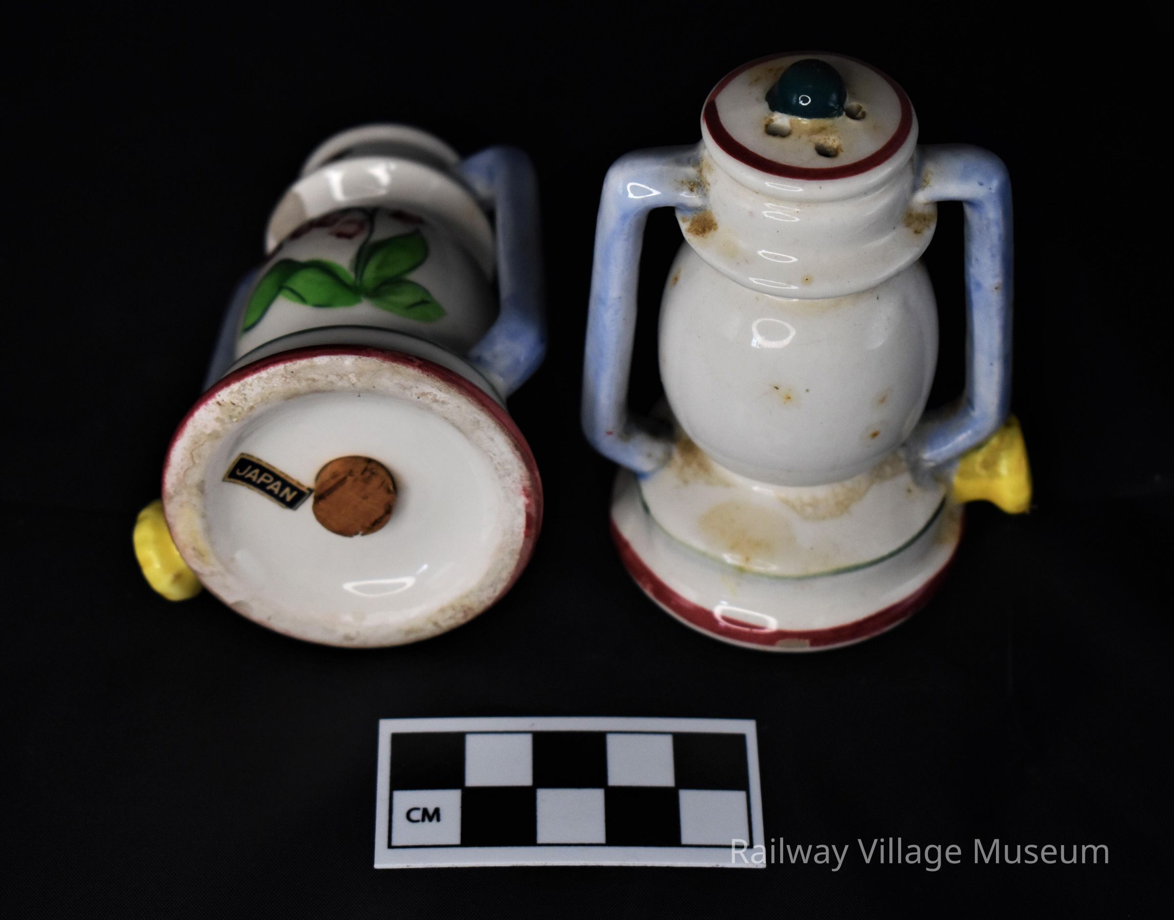 Matching ceramic lantern shakers with hand-painted floral designs. No manufacturer but made in Japan. Both have cork stoppers intact.