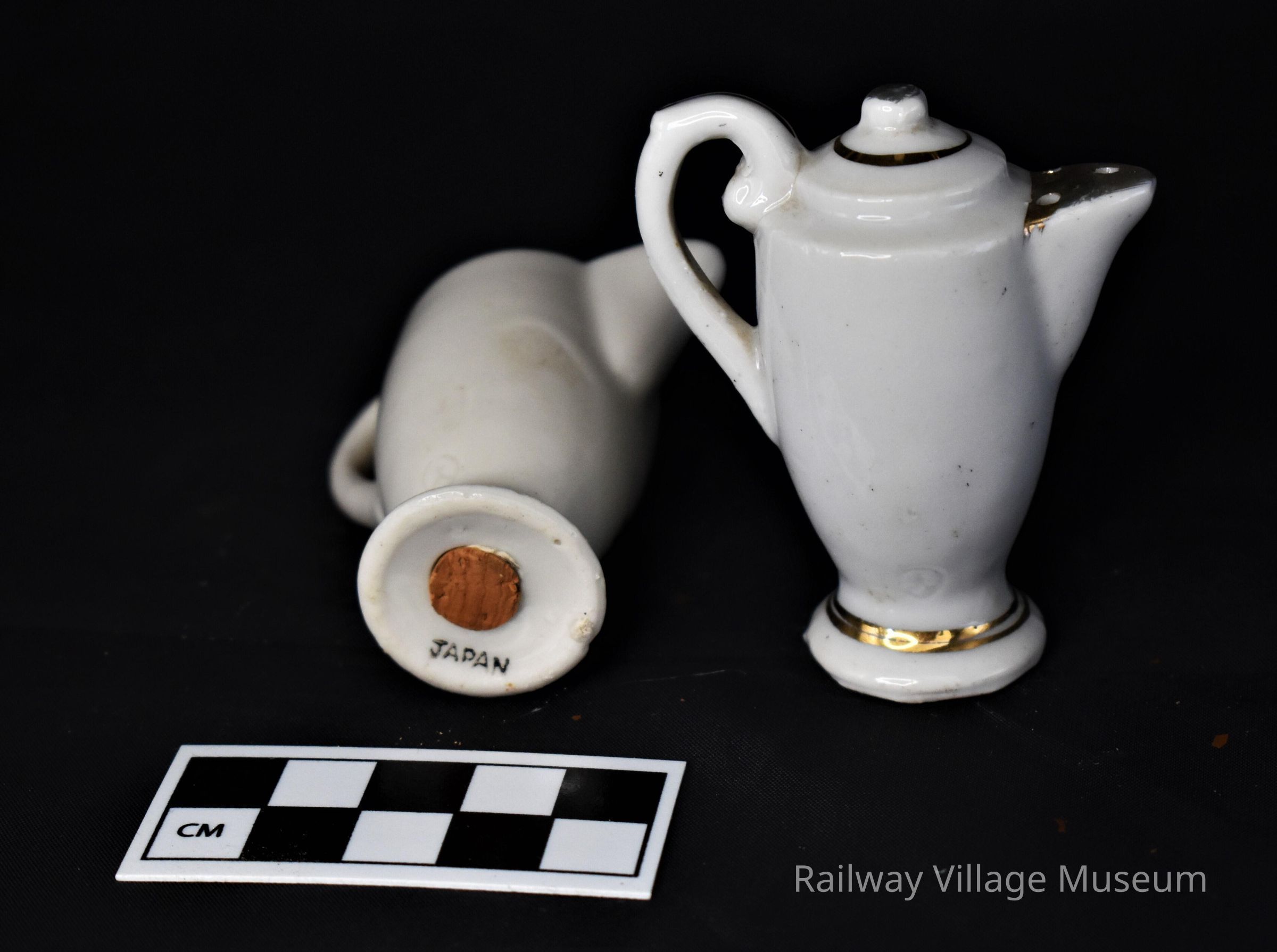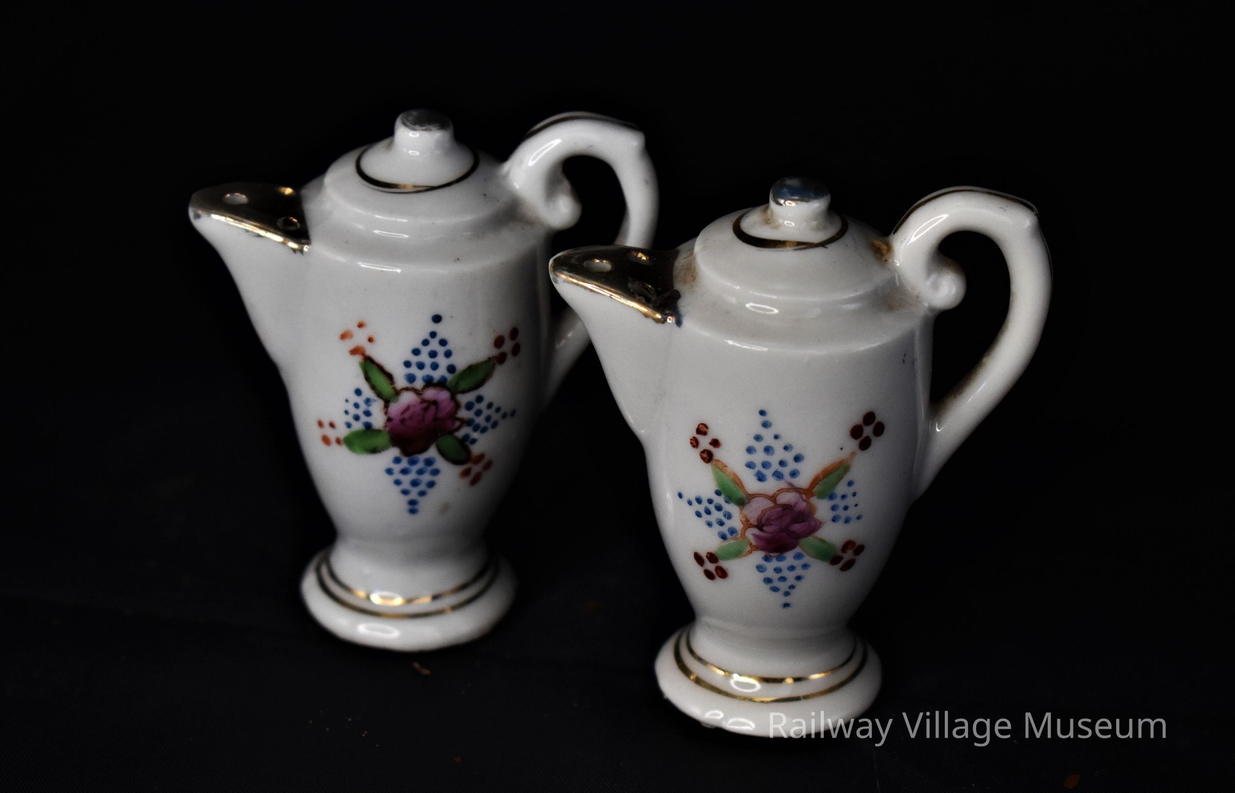 Ceramic teapots with a single rose design and gold detailing. Both marked with "Japan". One cork stopper intact and one cork stopper has been pushed inside the shaker's interior.