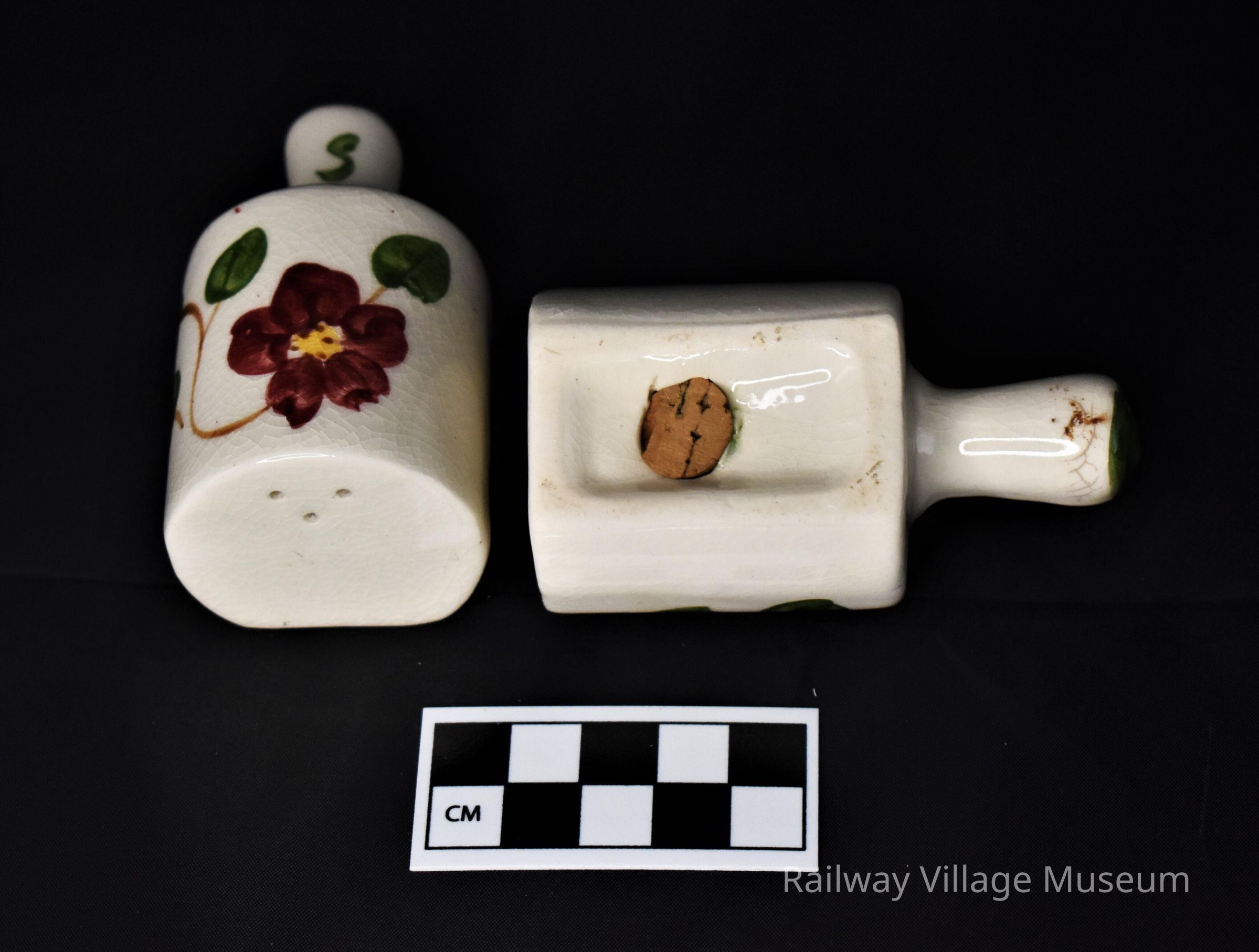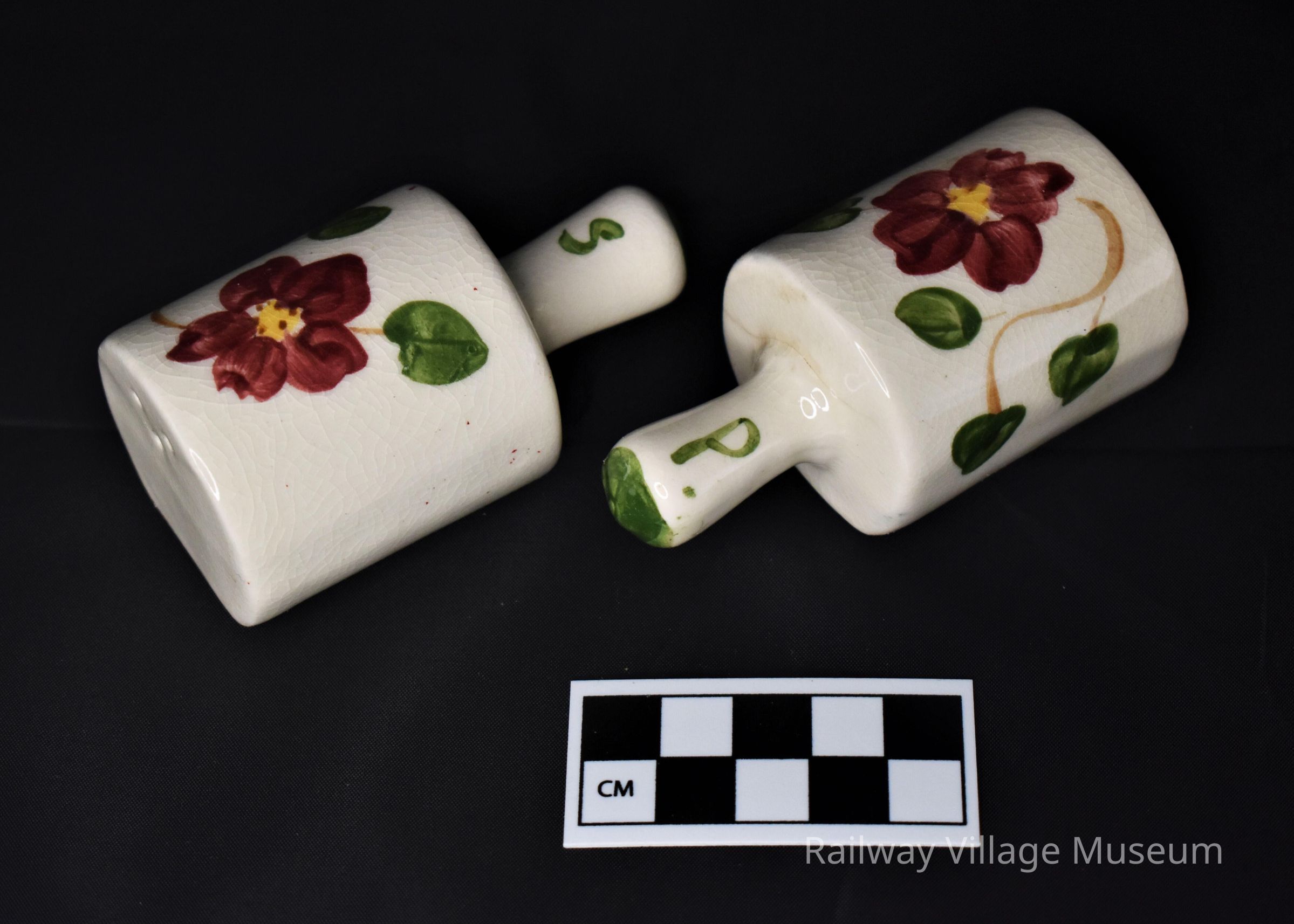 Hand-painted ceramic salt and pepper shakers. The shakers have a matching floral pattern. The shakers are a cylinder shape with a handle that are mad to lay on their sides. Both are unmarked but with cork stoppers intact.