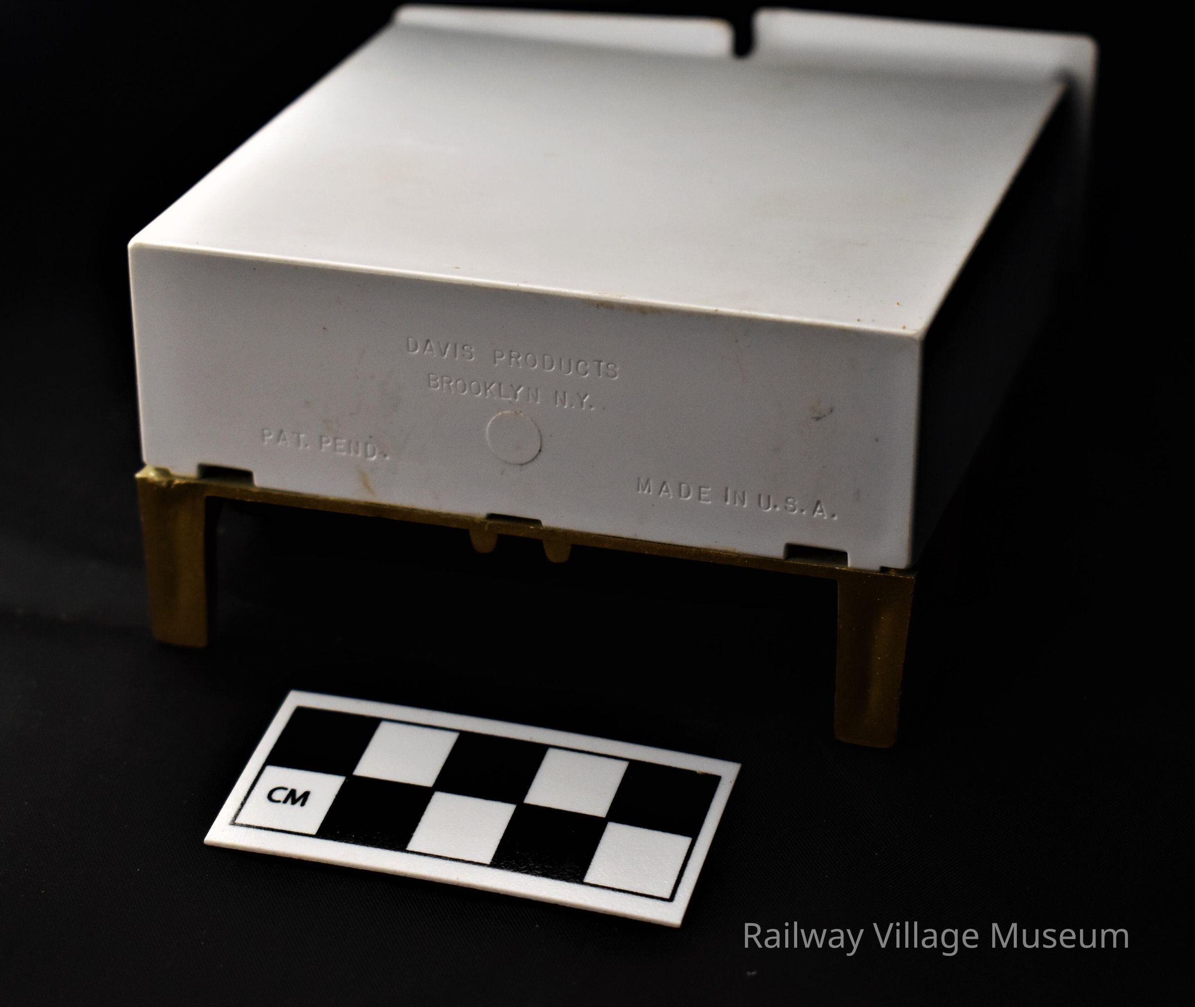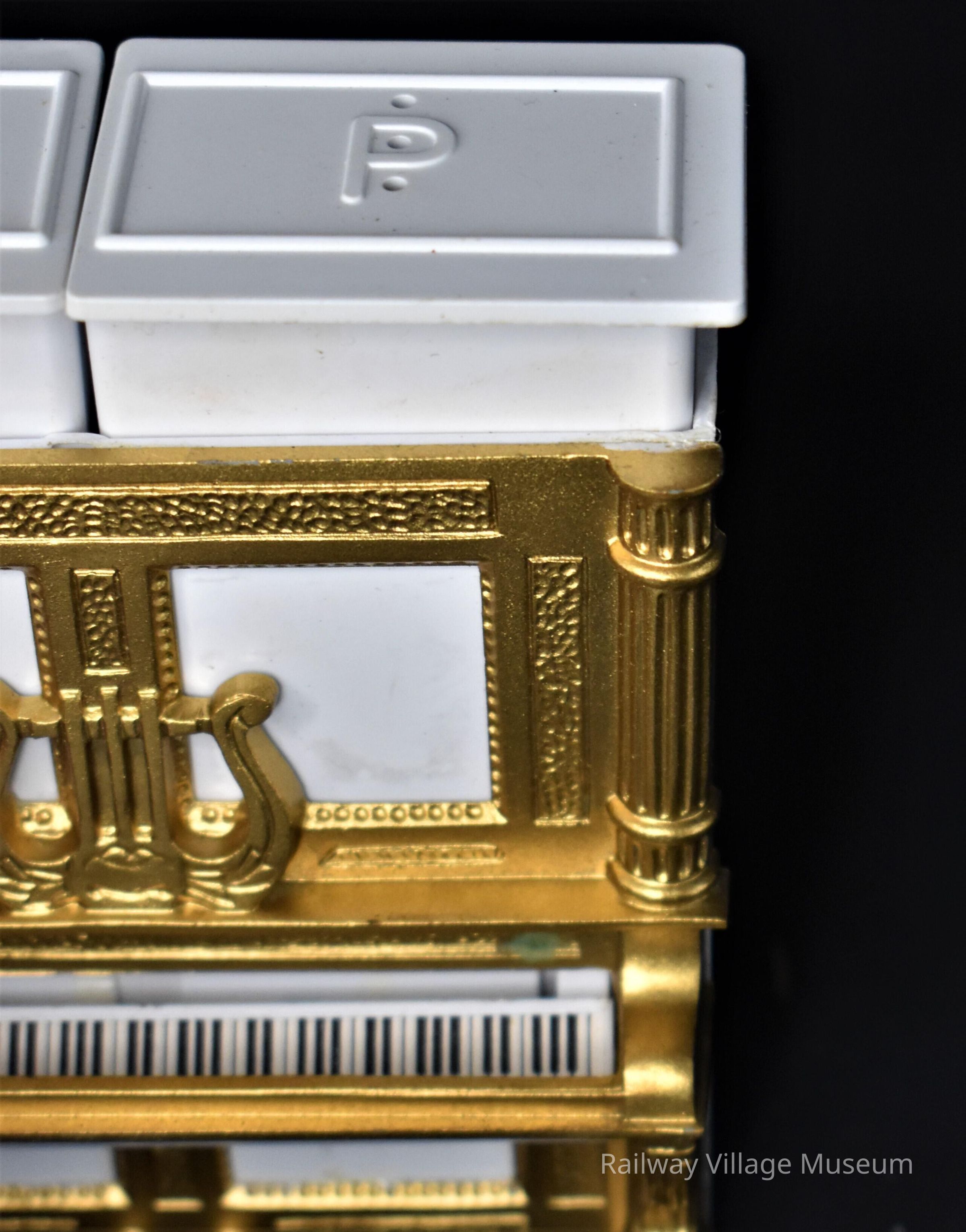Gold and white plastic piano has two shakers nested into the top. When keys are pressed down, an internal mechanism "pops" the shaker up where that can be easily removed. The base of the piano is labeled "Davis Products Brooklyn, N.Y. PAT. PEND. Made in U.S.A."Made/Created