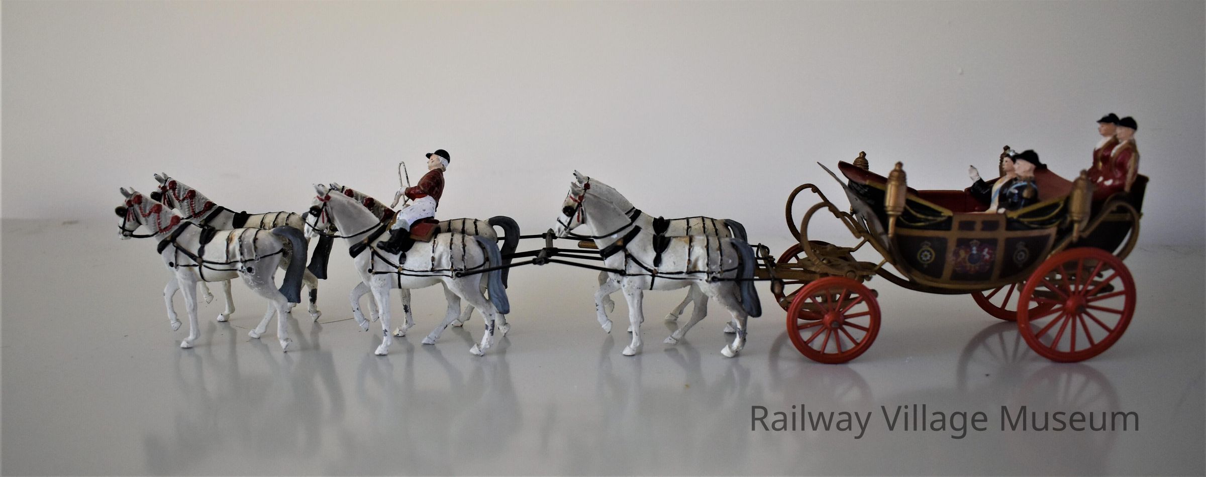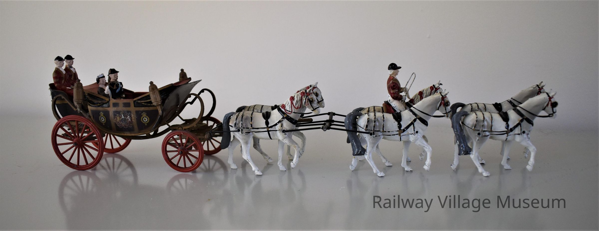The landau and 4 horses attached are 2021.1.42a, the 2 unattached horses are 2021.1.42b-c, the queen is 2021.1.42d, the king is 2021.1.42e, the footmen are 2021.1.42f, the lone rider is 2021.1.42g.Made/Created