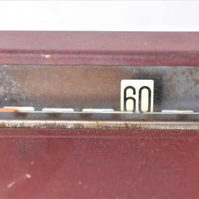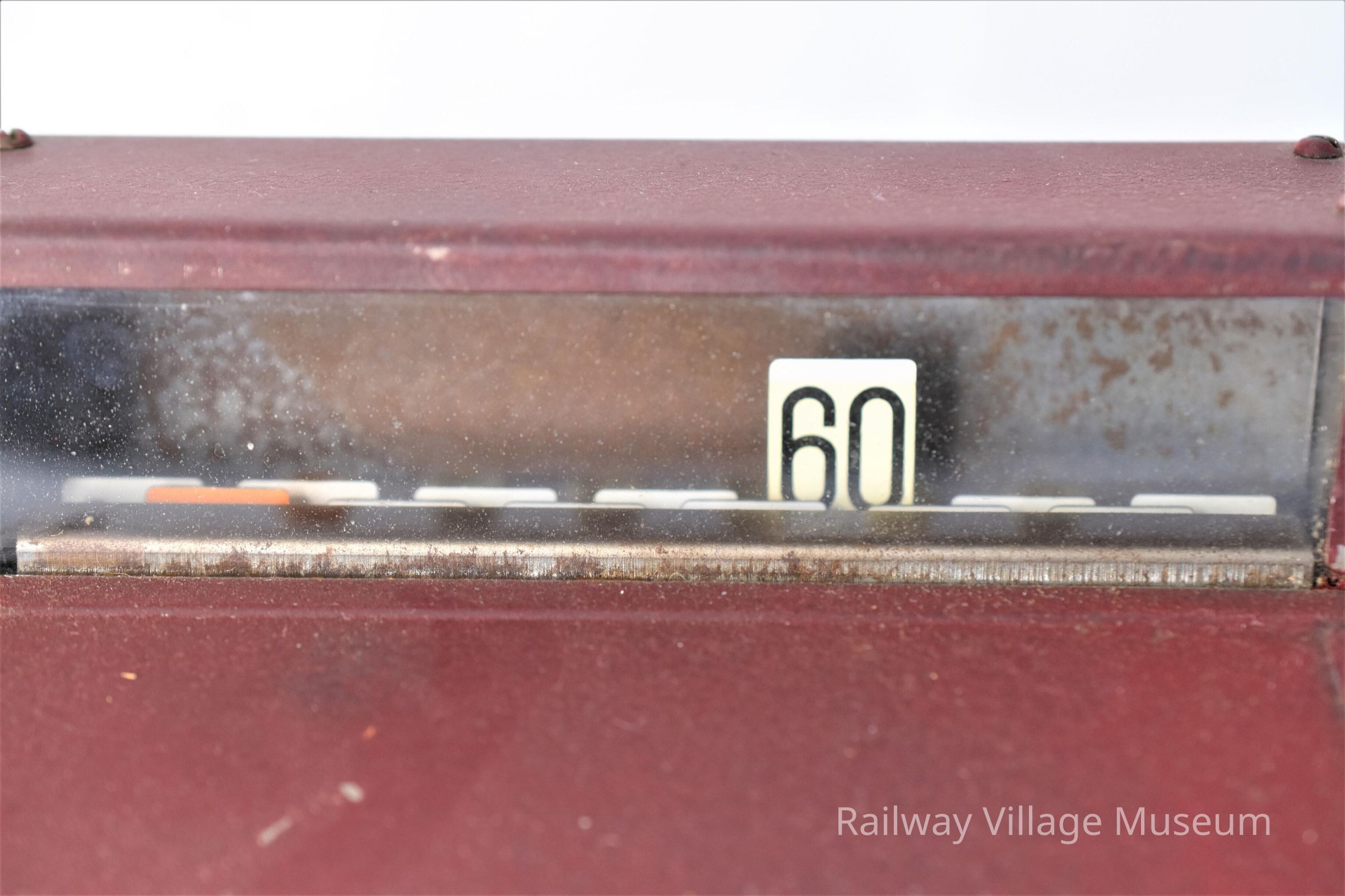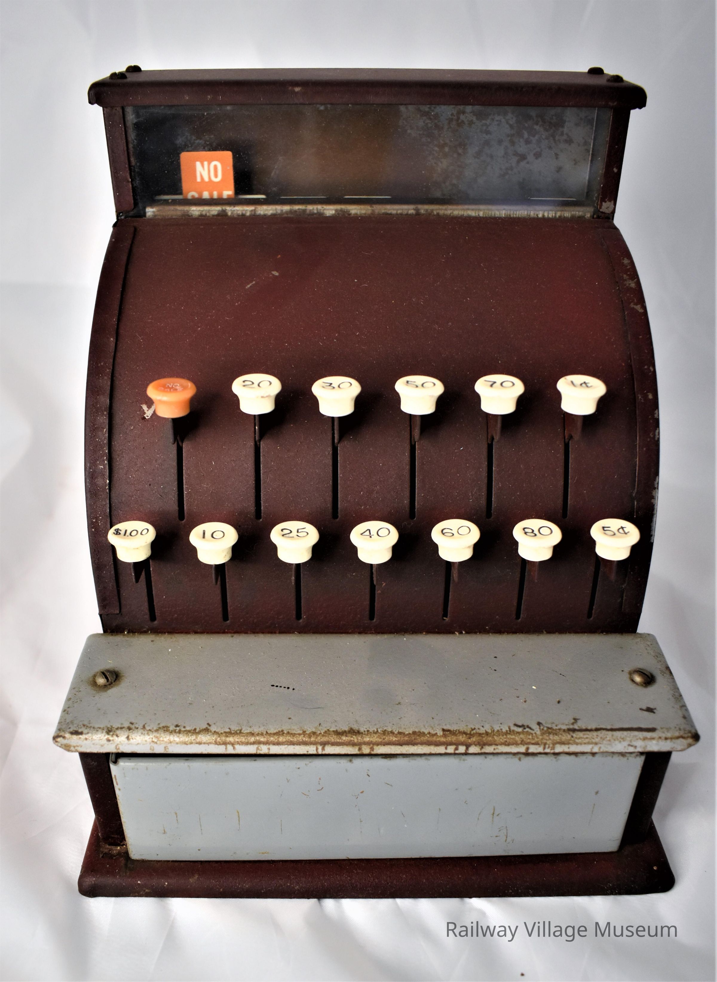 A Tom Thumb cash register. This toy originally came with fake money, but that is no longer with the toy. The buttons and levers all still work, however, this register's buttons are slightly confusing and a little stuck.Made/Created