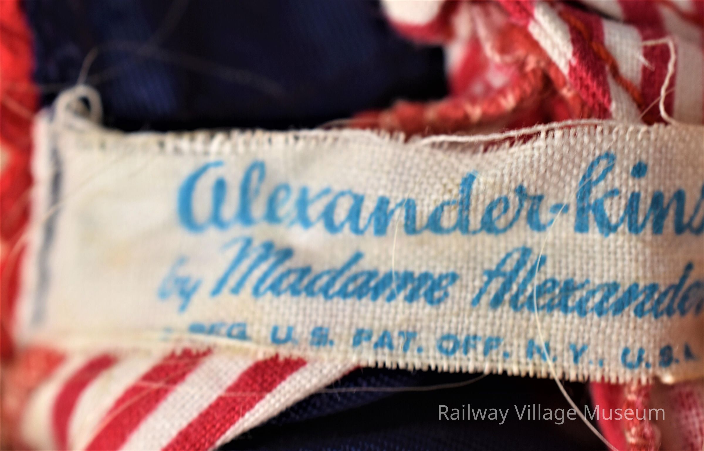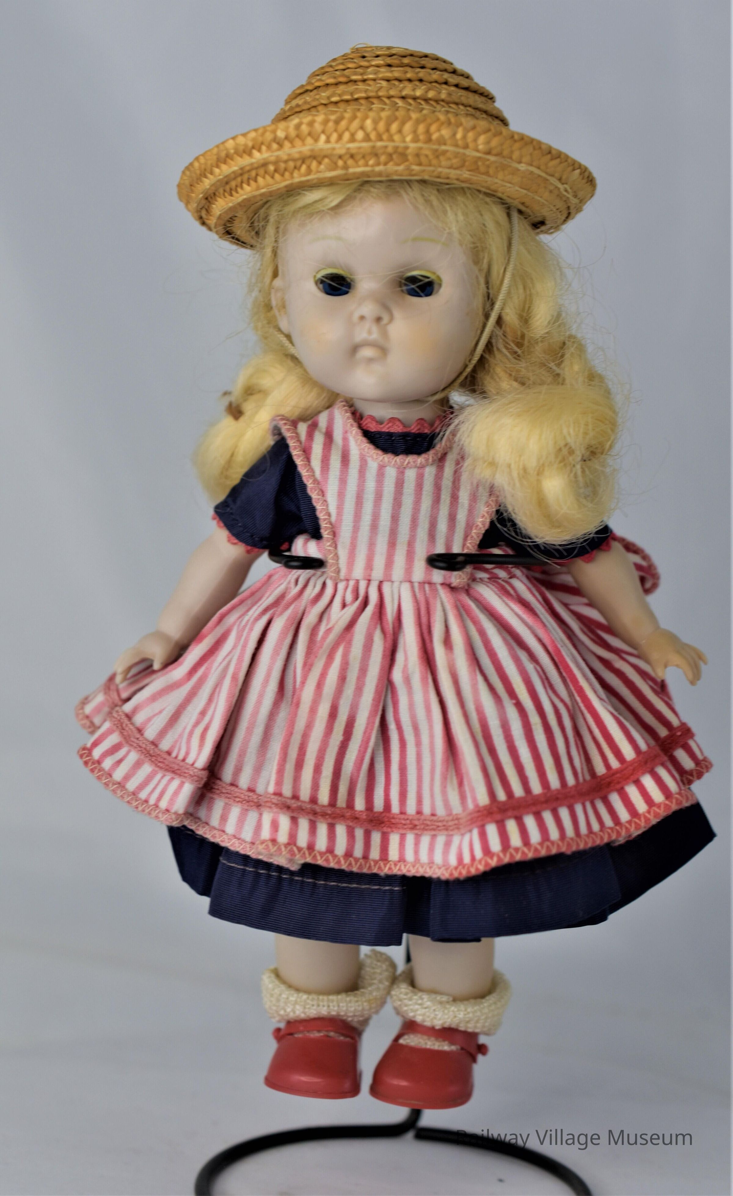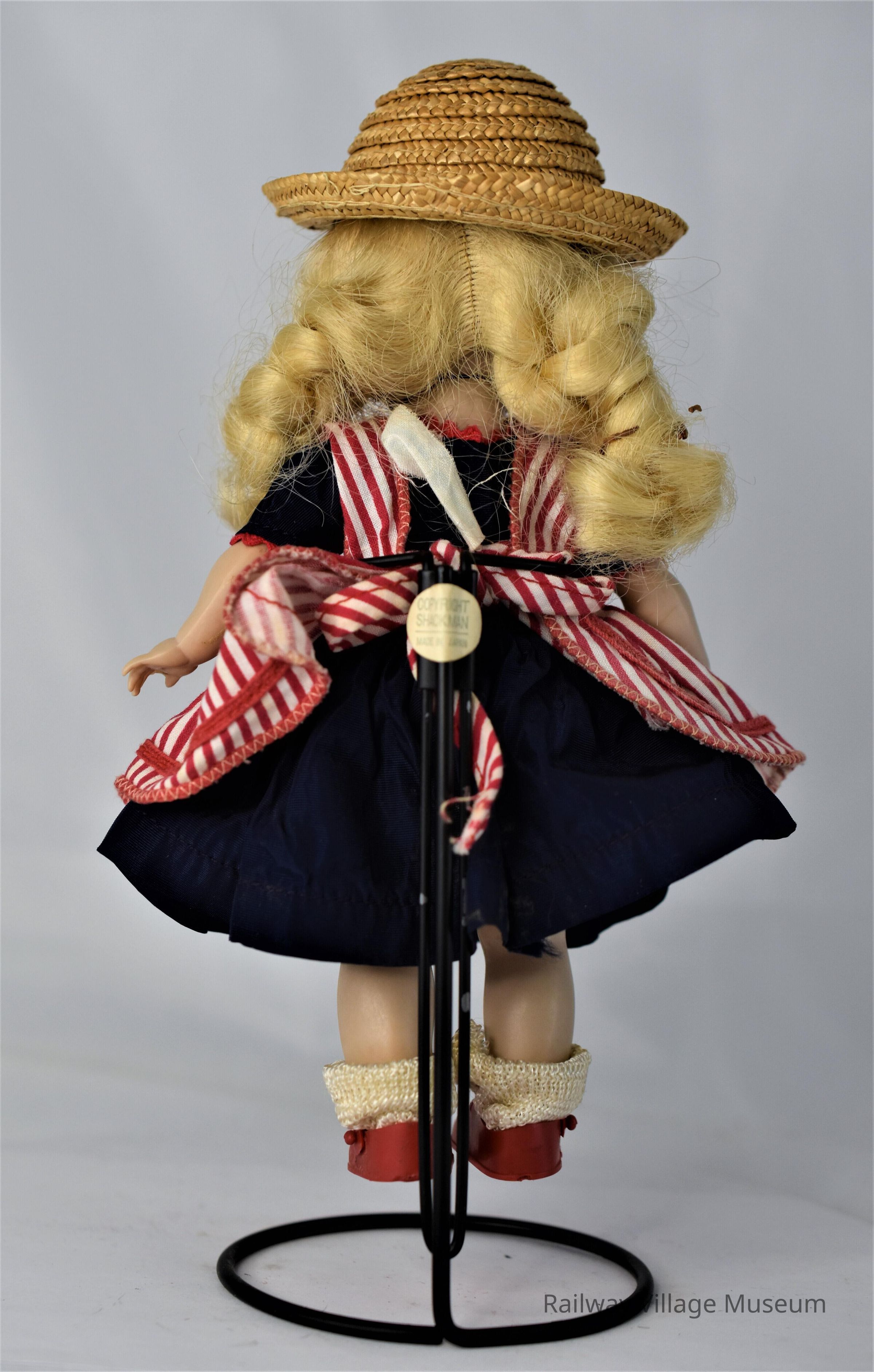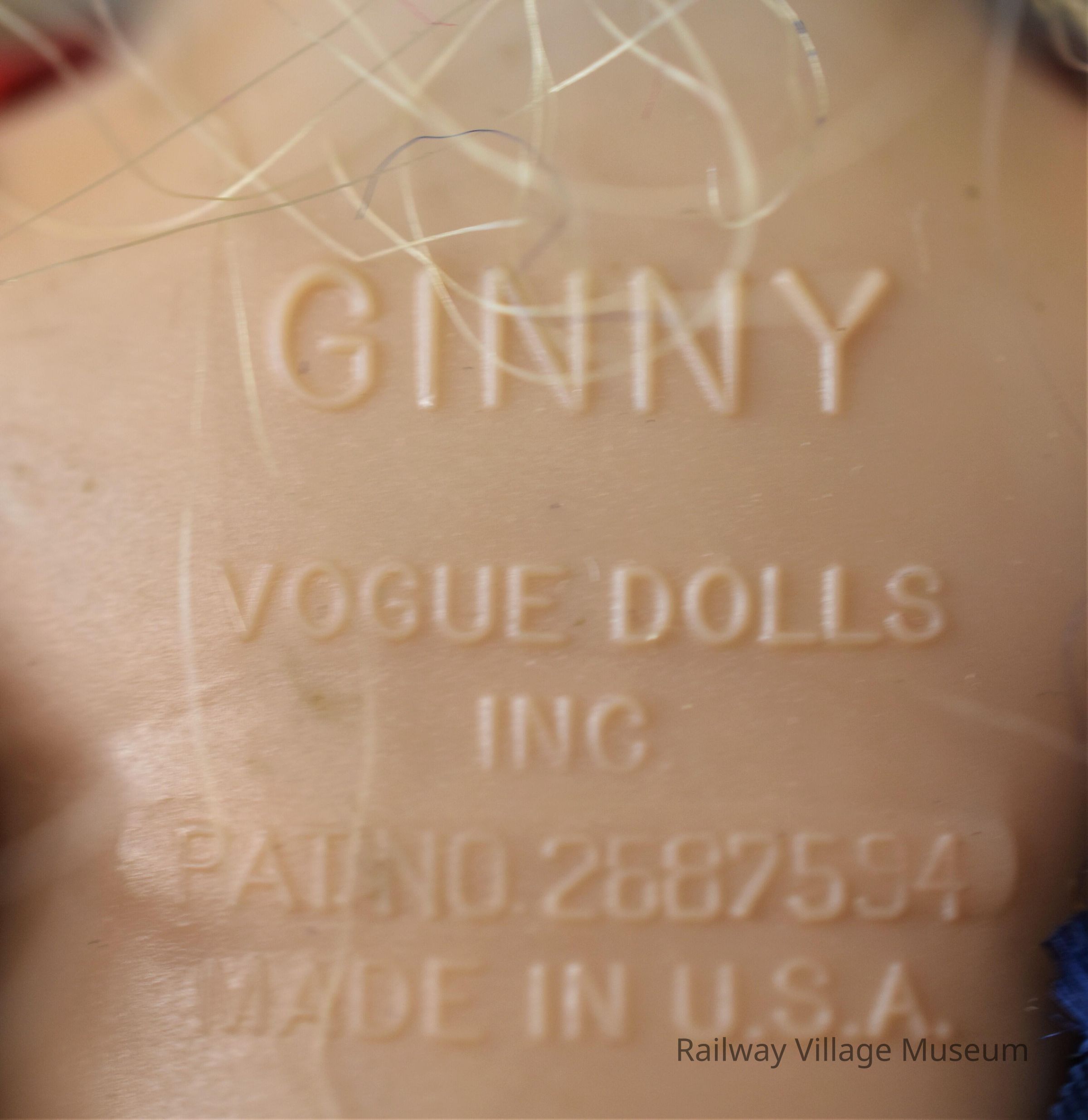 A Vogue Ginny doll, wearing Alexander-kins clothes. This doll has the Vogue makers mark on her back, and the style of the mark is what helps date this doll. She is a straight-leg walker, which also helps date her.Lexicon
