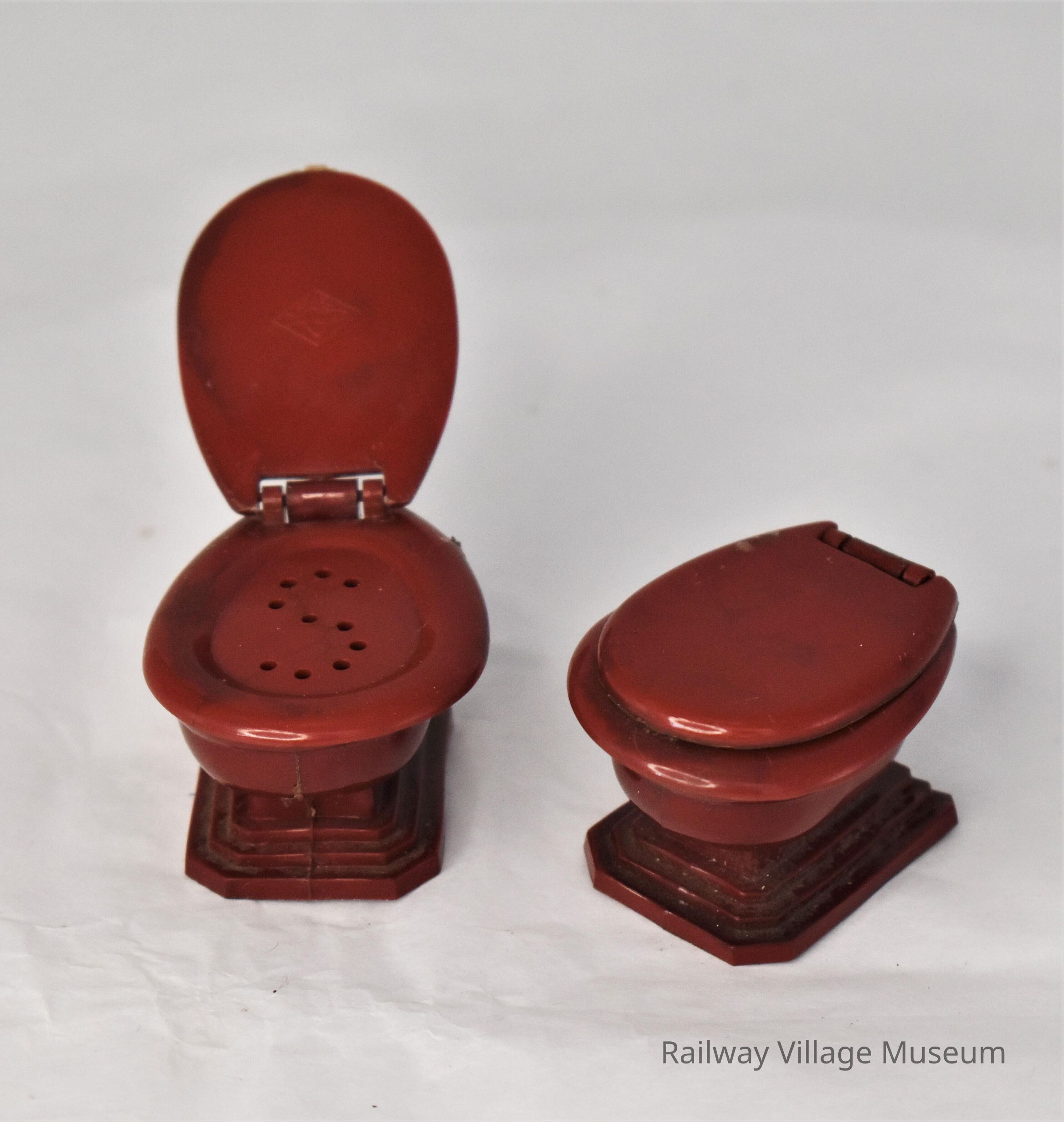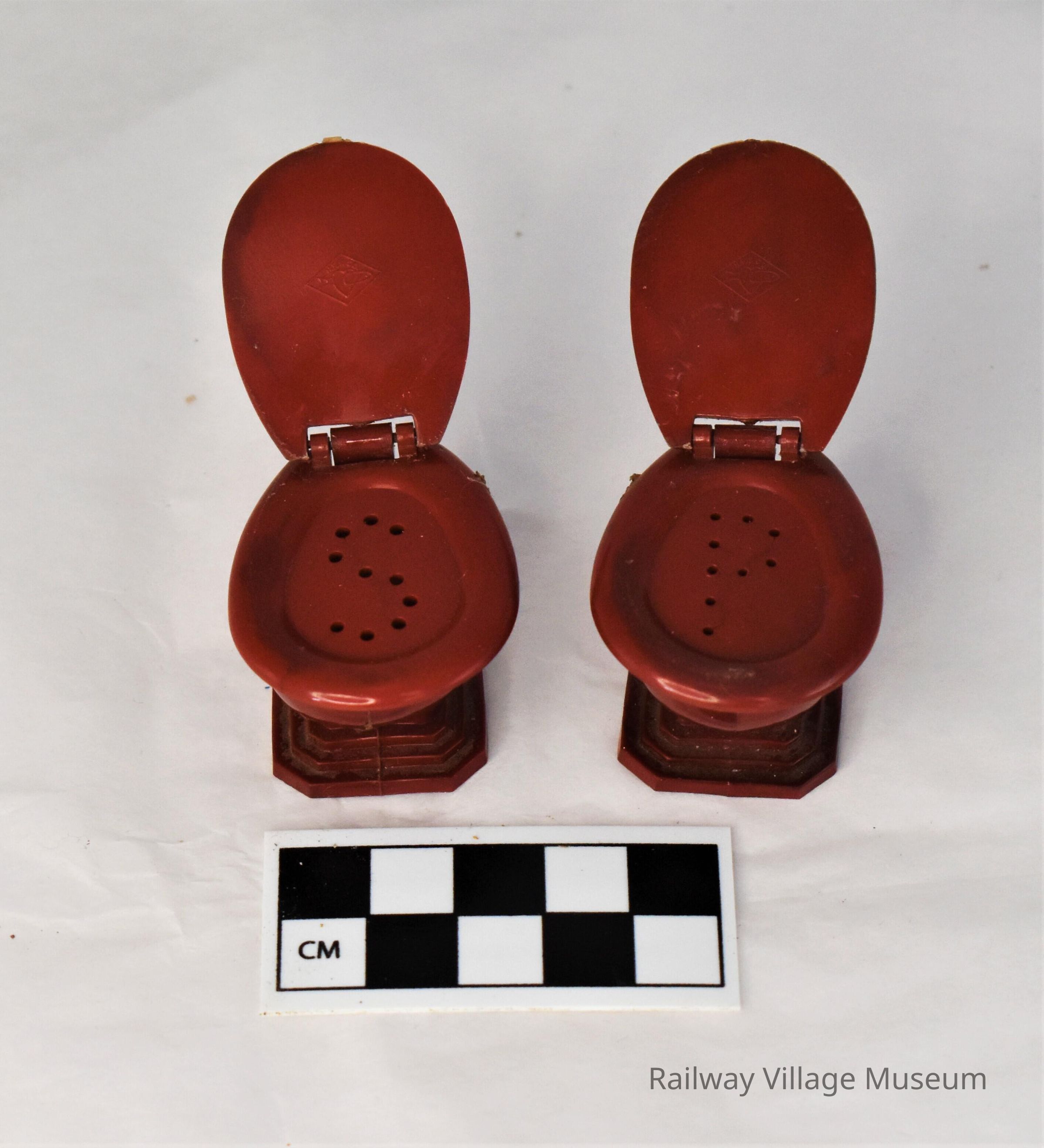 Red plastic toilet salt and pepper shakers. Lift the lids to expose the holes in an "S" and "P" design. Both have cork stoppers intact. The underside of each lid has a small makers mark that says, "H.F. & Co." and a logo that appears to be a small fish going through a heart.