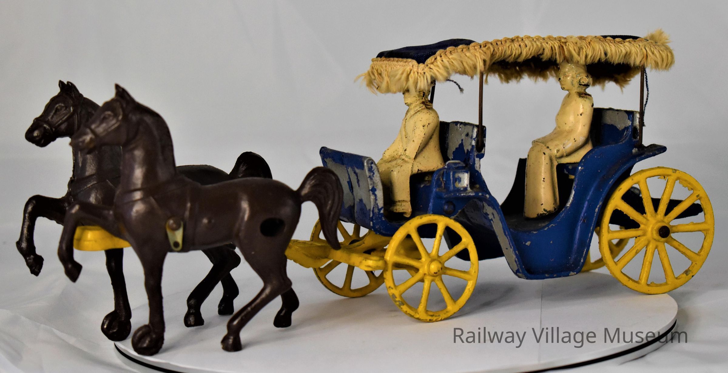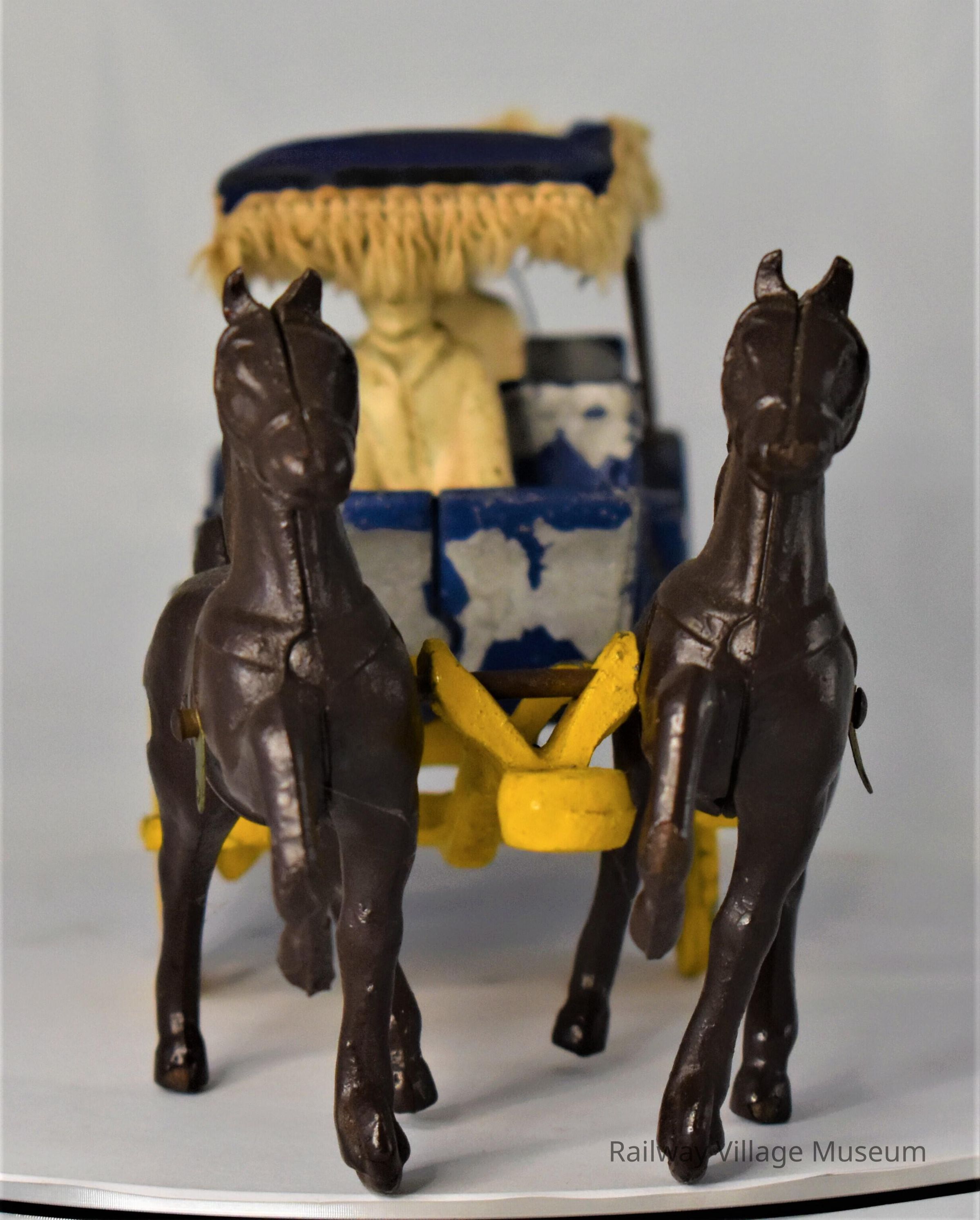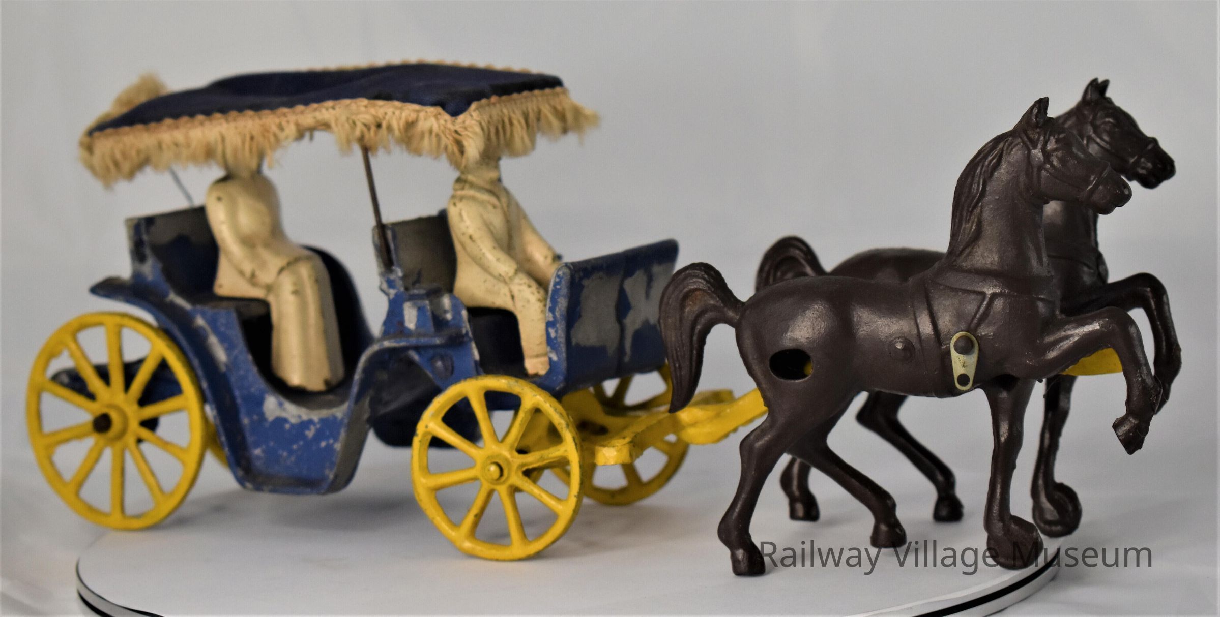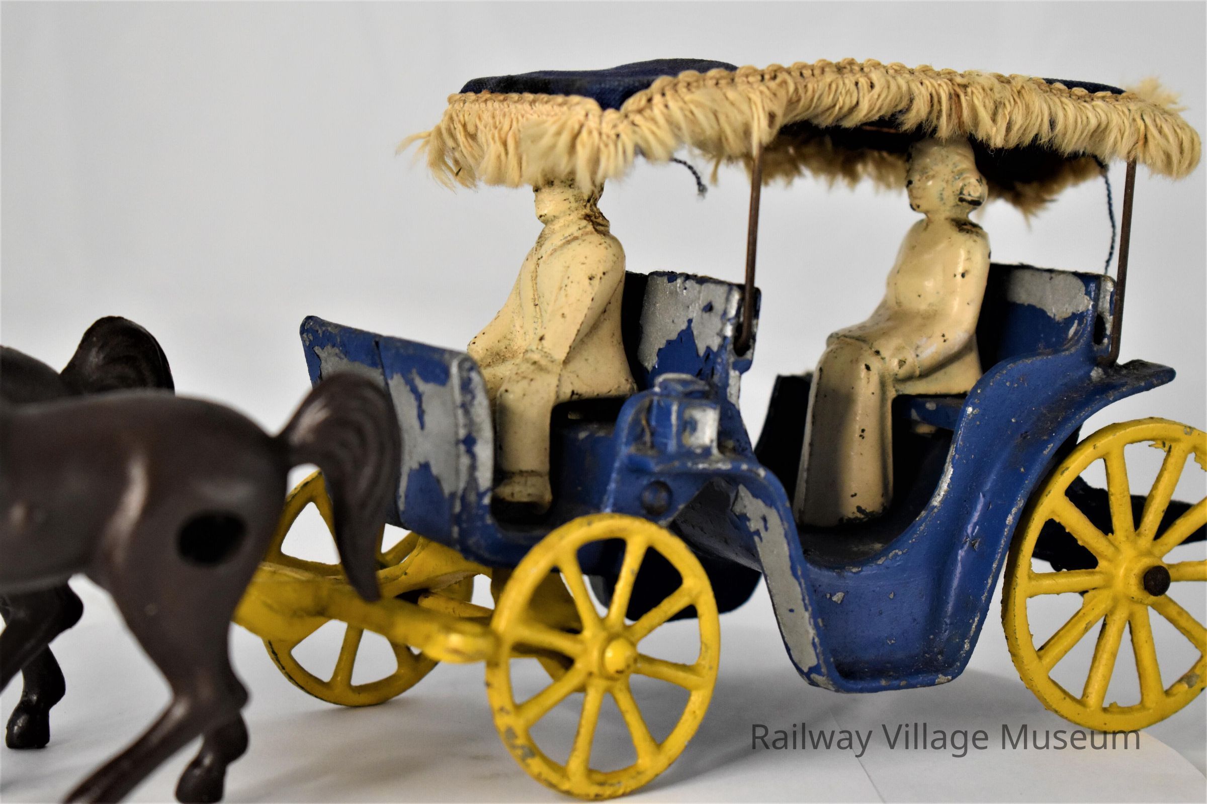 Cast iron horse drawn carriage or 'Surrey' with driver and female passenger.