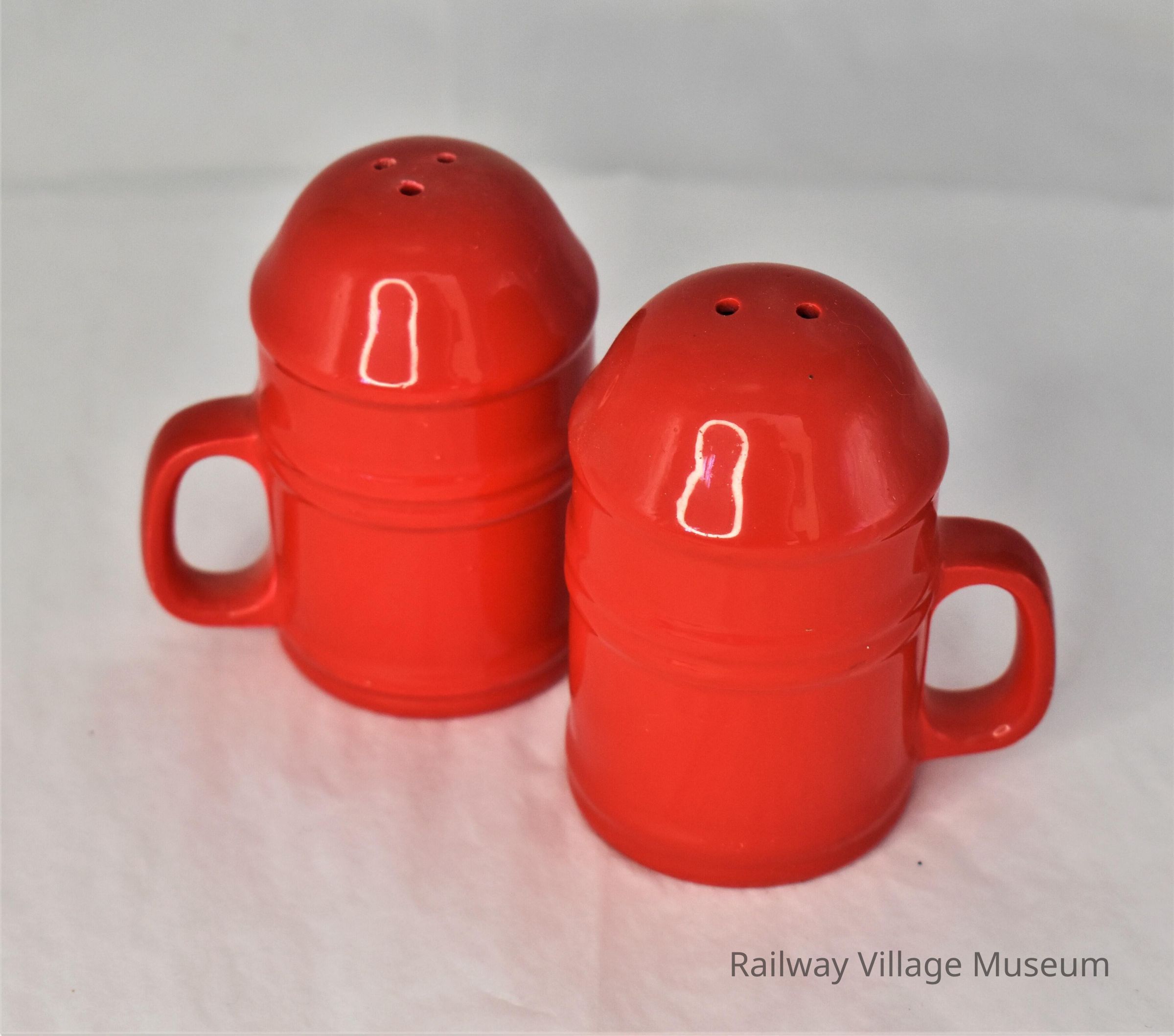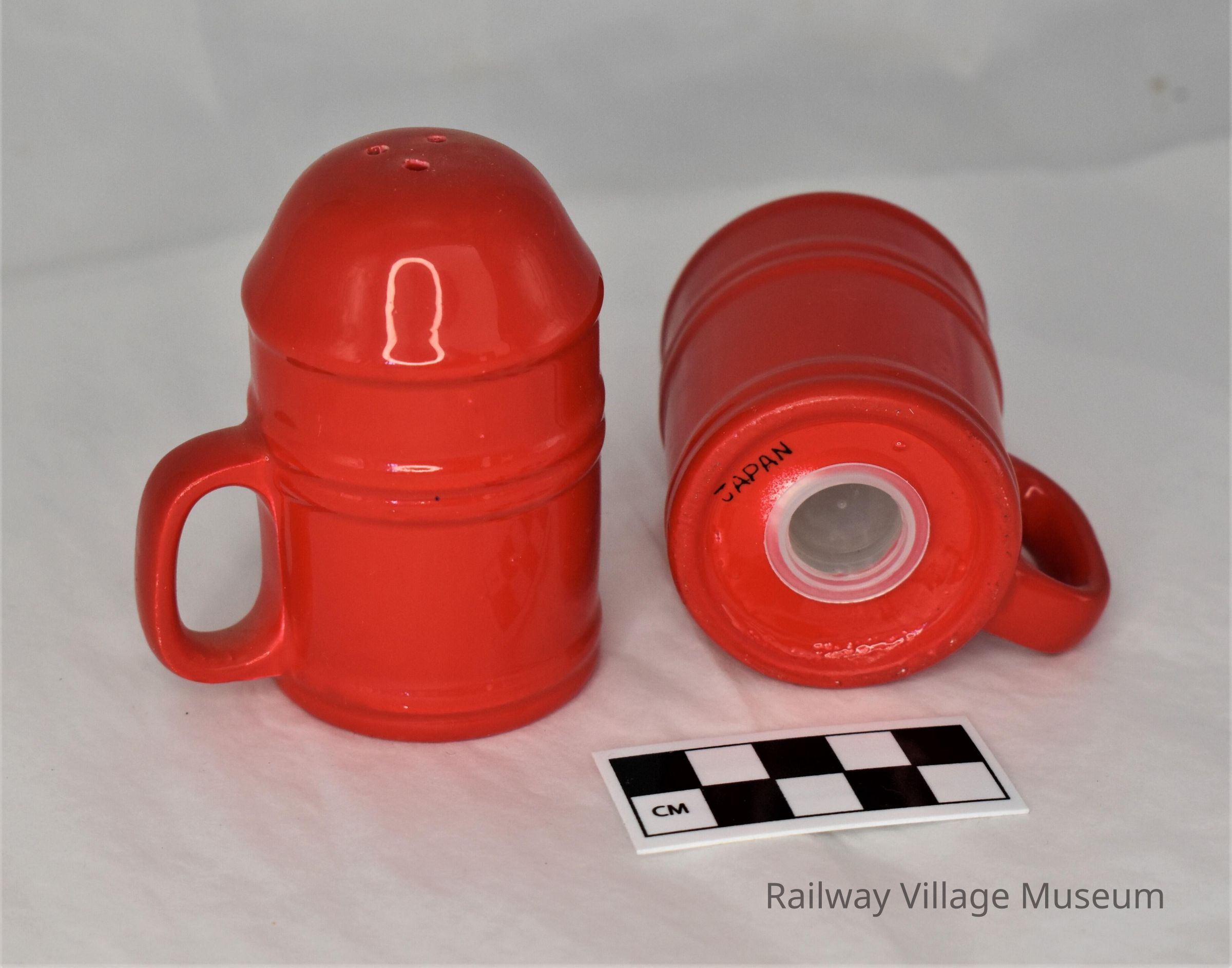 Red ceramic salt and pepper shakers in the shape of canisters or thermoses. Made in Japan. Plastic stoppers intact.
